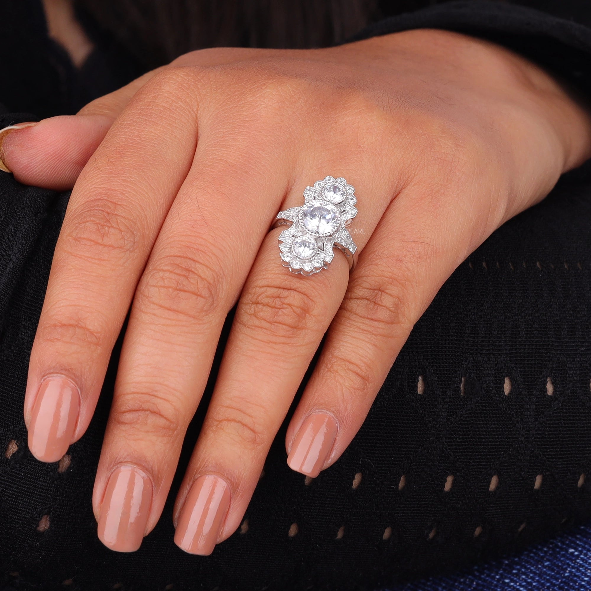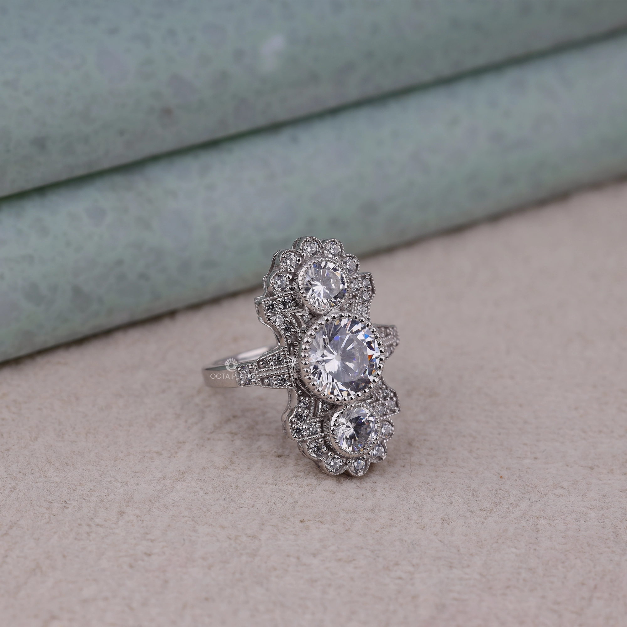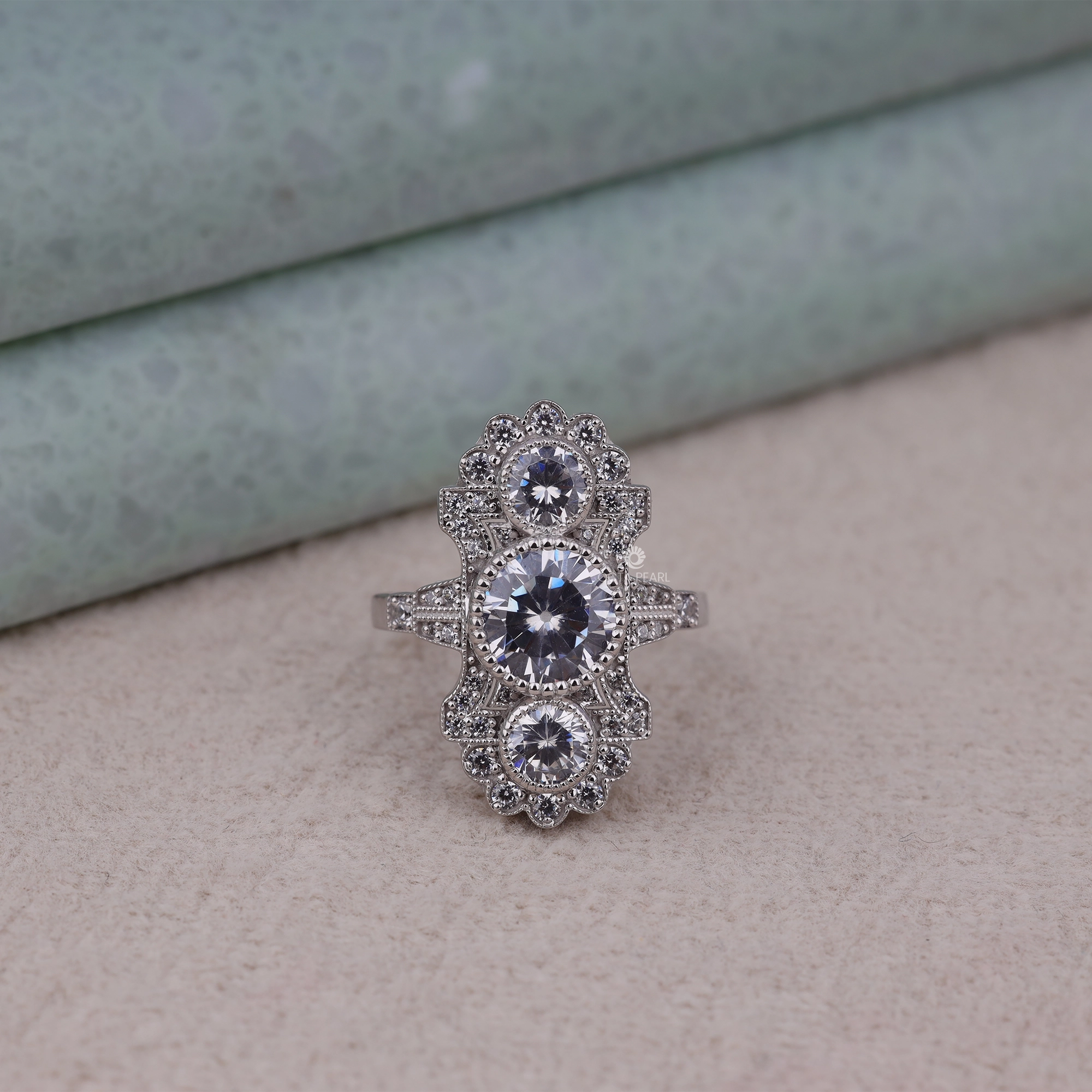 Channel vintage glamour with this Moissanite Art Deco Three Stone Statement Ring, featuring three dazzling round moissanites in a detailed geometric silver setting with milgrain beading and delicate accent stones. Inspired by classic 1920s designs, this bold cocktail ring offers ethical sparkle, hypoallergenic comfort, and extraordinary brilliance for special events or standout daily wear. Top pick for US buyers who love heirloom-inspired luxury—ideal for right-hand rings, gifting, or anniversaries.