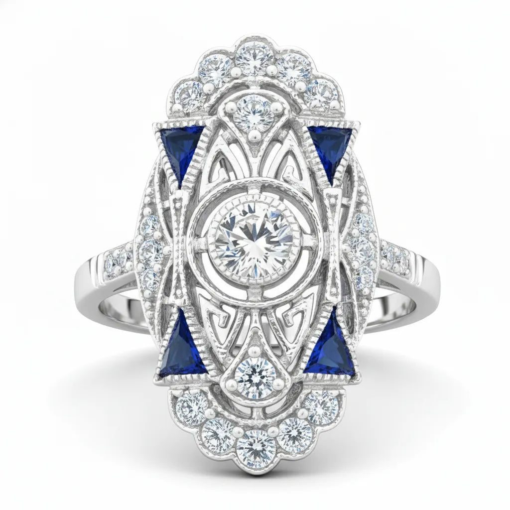 The Round with Blue Sapphire Triangle Milgrain Bezel Set Art Deco Vintage Work Ring is a stunning piece that exudes vintage charm and modern elegance. Featuring a round center stone surrounded by vibrant blue sapphires and set in a triangle bezel, this ring showcases intricate milgrain detailing, enhancing its Art Deco-inspired design. The vintage work of this ring, with its precise craftsmanship and bold styling, makes it the perfect choice for those who appreciate unique and timeless pieces. Whether for an engagement, wedding, or as a statement accessory, this ring offers sophistication and timeless beauty.