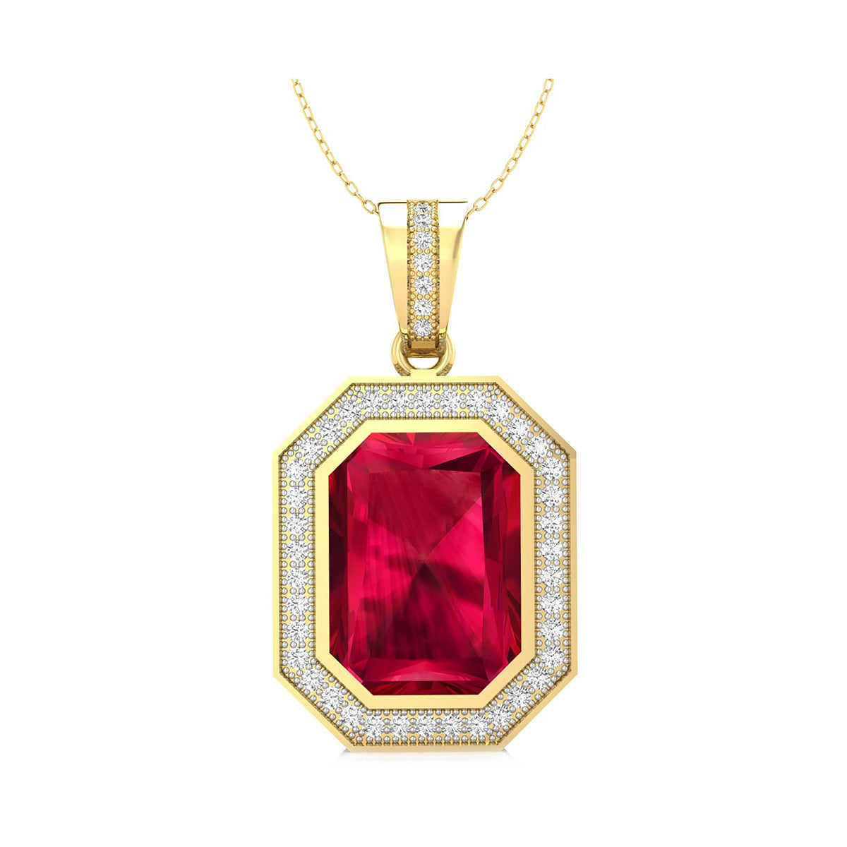This Red Radiant Cut CZ Stone Bezel Set Migraine Halo Party Wear Pendant (16 1/4 TCW) is designed to make a bold statement at any party wear event. The centerpiece of the pendant is a stunning red radiant cut CZ stone, surrounded by a sleek bezel setting that enhances its brilliance. The migraine halo design adds an extra layer of sparkle, creating a captivating contrast between the red stone and the surrounding CZ stones. With a total carat weight of 16 1/4 TCW, this pendant will turn heads and elevate your look. Perfect for those who love dramatic and eye-catching jewelry, this pendant makes the ideal addition to your party jewelry collection.