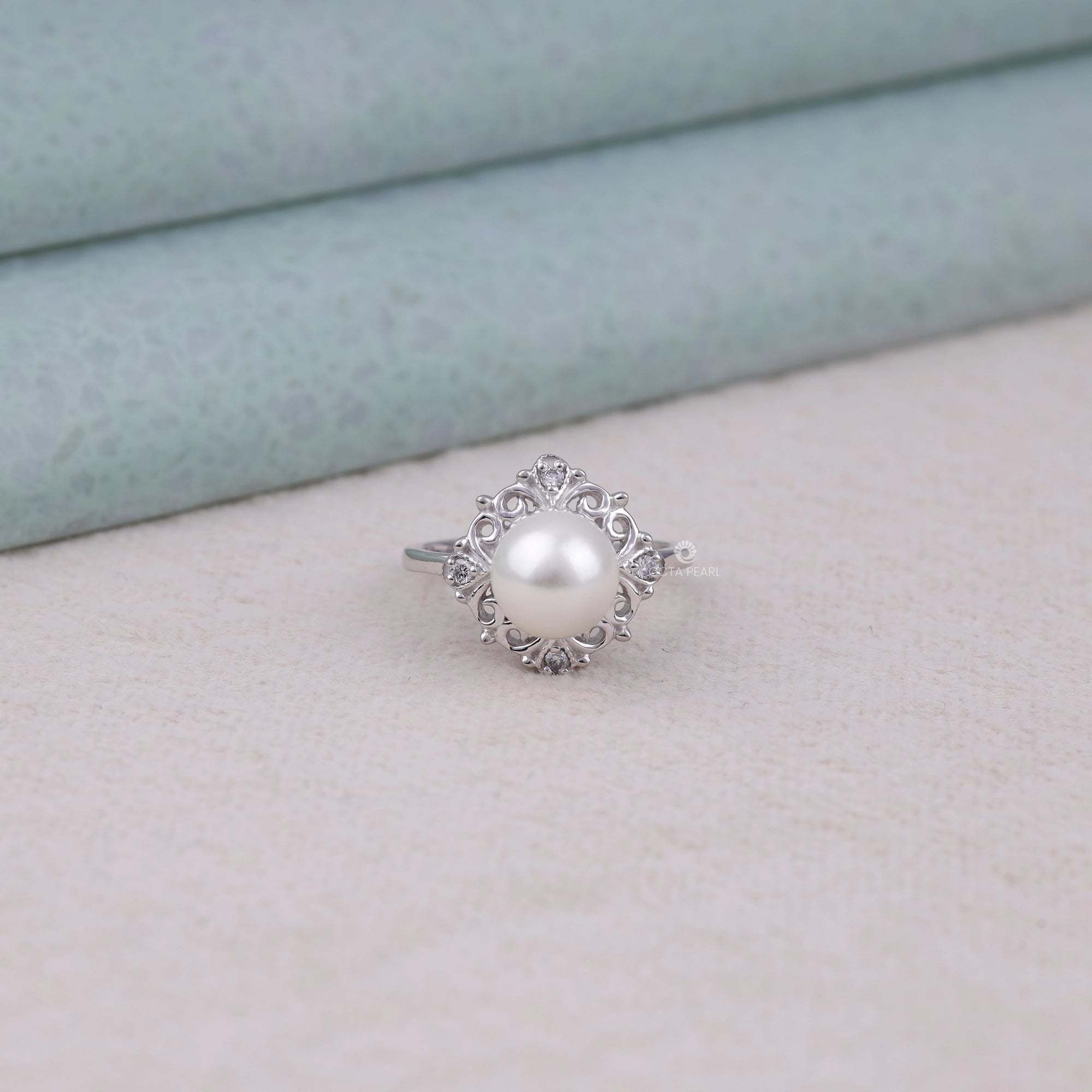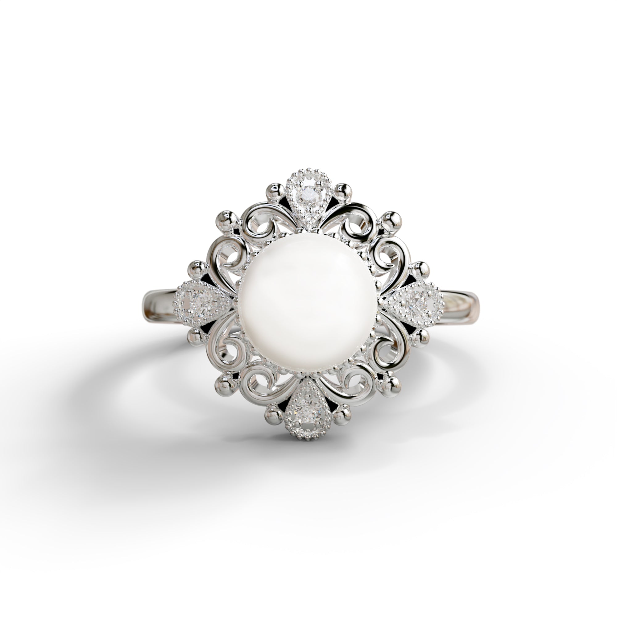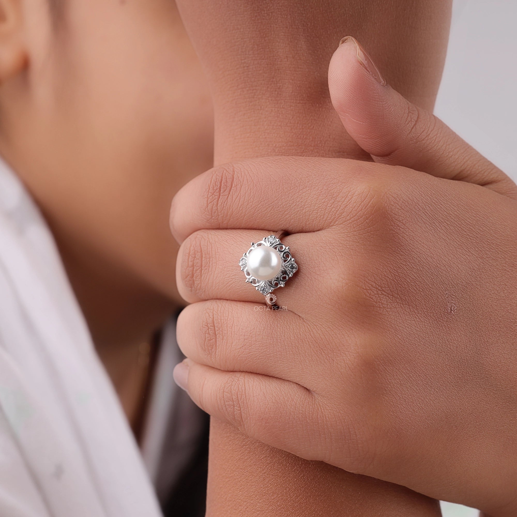 The Freshwater Pearl with Round CZ Stone Filigree Work Wedding Proposal Ring is a sophisticated and elegant choice for an unforgettable proposal. Featuring a lustrous freshwater pearl at its center, the ring is accentuated by a sparkling round CZ stone on each side, creating a beautiful contrast. The intricate filigree work around the band adds vintage charm and delicate detailing, enhancing the overall beauty of the design. Perfect for a romantic wedding proposal, this ring combines classic elements with modern flair, making it an exceptional piece to symbolize a lifetime of love and commitment.