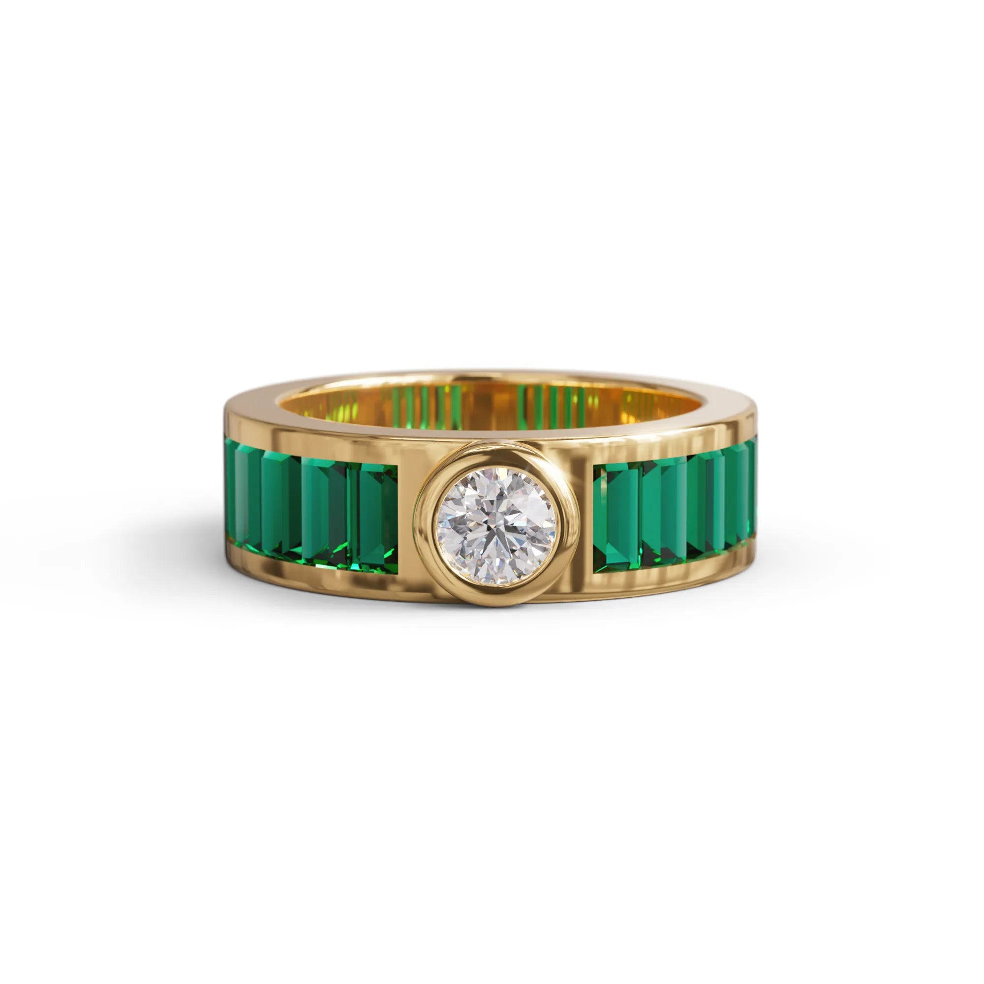 Stand out with this Emerald Baguette & CZ Gold Band, crafted with vibrant green baguette-cut stones flanking a bezel-set center CZ stone in glowing yellow gold. This unique modern cocktail ring blends geometric lines, bold color, and everyday luxury-perfect for parties, gifting, or fashion-forward stacking. Hypoallergenic and affordable, it's ideal for USA shoppers seeking designer-inspired statement jewelry without the fine jewelry price.