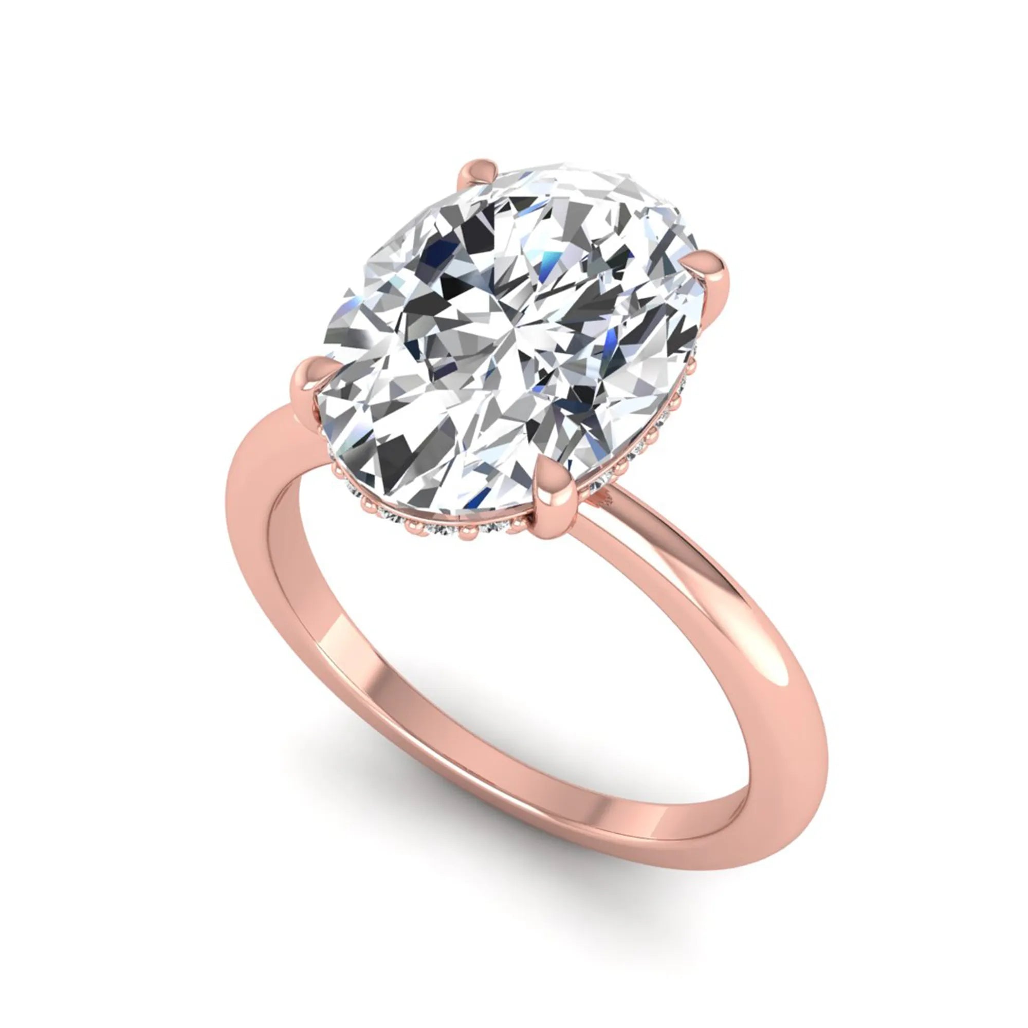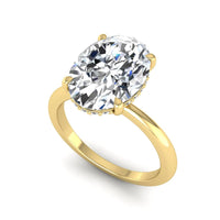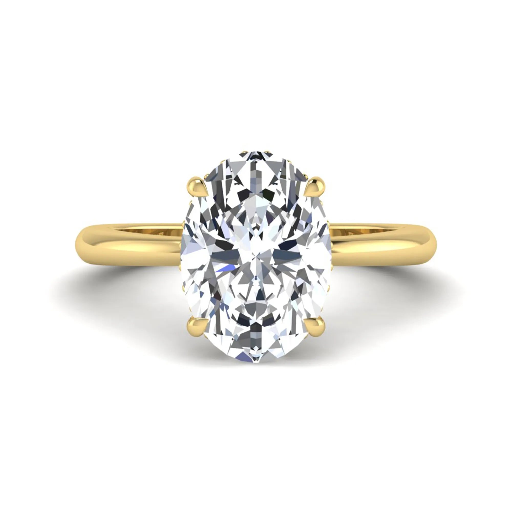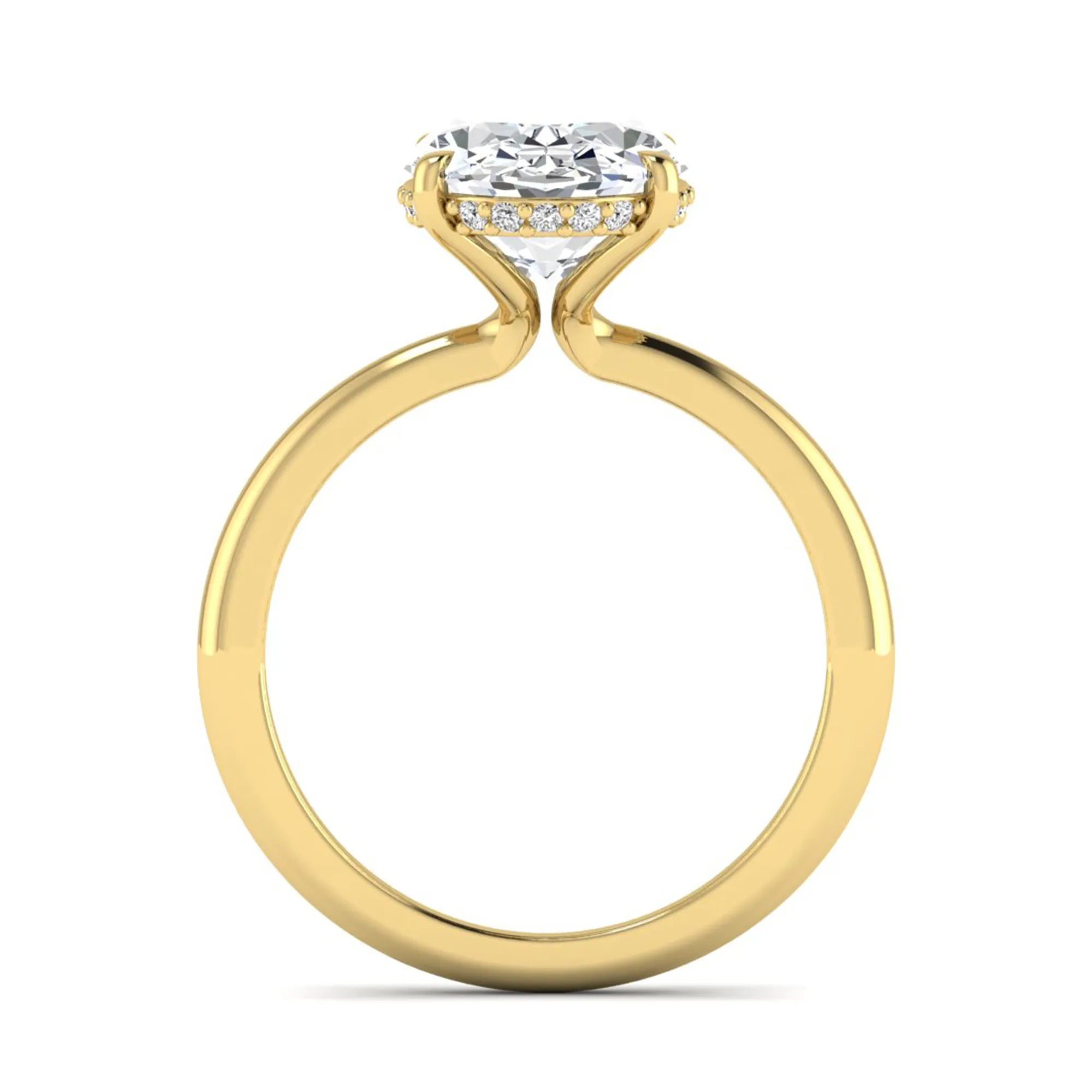 This hidden halo engagement ring showcases an impressive oval cut lab grown diamond elevated by a concealed halo of smaller accent diamonds beneath the center stone. The innovative hidden halo setting creates a stunning burst of brilliance visible from the side view while maintaining a clean, sophisticated profile from above. The warm yellow gold band features beautifully curved prongs that gracefully embrace the center diamond, creating an eye-catching silhouette that's both contemporary and timeless.