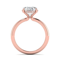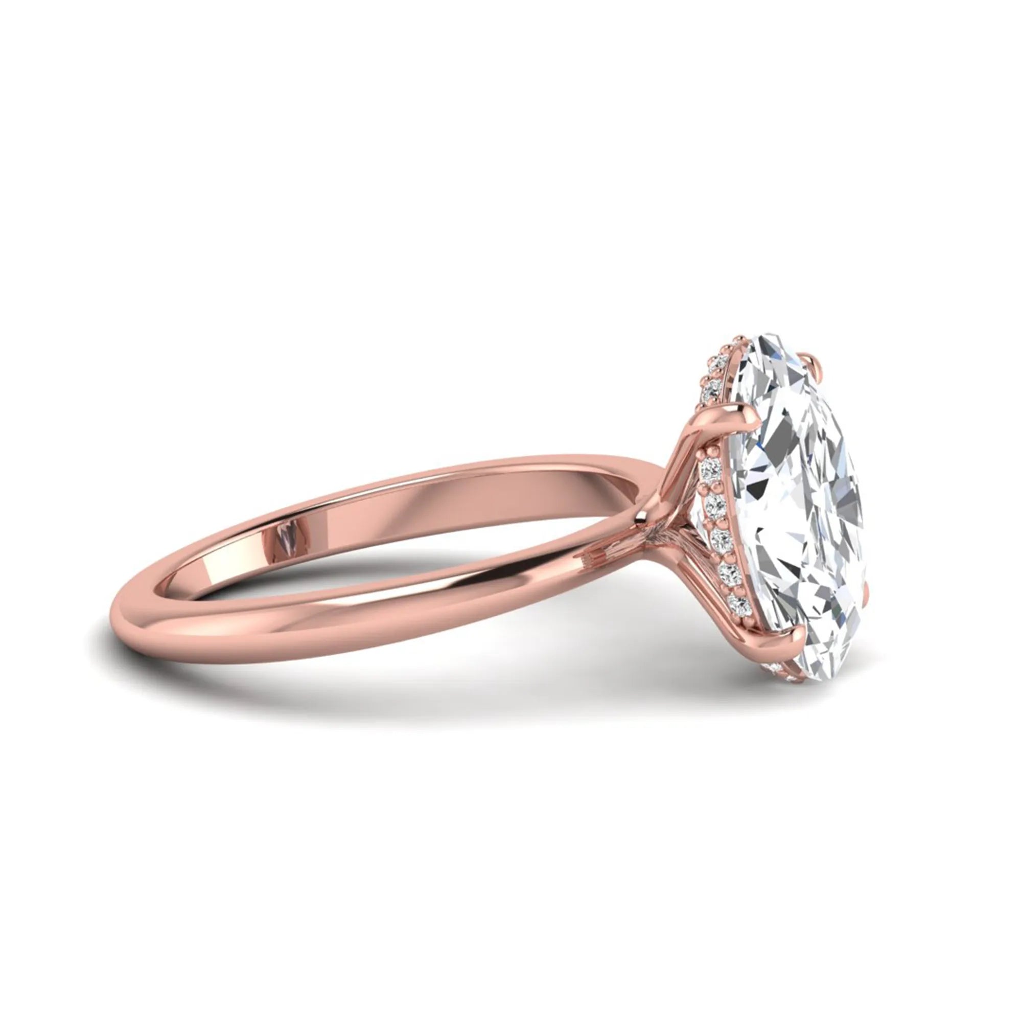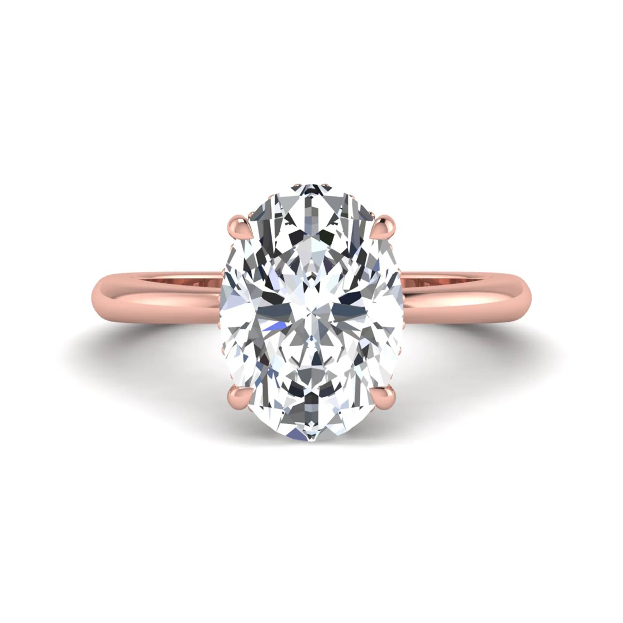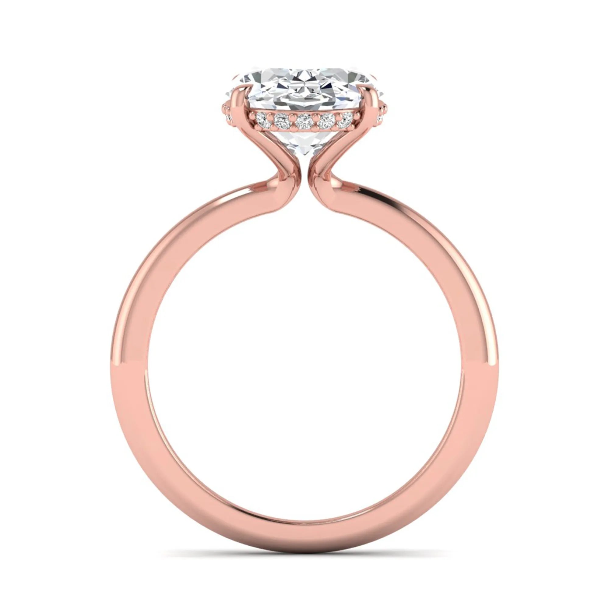 This hidden halo engagement ring showcases an impressive oval cut lab grown diamond elevated by a concealed halo of smaller accent diamonds beneath the center stone. The innovative hidden halo setting creates a stunning burst of brilliance visible from the side view while maintaining a clean, sophisticated profile from above. The warm yellow gold band features beautifully curved prongs that gracefully embrace the center diamond, creating an eye-catching silhouette that's both contemporary and timeless.