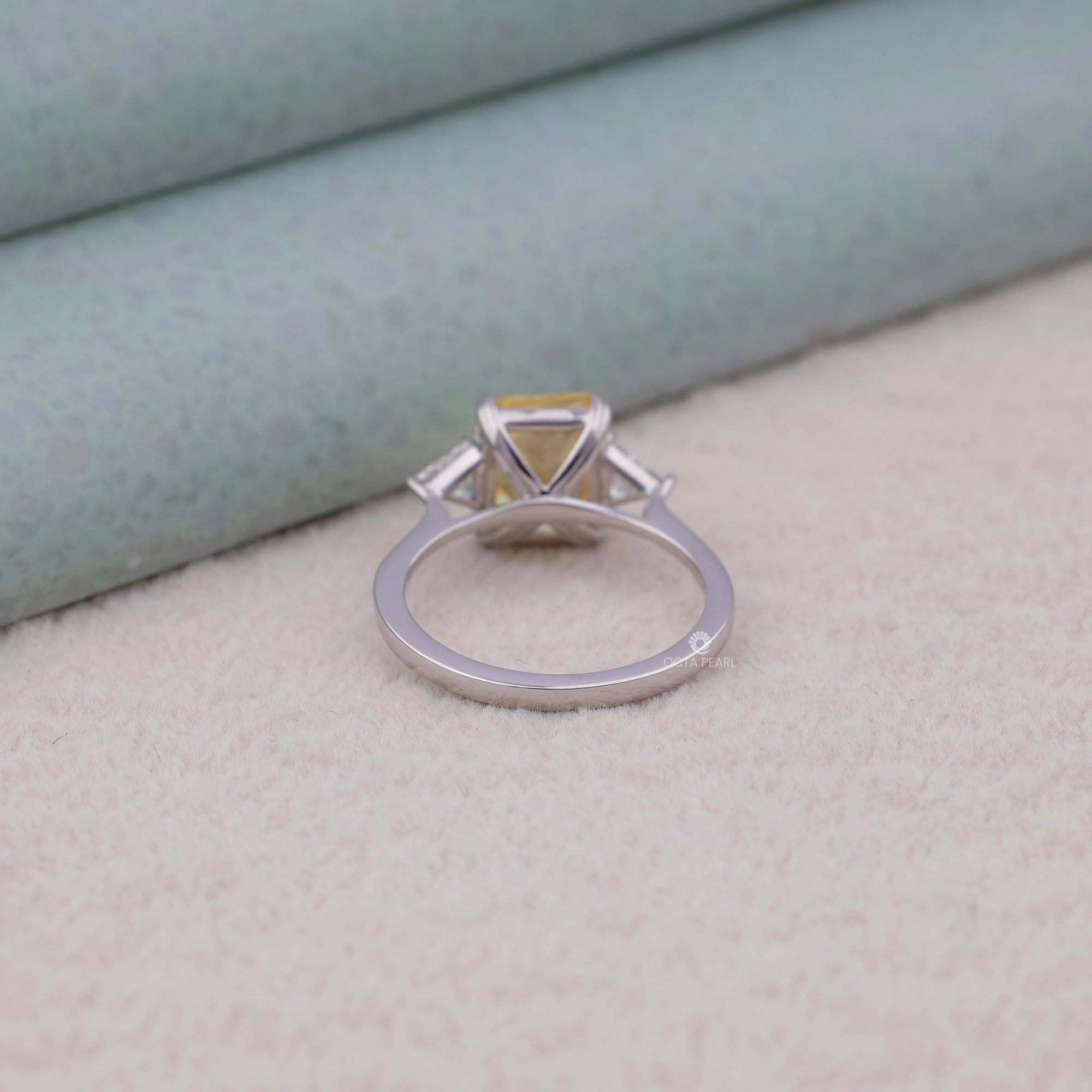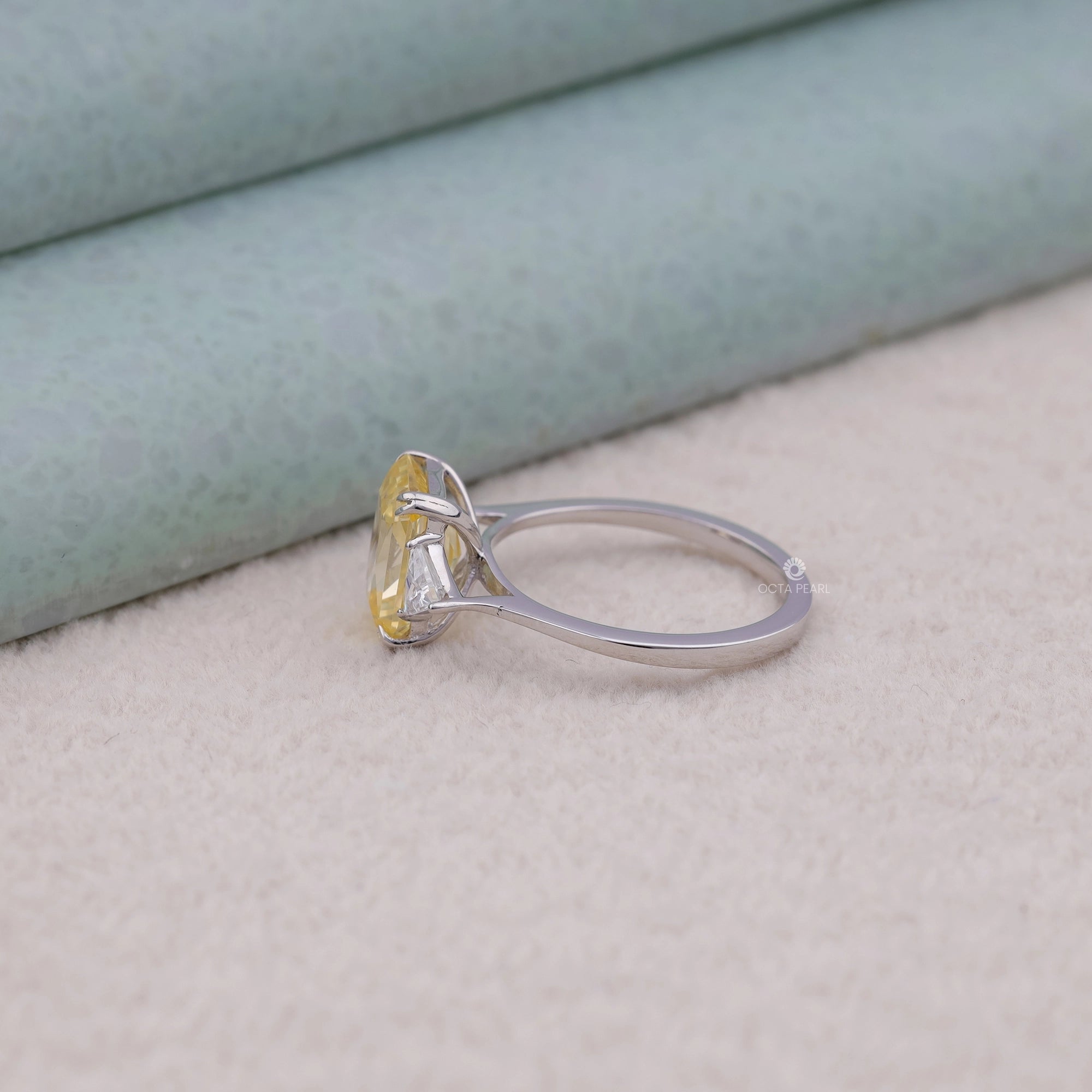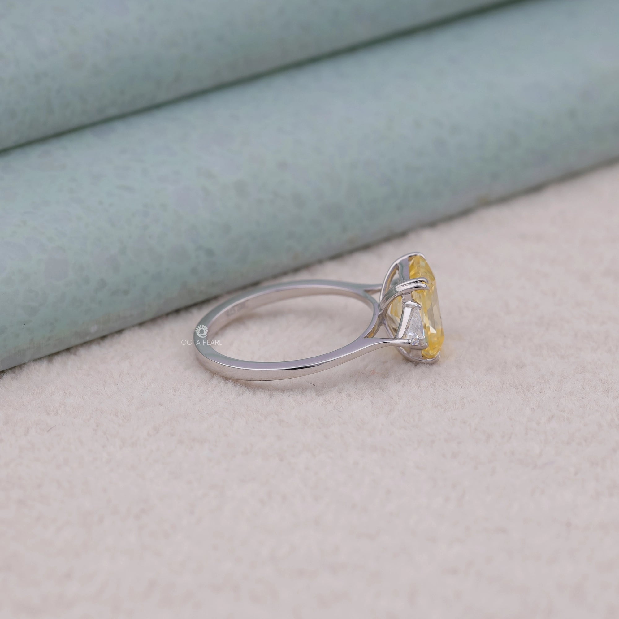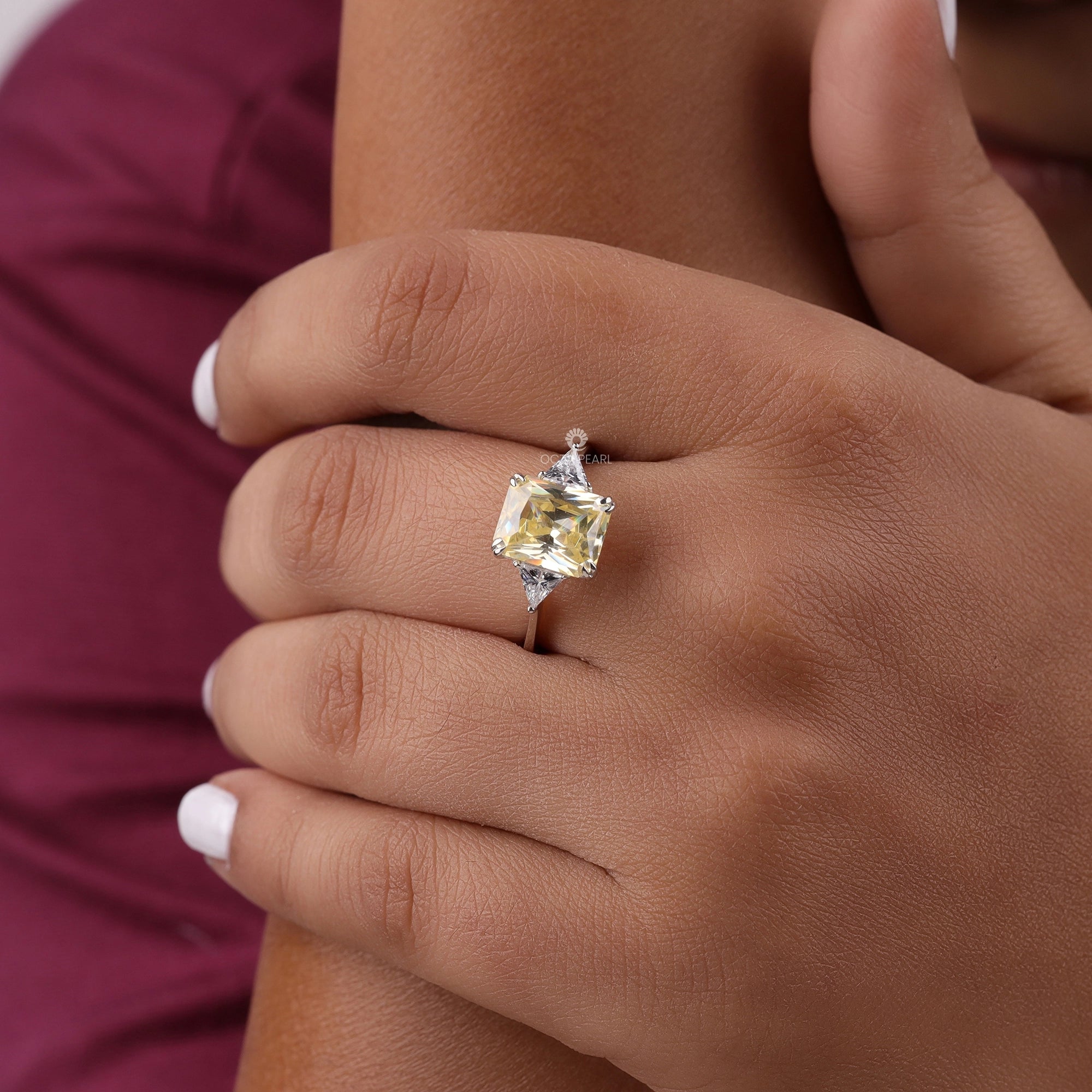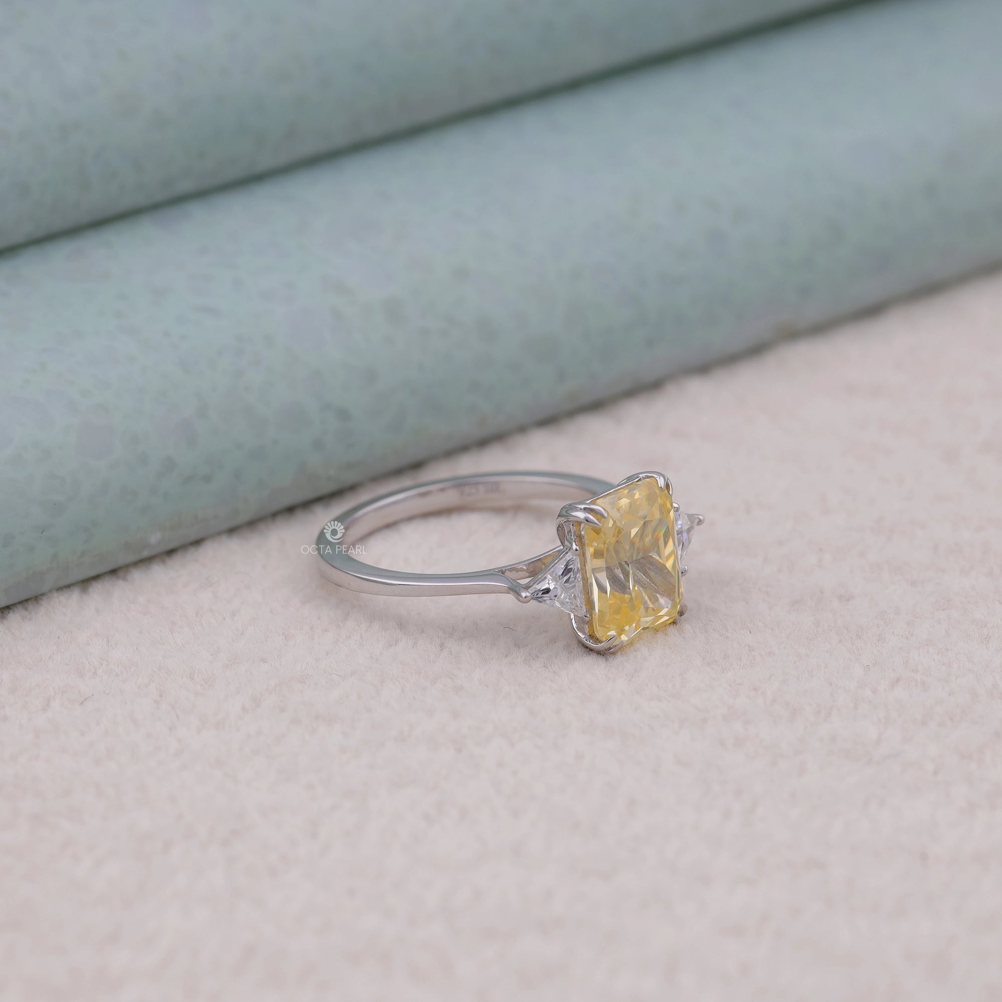 Make a bold statement with this Yellow Radiant & White Triangle CZ Gemstone Three Stone Ring. Centered with a vibrant yellow radiant cut CZ gemstone, flanked by shimmering white triangle CZ stones, this elegant ring exudes color, sparkle, and sophistication. The three-stone setting symbolizes your past, present, and future, making it a meaningful choice for engagements, anniversaries, or fashion-forward wear. With its unique combination of shapes and hues, this CZ gemstone ring blends classic elegance with modern flair.