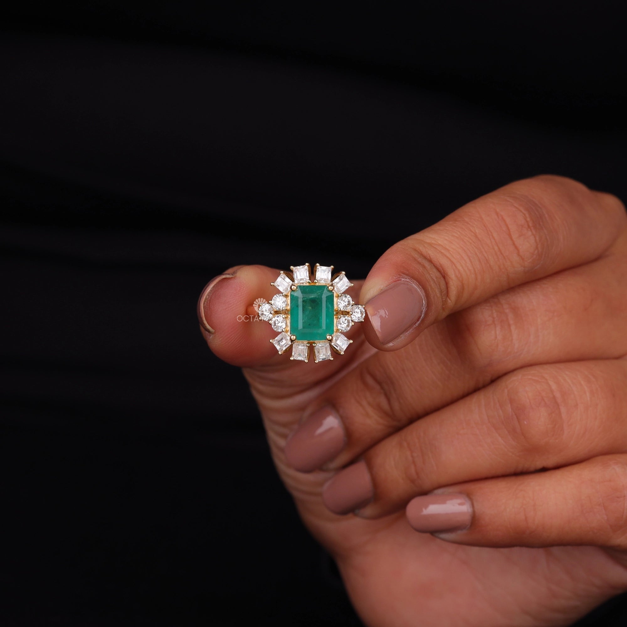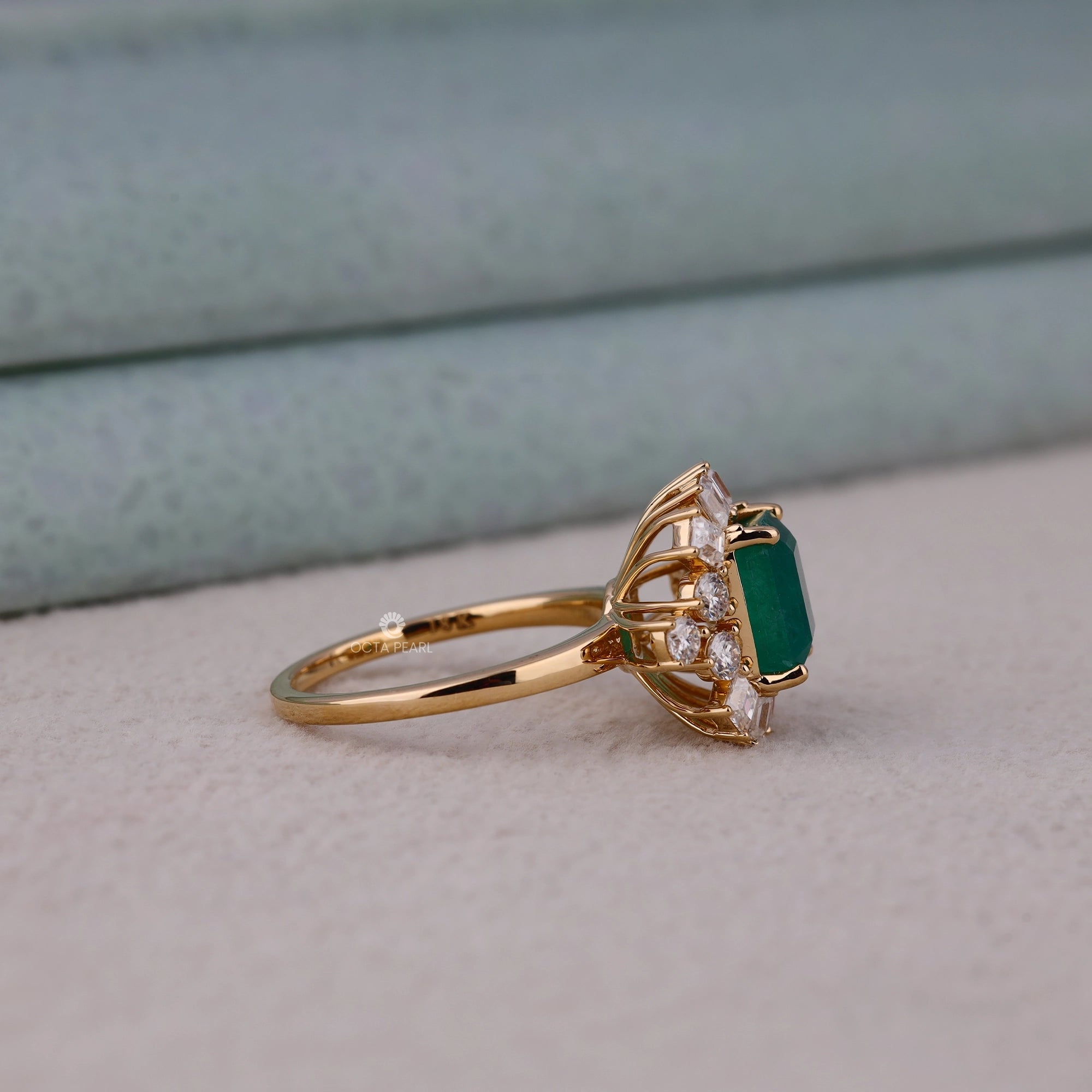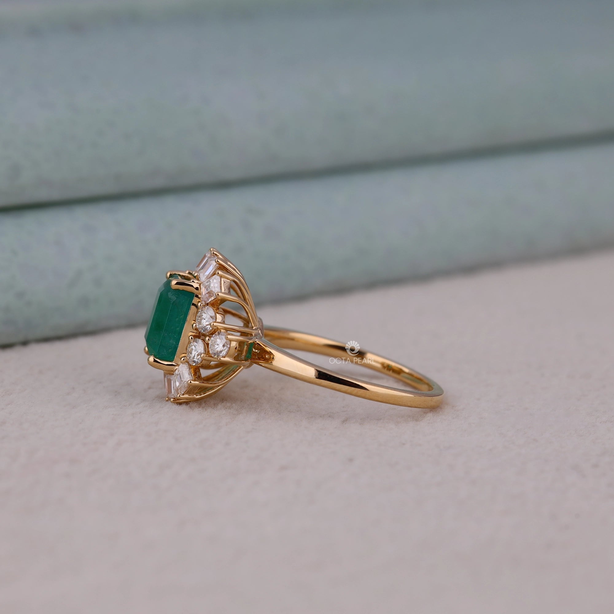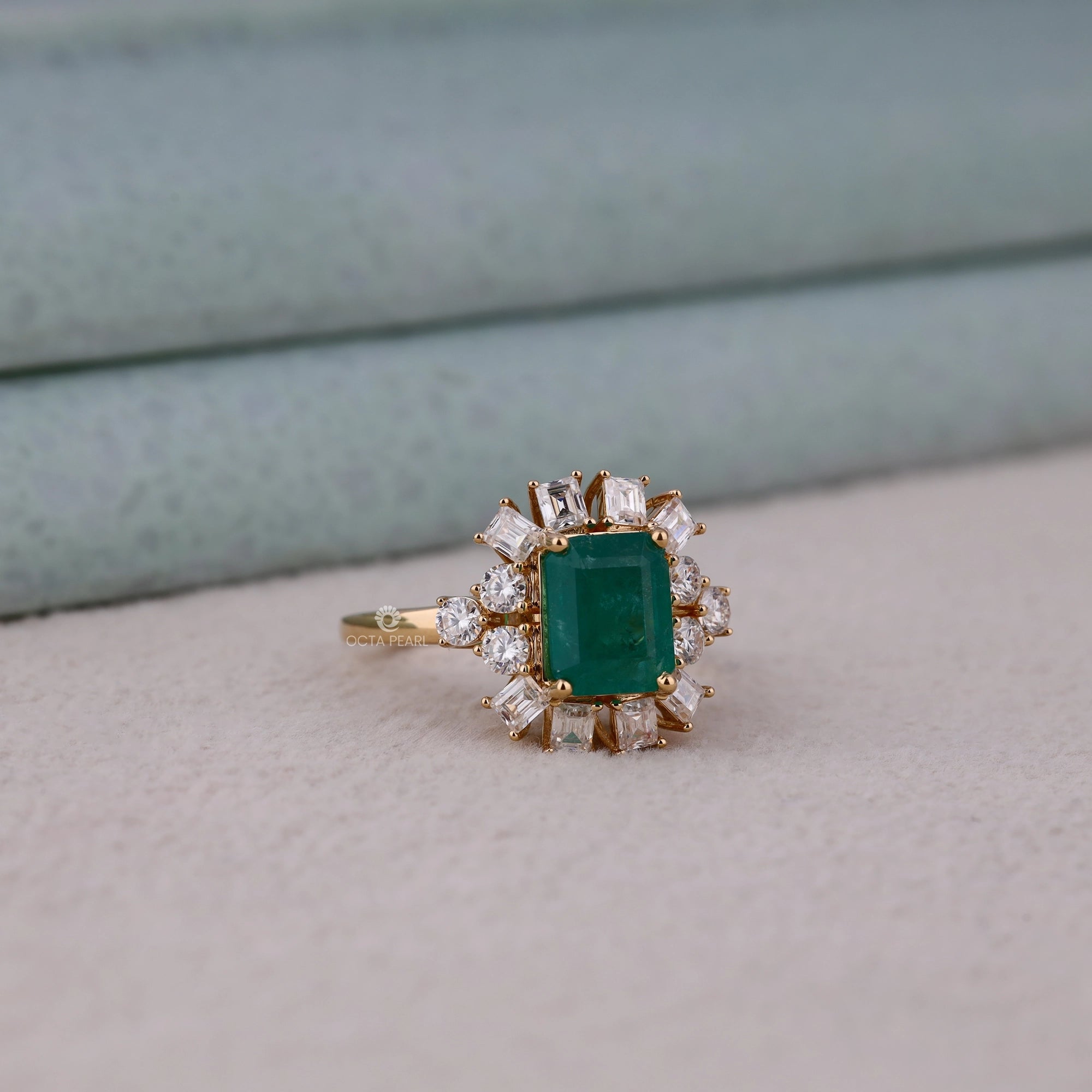 Turn heads with this Emerald & Diamond Halo Ring, featuring a vivid rectangular emerald center surrounded by alternating round and baguette diamonds in a bold Art Deco design. Meticulously set in rich yellow gold, this cocktail statement ring is crafted for comfort, durability, and exceptional presence—perfect for parties, weddings, or everyday glamour. This ethical luxury ring is a top pick for USA jewelry enthusiasts seeking show-stopping gemstone style and vintage inspiration.
