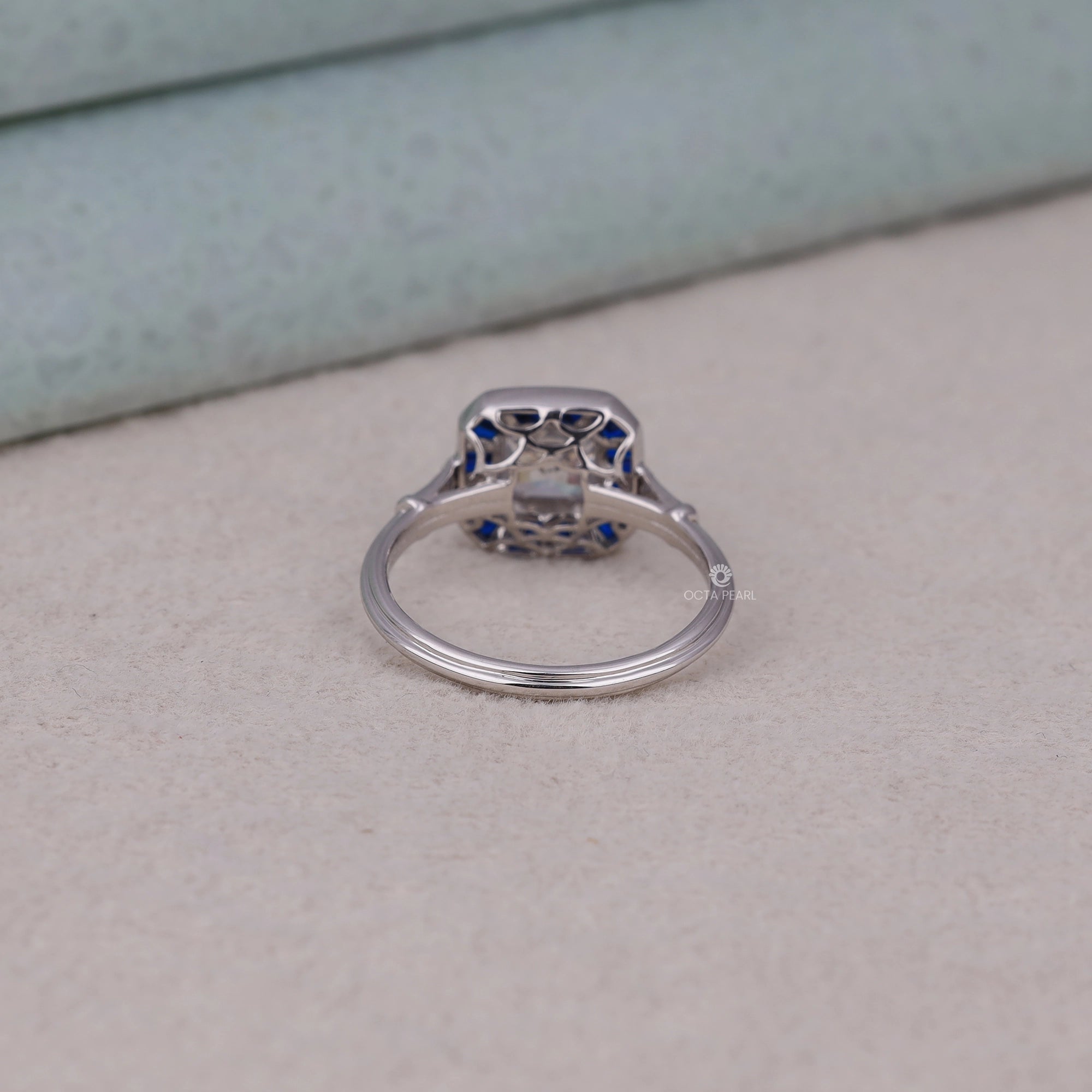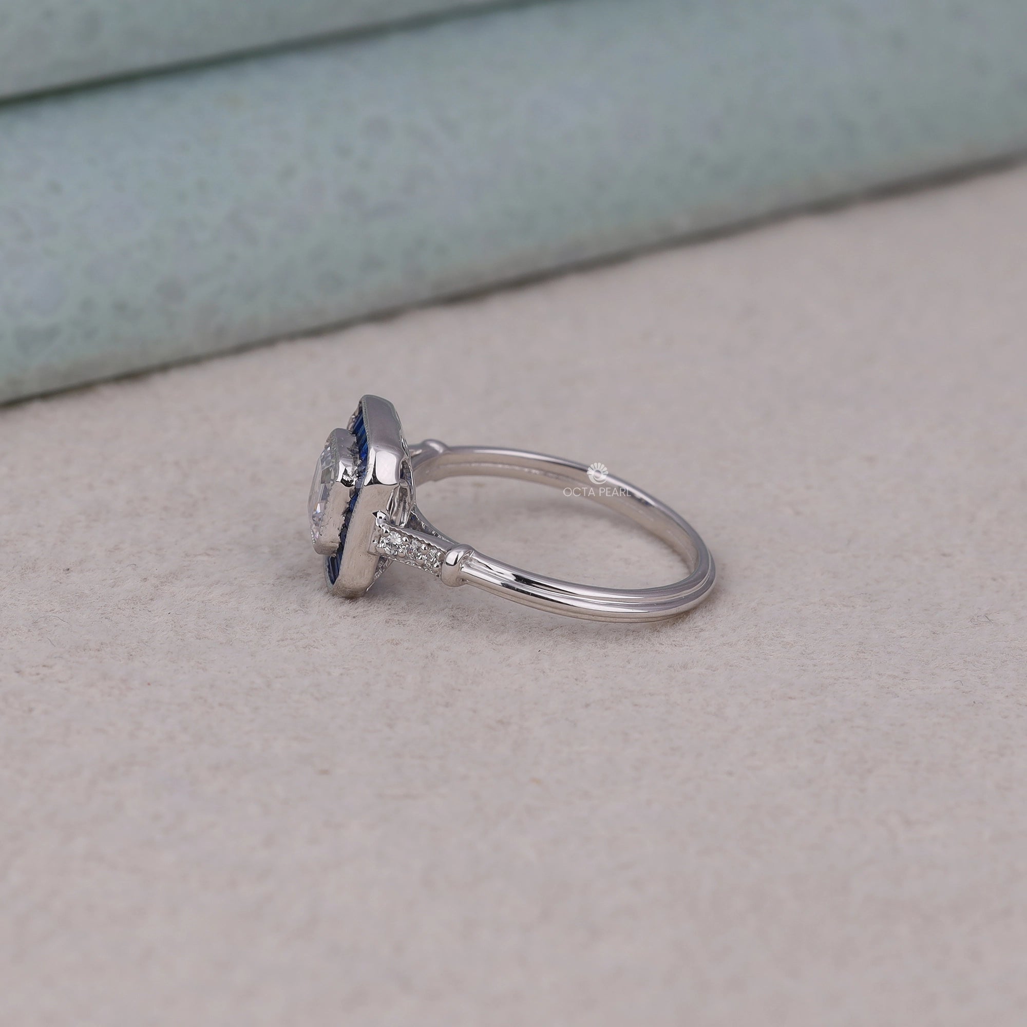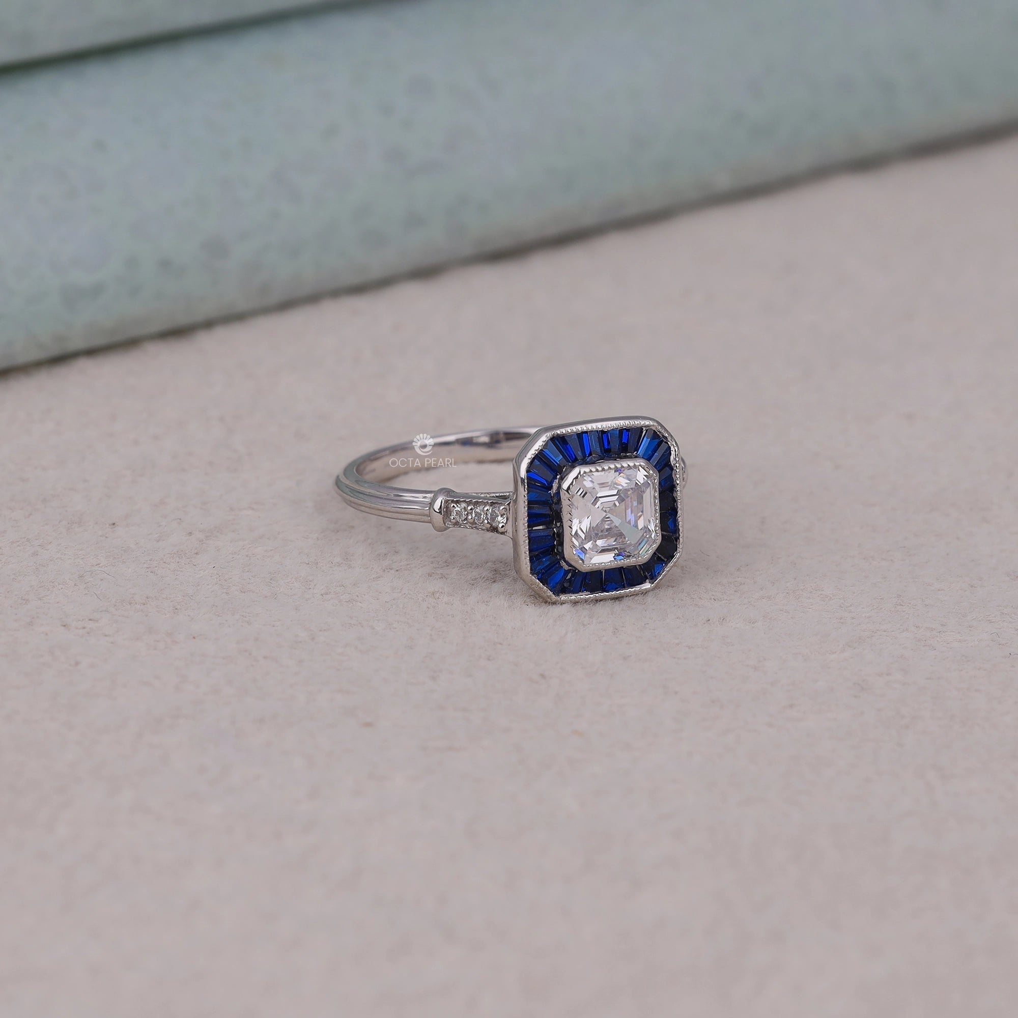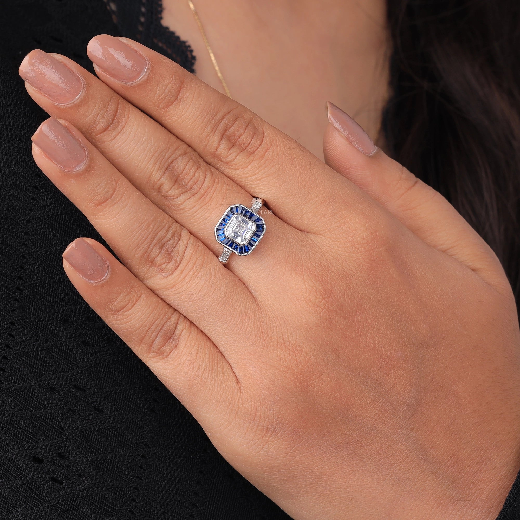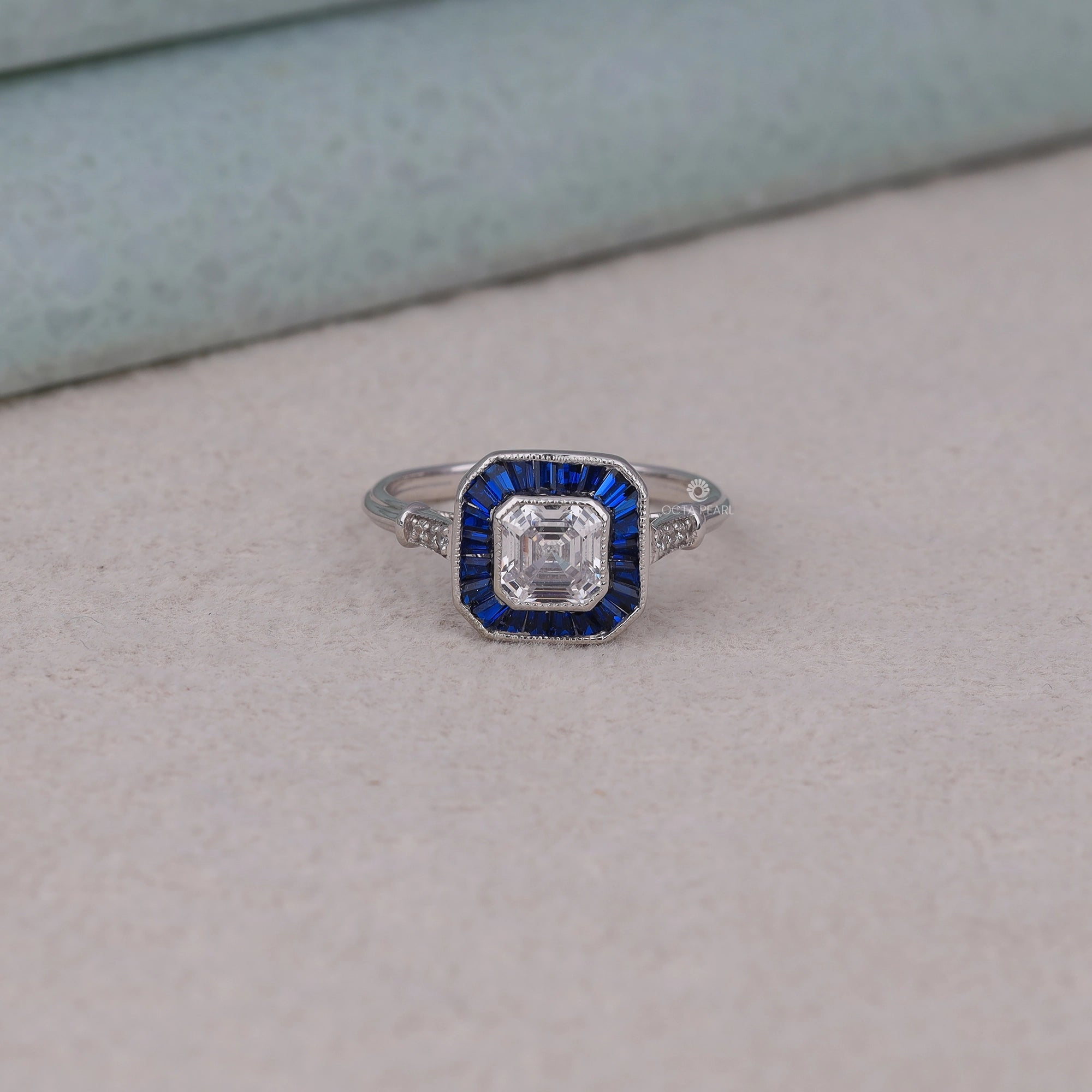This Asscher with Blue Sapphire Baguette Art Deco Wedding Ring features a dazzling Asscher-cut center stone, accented with baguette-cut blue sapphires in a milgrain bezel setting. Inspired by Art Deco elegance, this target-style ring is perfect for a unique and timeless wedding look.