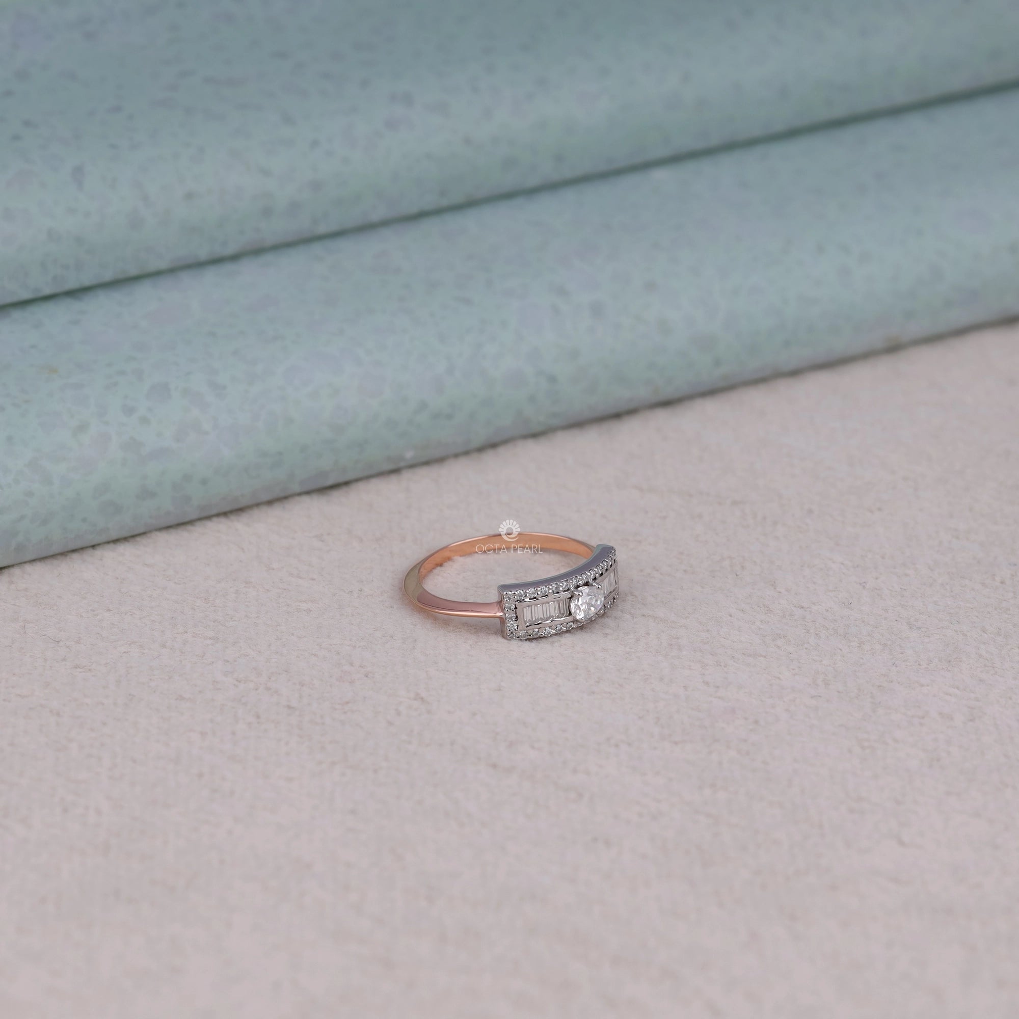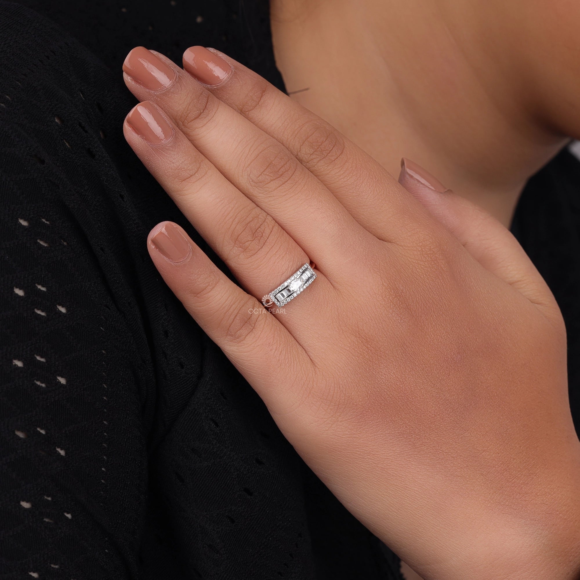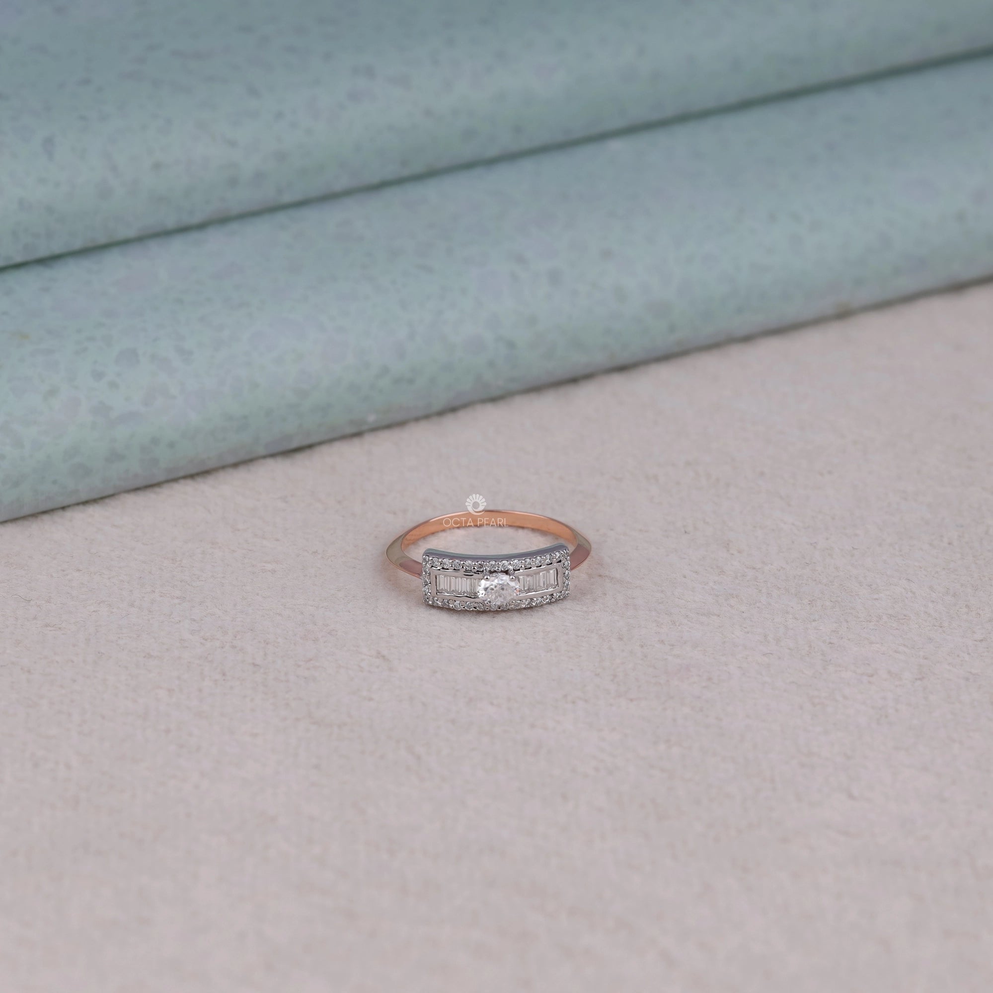 Embrace contemporary elegance with this Baguette With East West Oval Moissanite Knife Edge Engagement Ring. Featuring a dazzling oval-cut moissanite set in a bold east-west orientation, this ring is accented by sleek baguette-cut side stones for a modern, geometric look. The refined knife-edge band adds a minimalist touch, perfect for those who appreciate clean lines and timeless sparkle. Crafted with brilliance and ethically sourced stones, this moissanite engagement ring is an exceptional choice for modern brides who want bold style and ethical beauty.