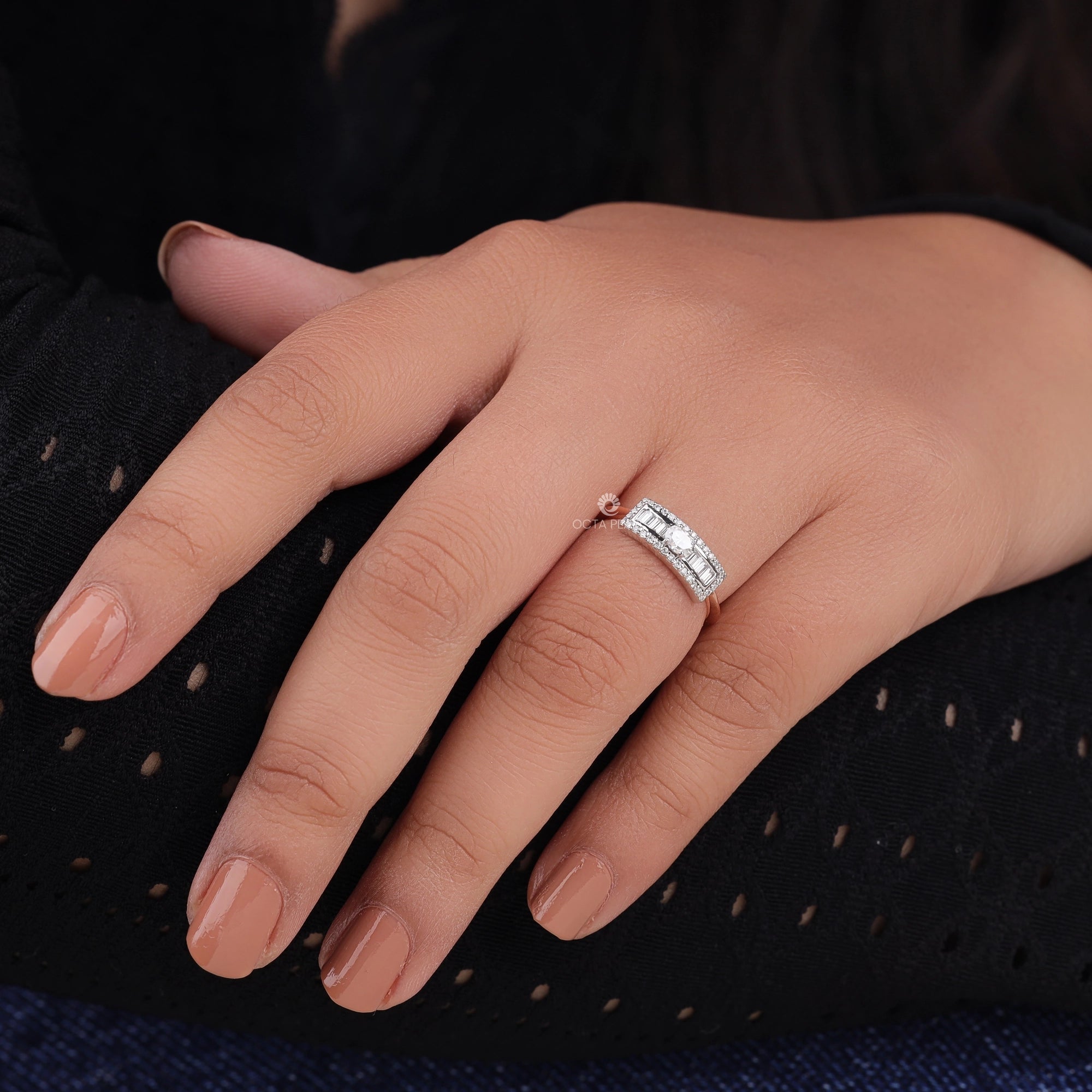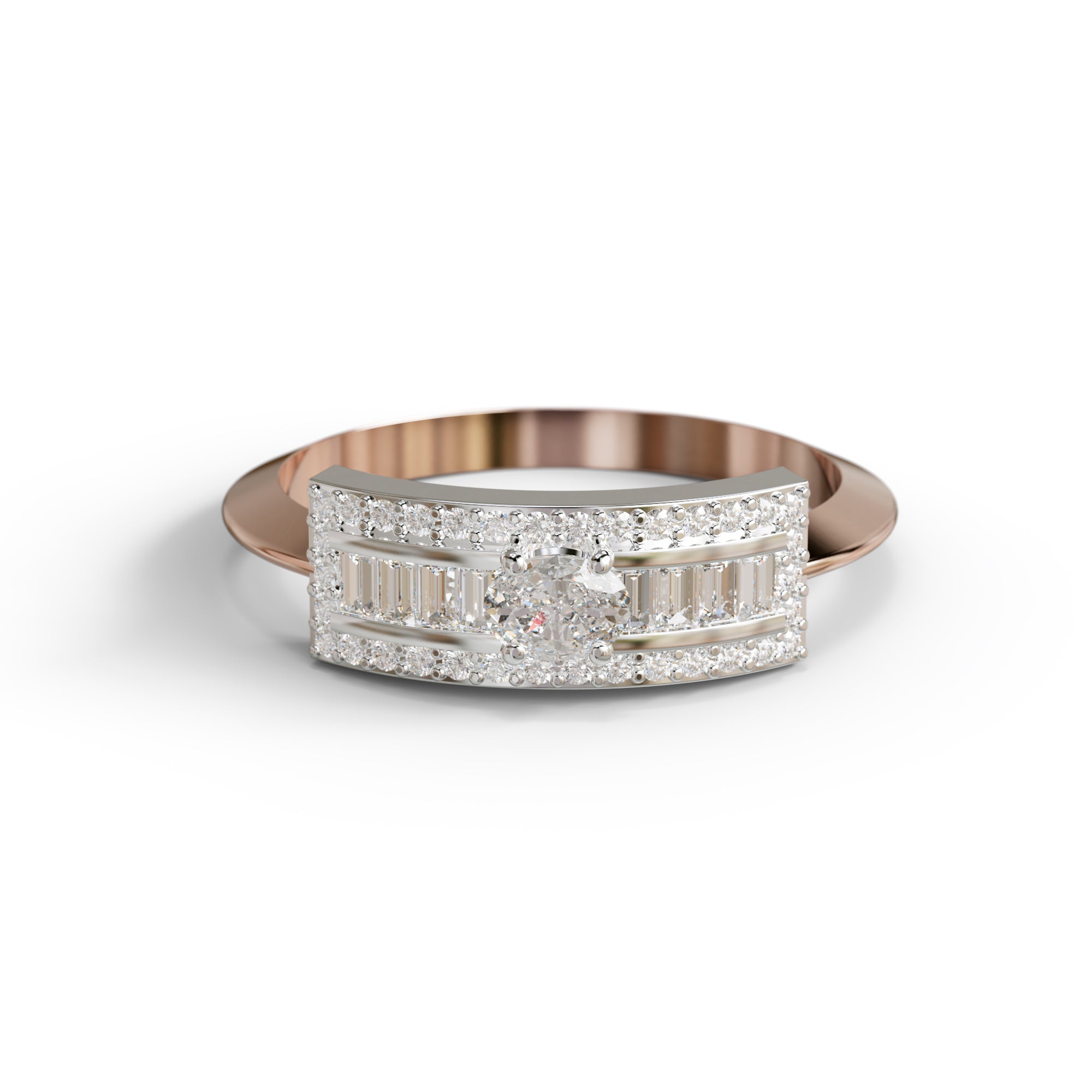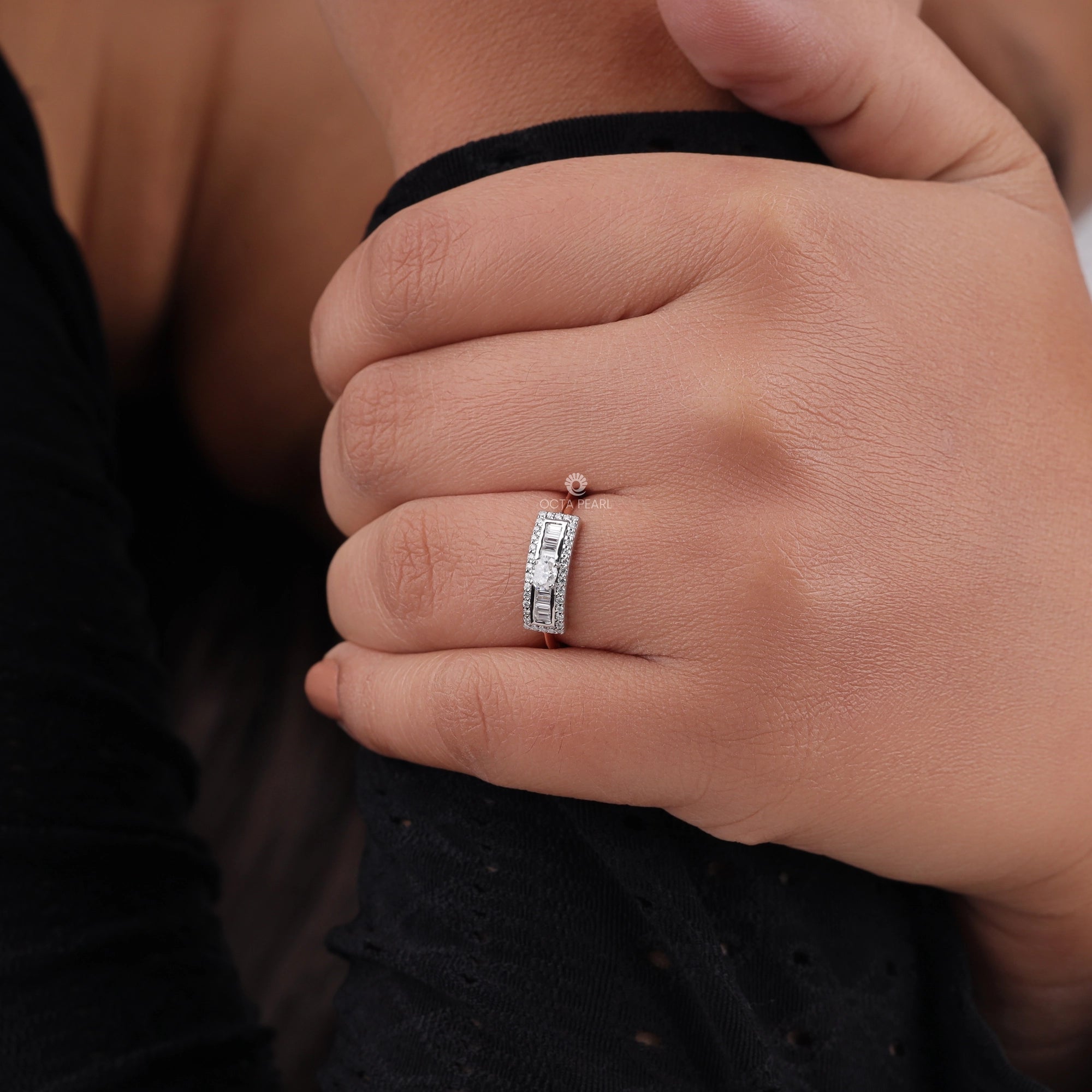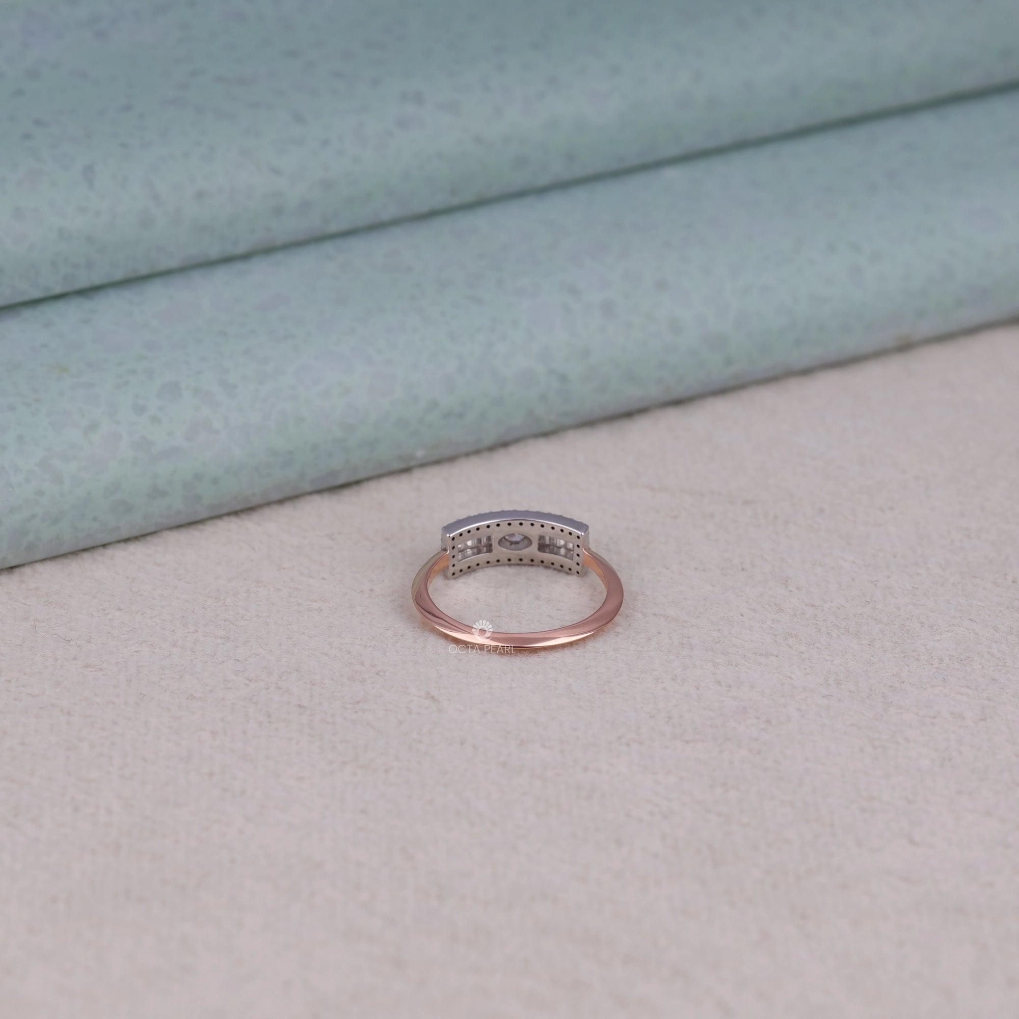 Embrace contemporary elegance with this Baguette With East West Oval Moissanite Knife Edge Engagement Ring. Featuring a dazzling oval-cut moissanite set in a bold east-west orientation, this ring is accented by sleek baguette-cut side stones for a modern, geometric look. The refined knife-edge band adds a minimalist touch, perfect for those who appreciate clean lines and timeless sparkle. Crafted with brilliance and ethically sourced stones, this moissanite engagement ring is an exceptional choice for modern brides who want bold style and ethical beauty.