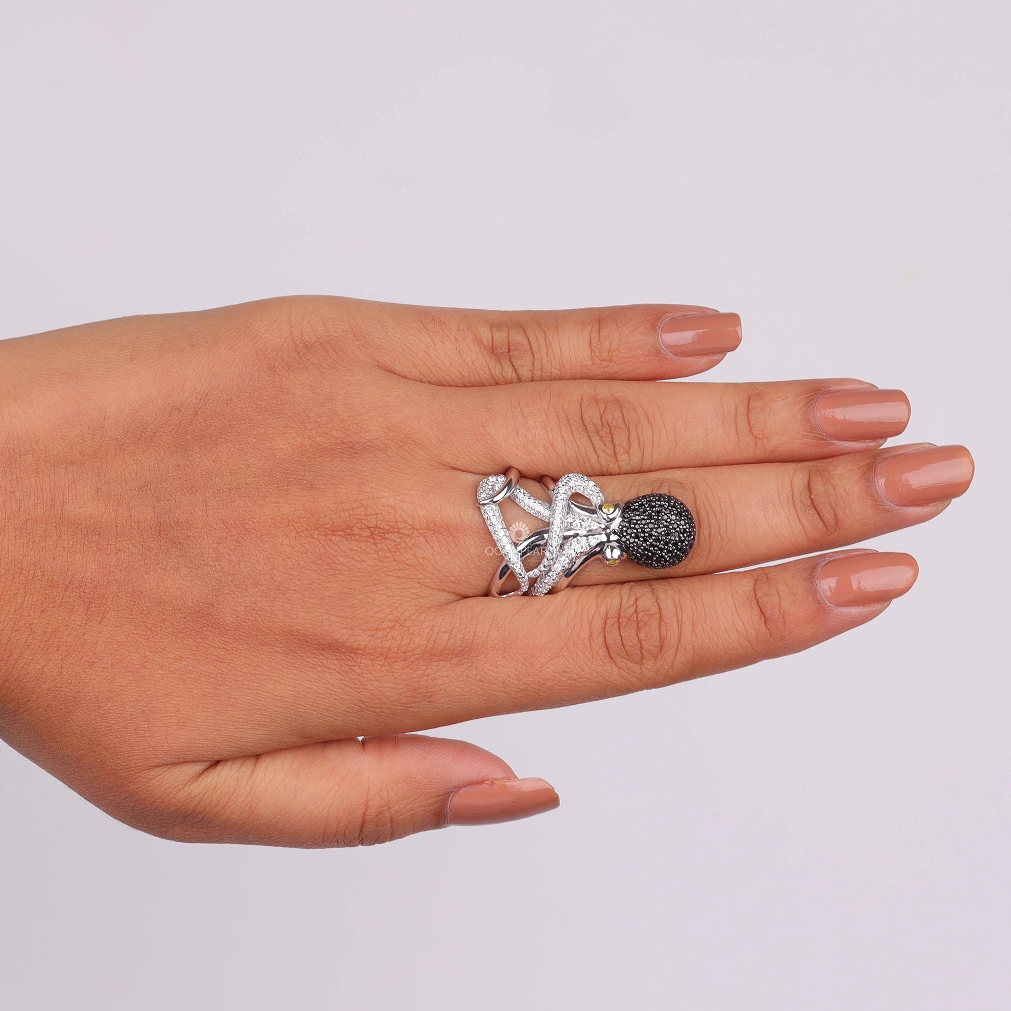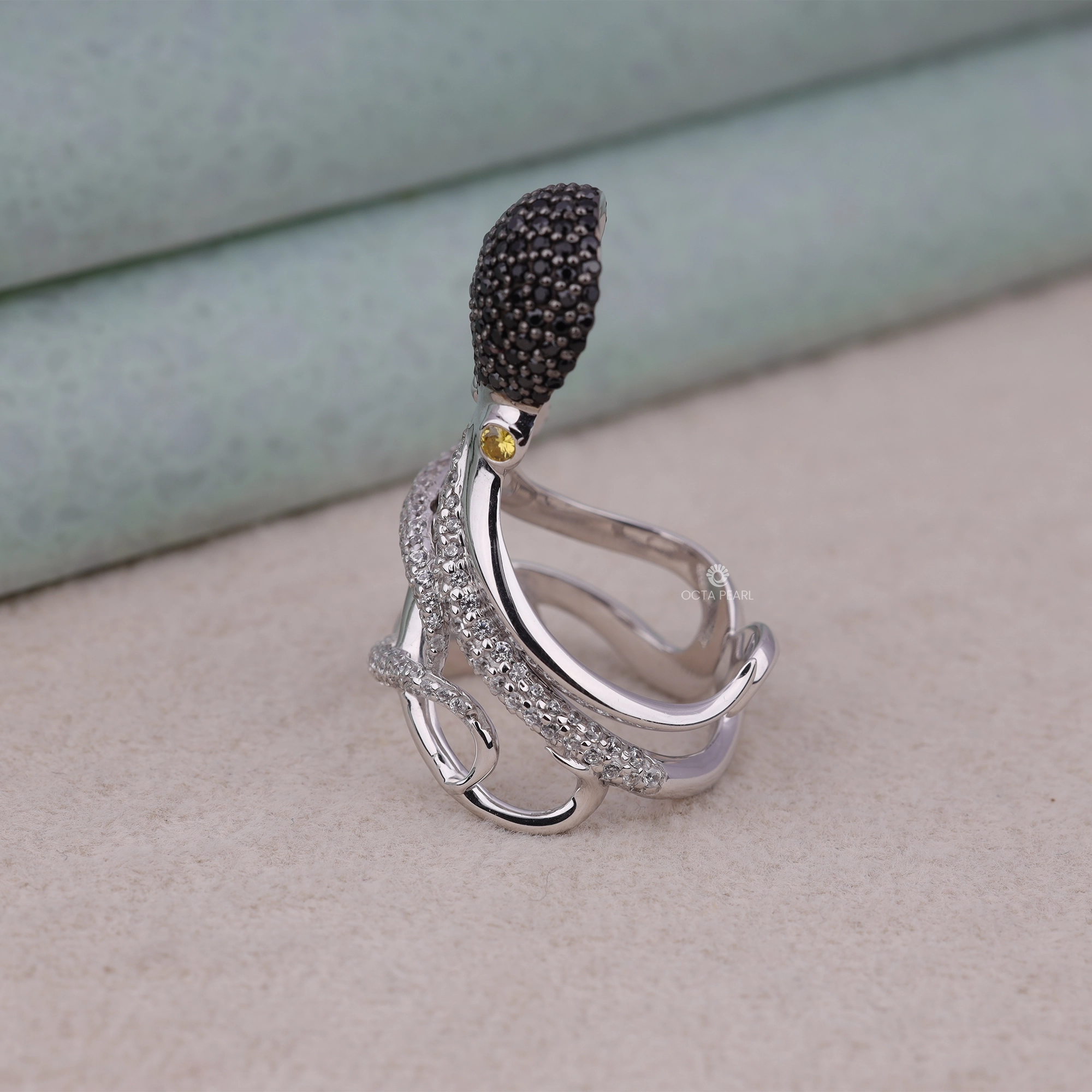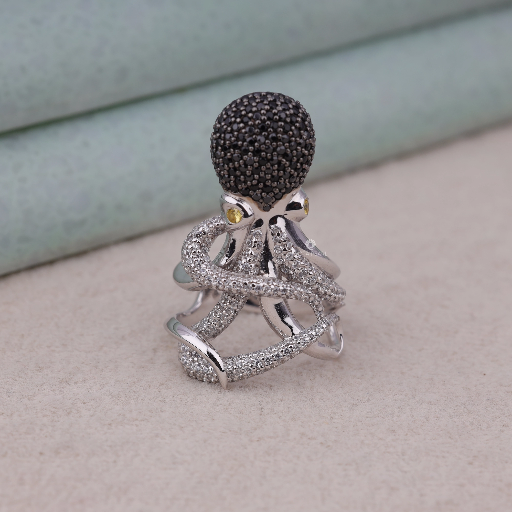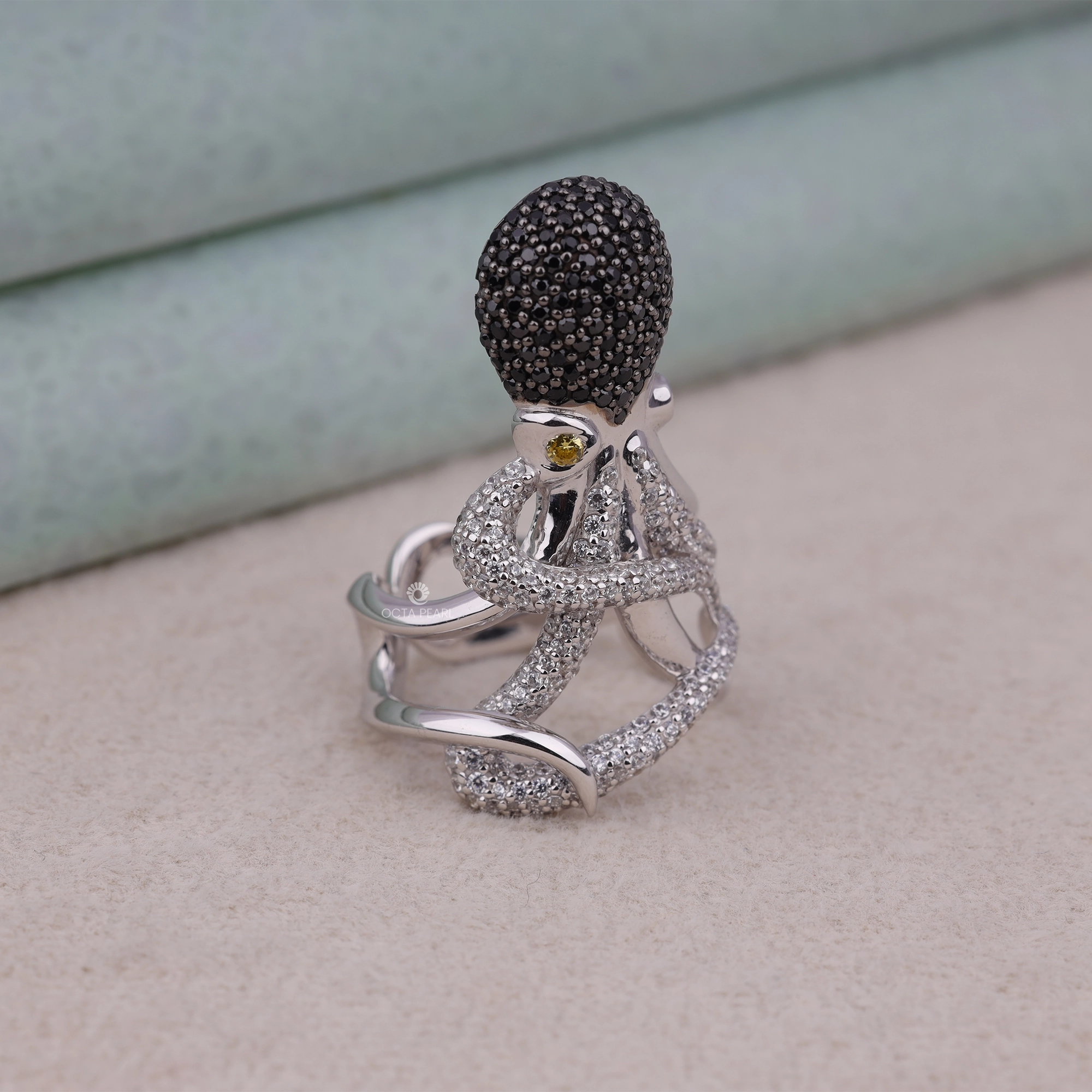 This Black & White CZ Octopus Ring captures the mysterious beauty of the ocean in a bold statement design. Featuring sparkling black and white cubic zirconia stones, the intricate tentacle detailing symbolizes strength, intelligence, and mystery. Perfect for ocean lovers and animal jewelry collectors, this ring is crafted with precision and comfort for everyday wear or special occasions. A unique gift for beach enthusiasts or those who adore nautical-inspired, whimsical statement pieces.