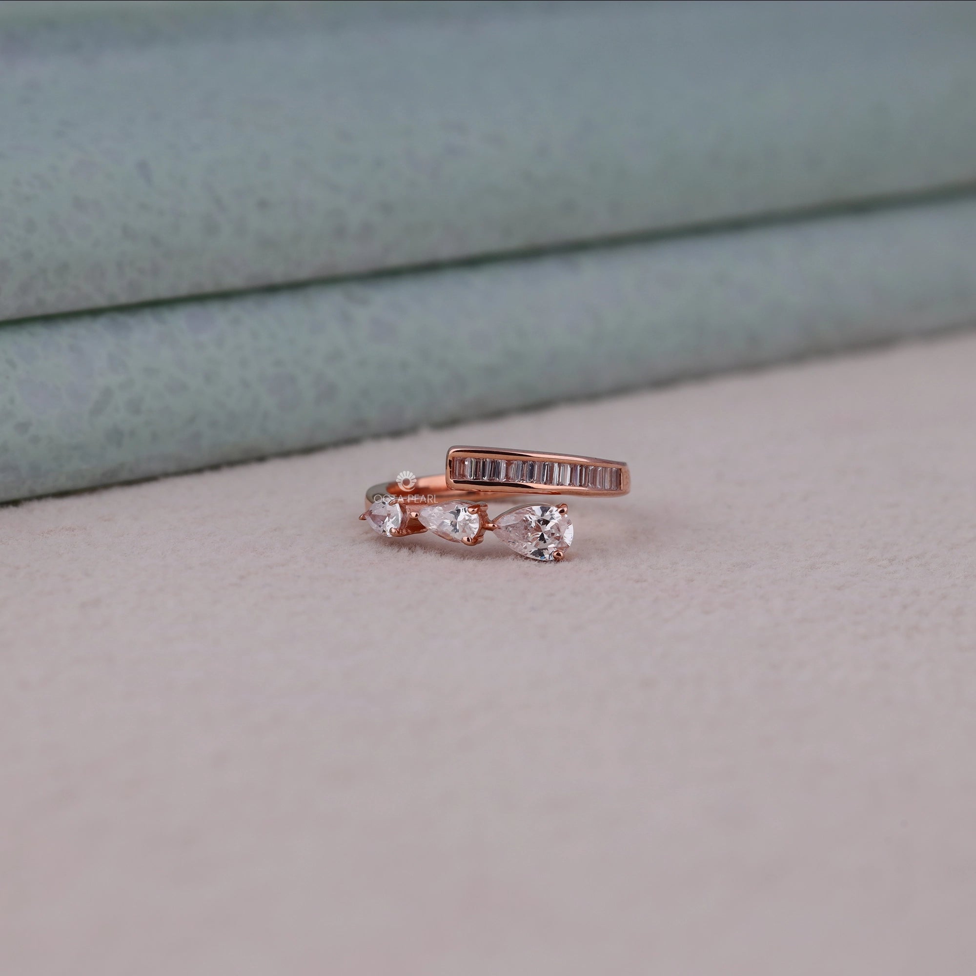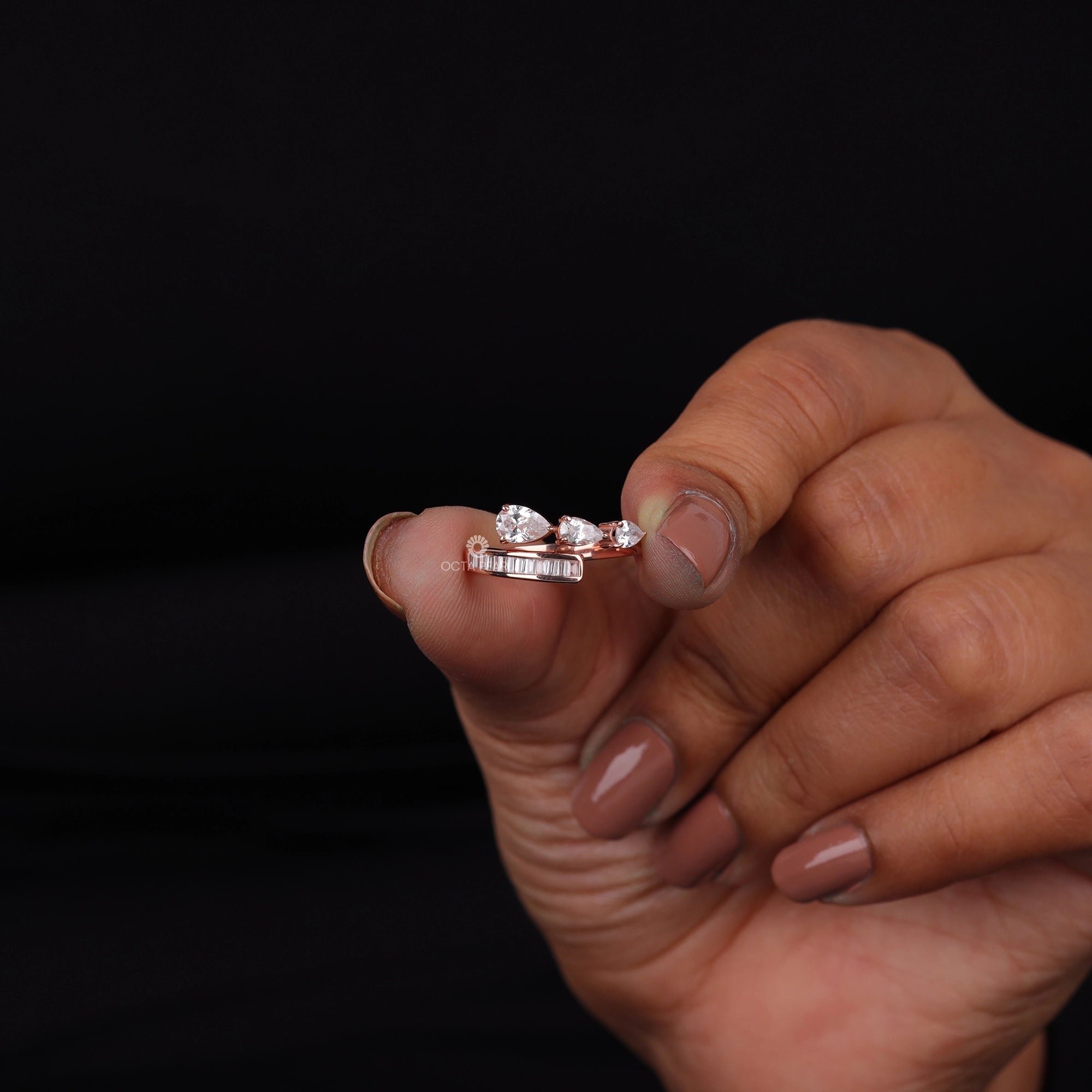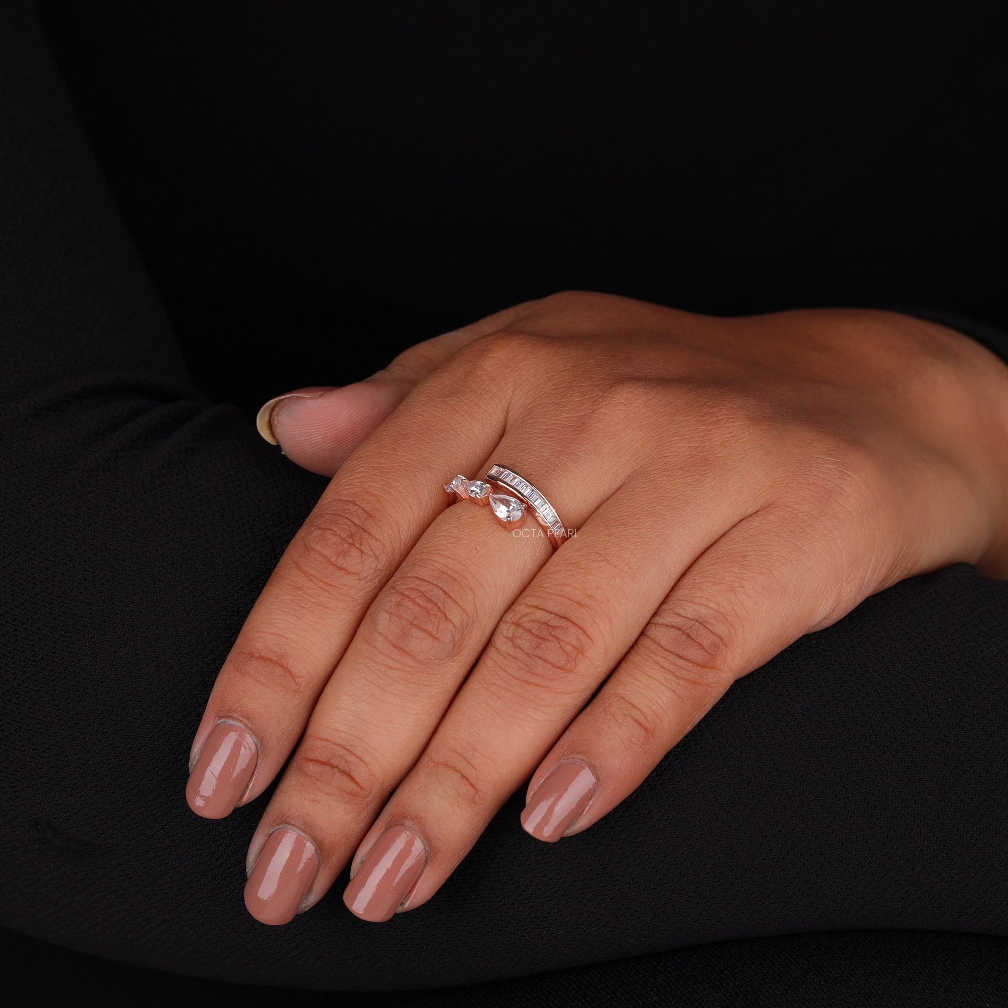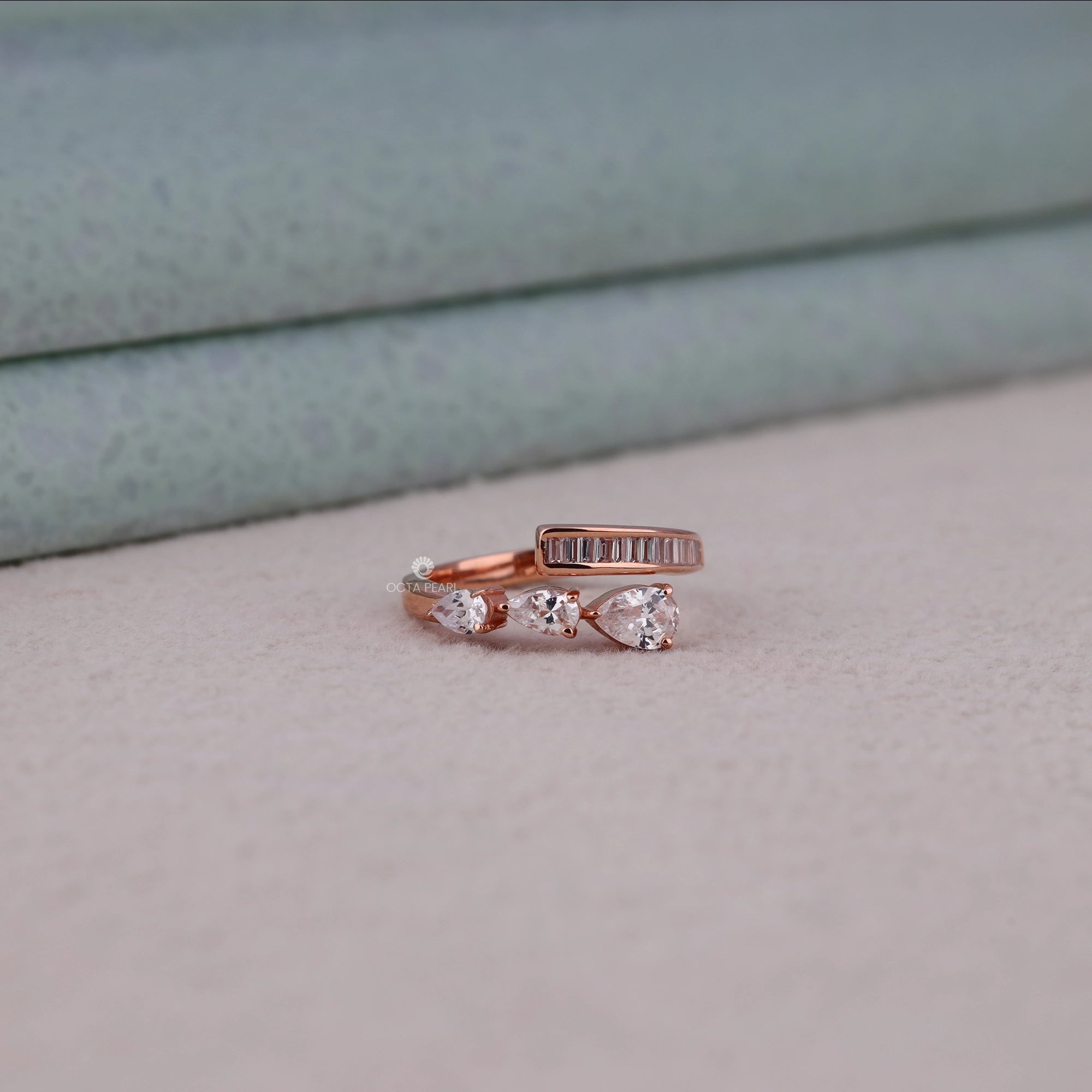 Make a statement with this stunning Bypass Open Gap Engagement Ring, artfully crafted with pear and baguette cut moissanite stones to deliver maximum brilliance and fire. Handmade and customizable in your choice of silver, 10K, 14K, or 18K gold—white, rose, or yellow—this modern yet elegant design wraps the finger in luxury, comfort, and sparkle. Perfect for women who want a unique engagement ring, wedding band, or daily wear showpiece, this ring is ethically sourced and guaranteed to impress as a gift for a girlfriend or loved one. Enjoy a high-end, affordable alternative to diamonds from OctaPearl, designed for discerning buyers in the USA seeking lasting beauty and personalization.