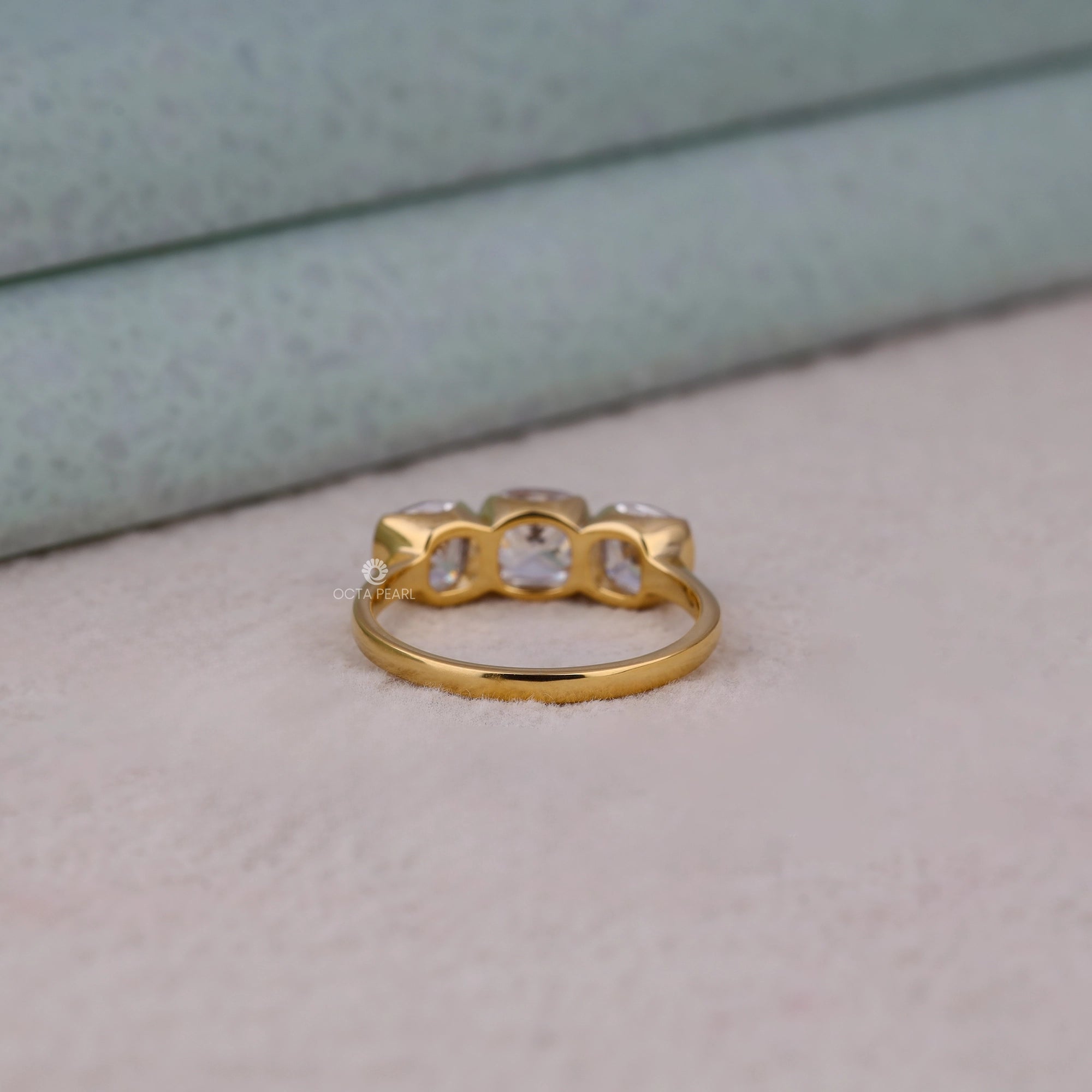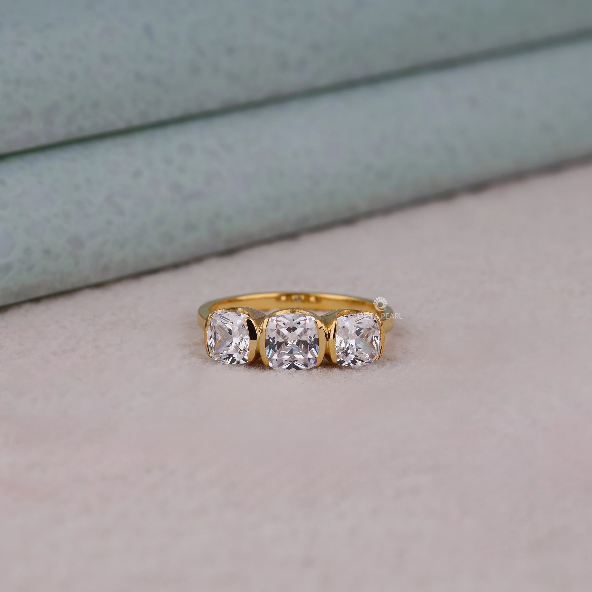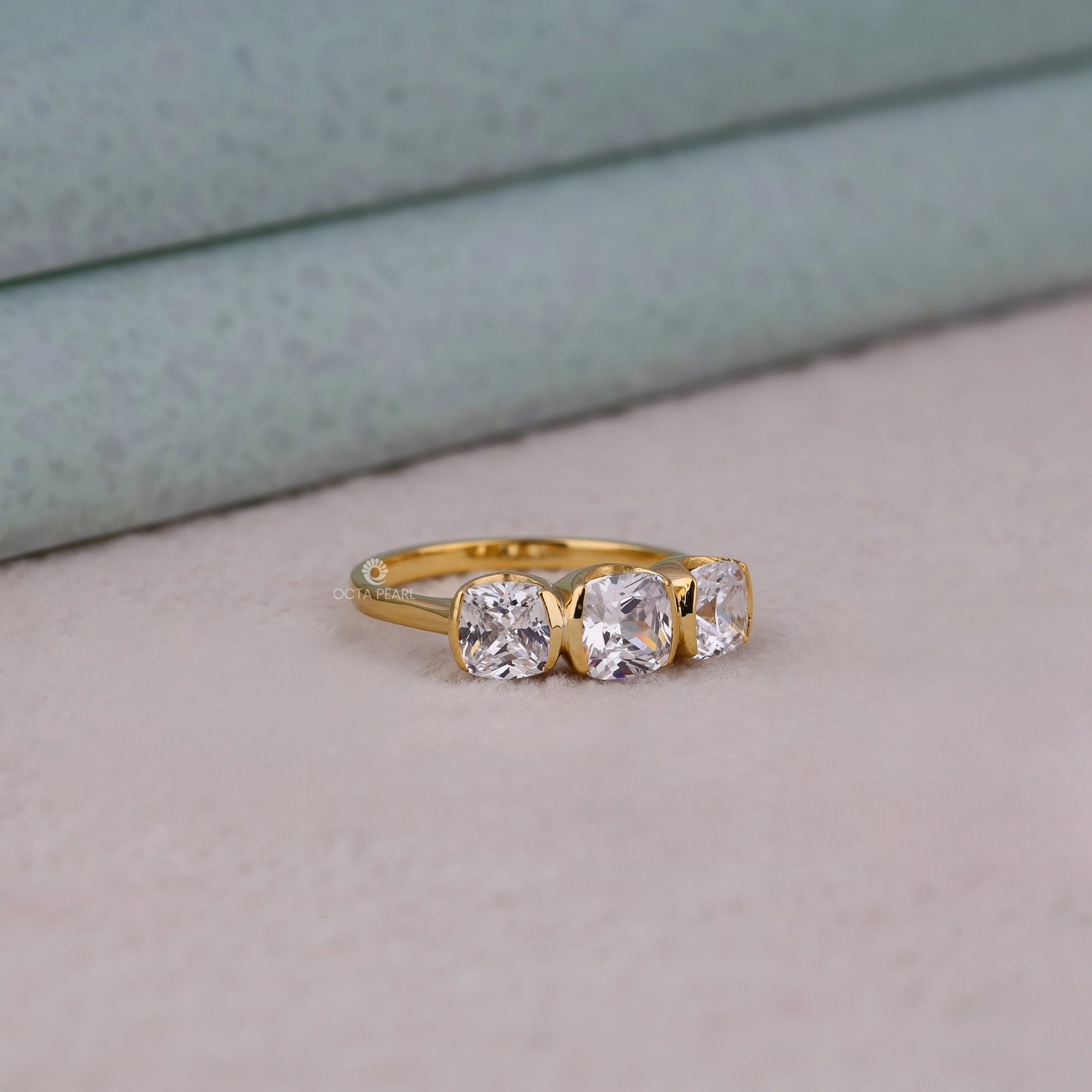 Celebrate elegance and modern design with this Half Bezel Set Cushion Cut Moissanite Three Stone Engagement Ring, featuring brilliant cushion cut moissanite diamonds in a secure half bezel setting for enhanced durability and sparkle. Handmade and customizable in silver, 10K, 14K, or 18K gold, with your choice of white, rose, or yellow metal colors, this ring is perfect for women and jewelry lovers seeking timeless sophistication and versatility. The trio of stones symbolizes past, present, and future—making it a meaningful choice for weddings, engagements, or as a lasting gift for a girlfriend across the USA. Enjoy long-lasting brilliance and unmatched craftsmanship from OctaPearl, where each piece is designed for the modern bride and daily luxury.
