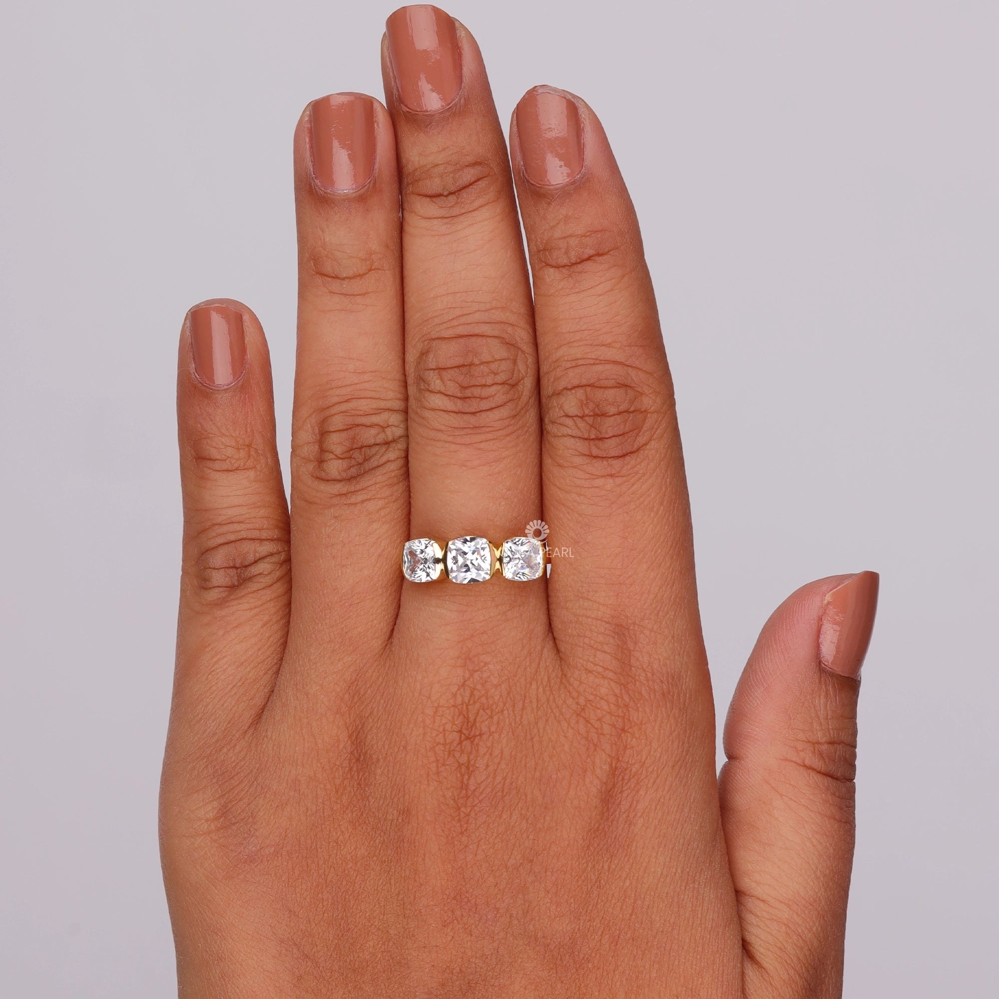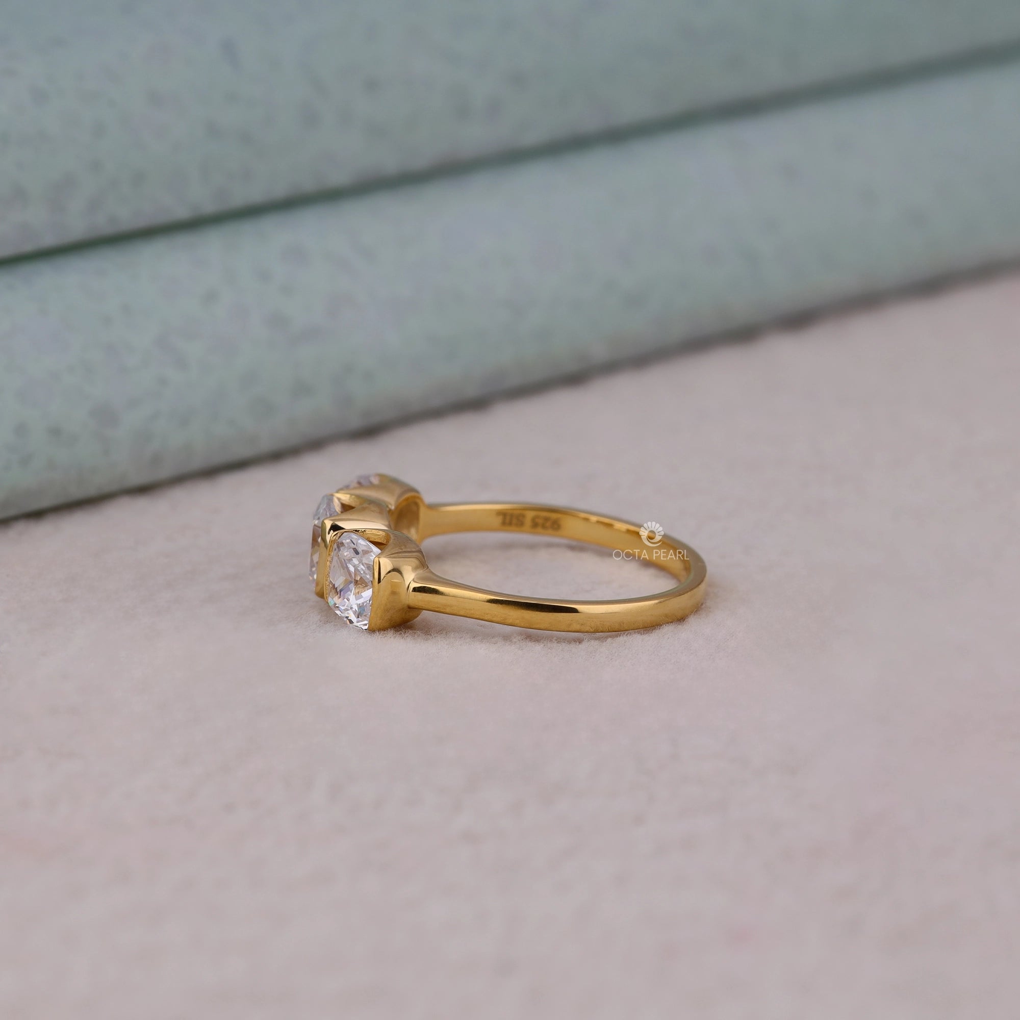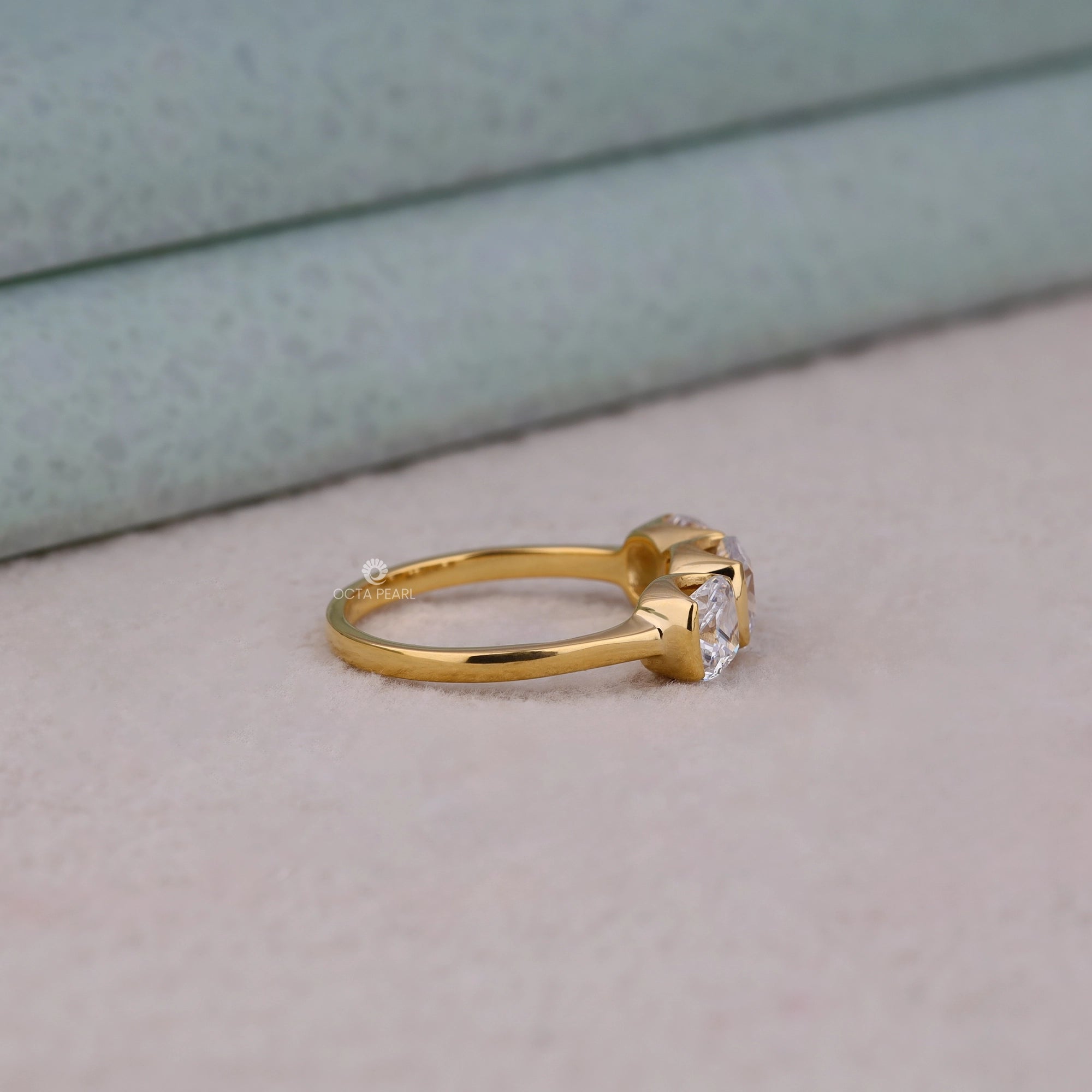 Celebrate elegance and modern design with this Half Bezel Set Cushion Cut Moissanite Three Stone Engagement Ring, featuring brilliant cushion cut moissanite diamonds in a secure half bezel setting for enhanced durability and sparkle. Handmade and customizable in silver, 10K, 14K, or 18K gold, with your choice of white, rose, or yellow metal colors, this ring is perfect for women and jewelry lovers seeking timeless sophistication and versatility. The trio of stones symbolizes past, present, and future—making it a meaningful choice for weddings, engagements, or as a lasting gift for a girlfriend across the USA. Enjoy long-lasting brilliance and unmatched craftsmanship from OctaPearl, where each piece is designed for the modern bride and daily luxury.
