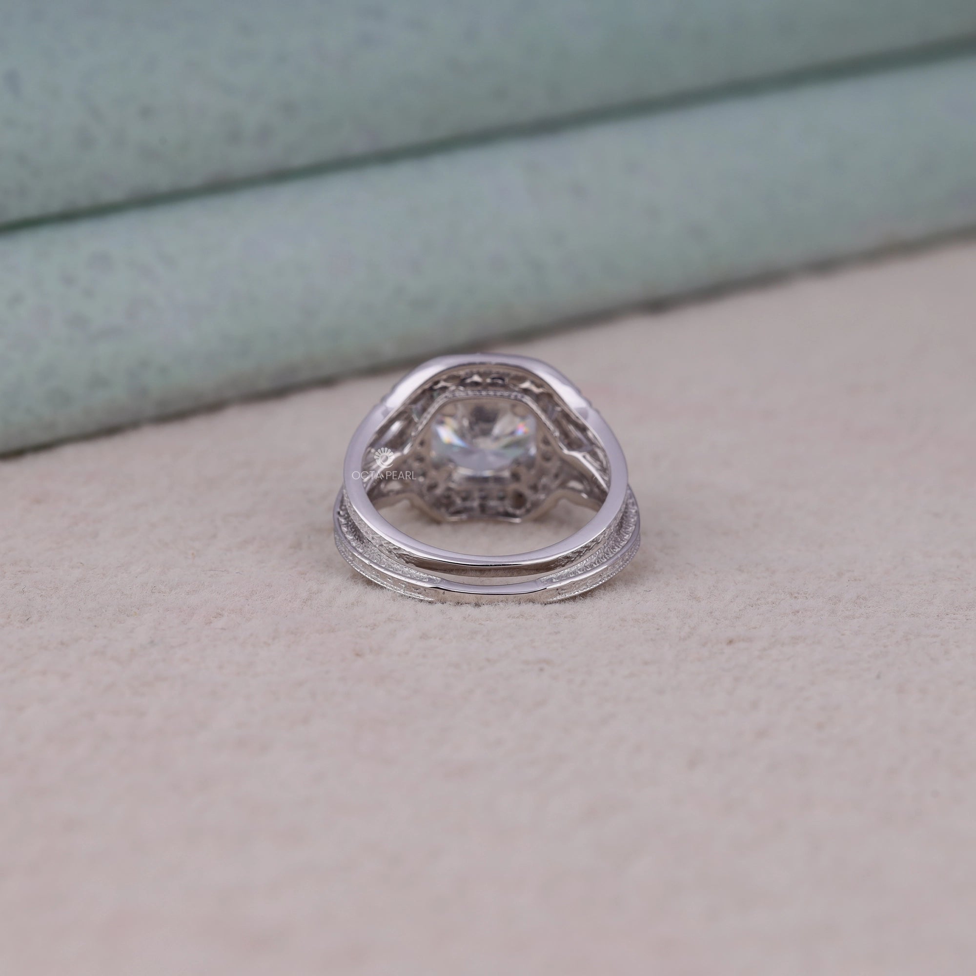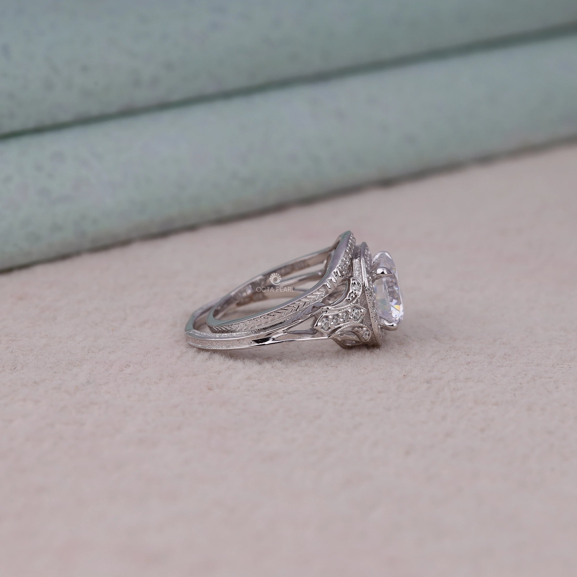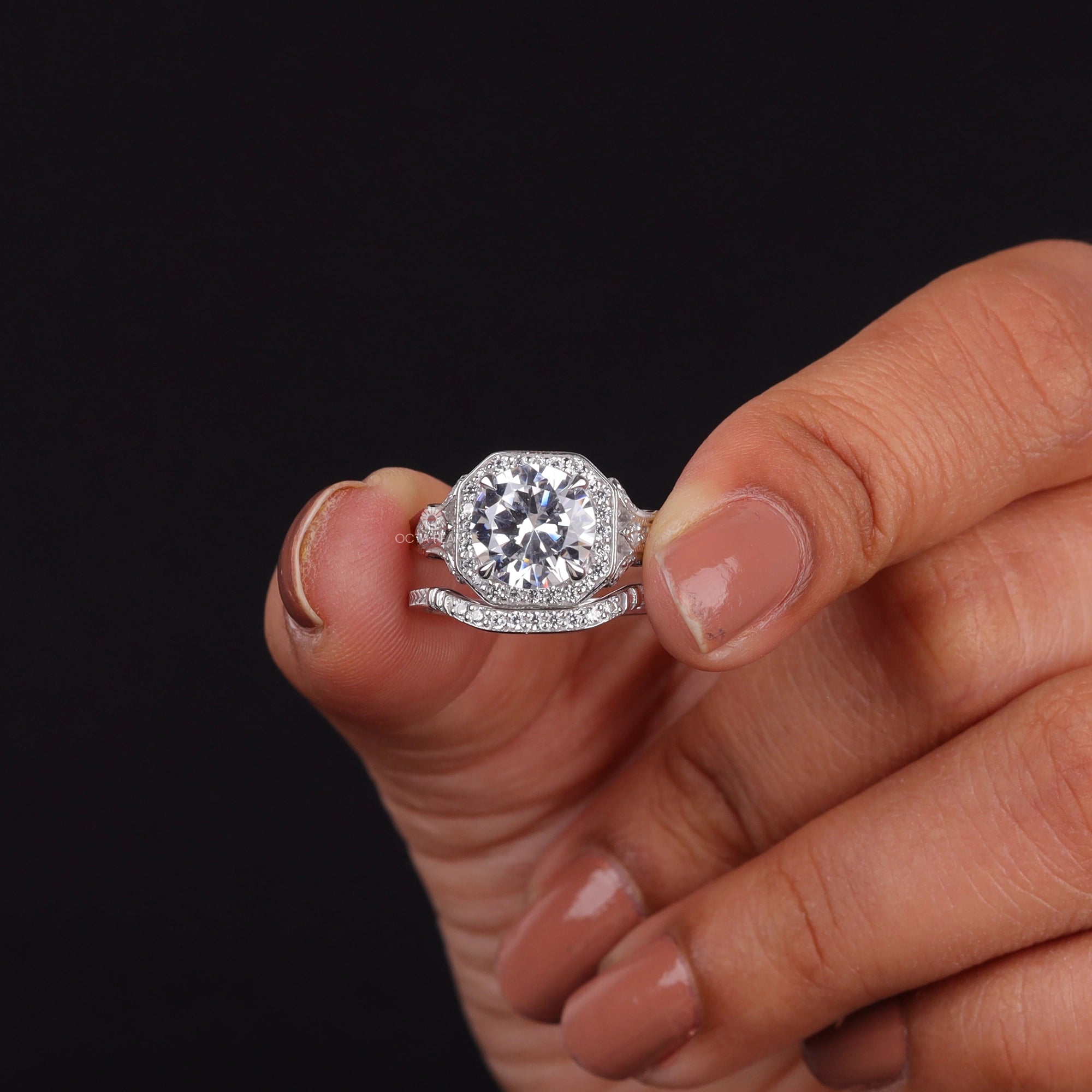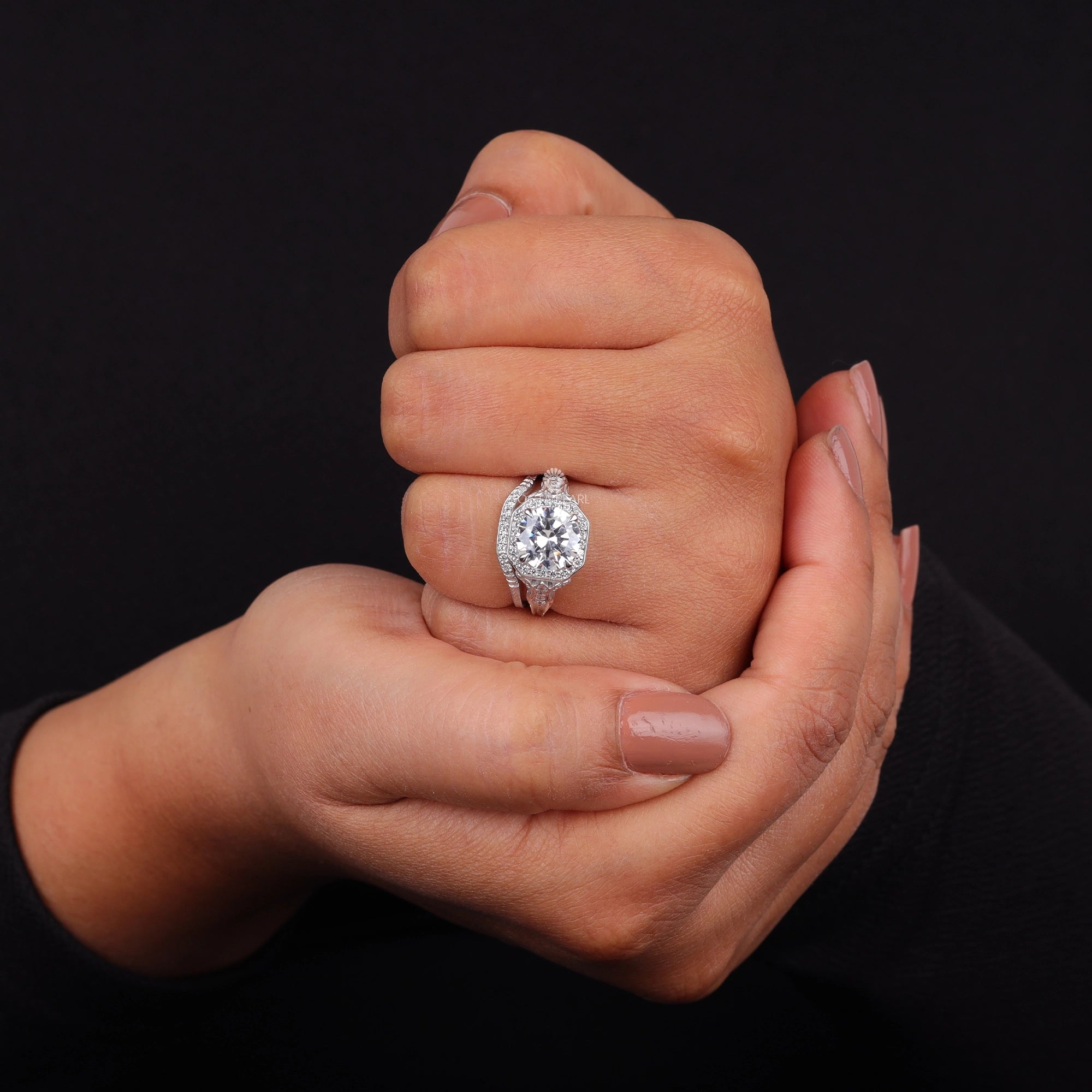 This Halo Art Deco Round Moissanite Bridal Ring Set exudes vintage-inspired elegance. A brilliant round-cut moissanite center stone is surrounded by a sparkling halo, creating timeless beauty with exceptional fire. The intricate Art Deco detailing on the band adds charm and sophistication, perfect for brides who love classic glamour. Crafted in fine 14K gold, this durable, conflict-free set is ideal for engagements, weddings, or anniversaries, symbolizing everlasting love and commitment in a stunning and sustainable design.