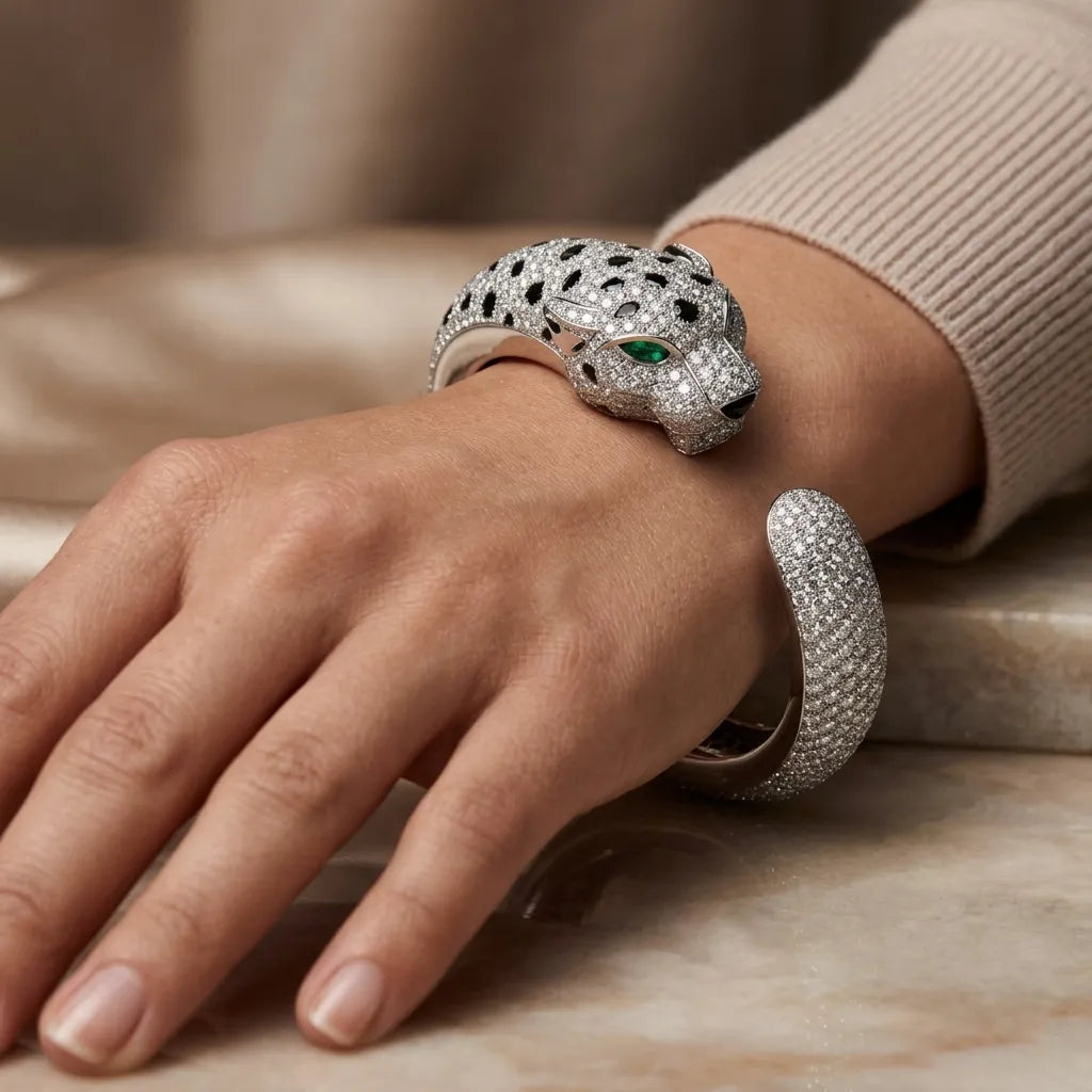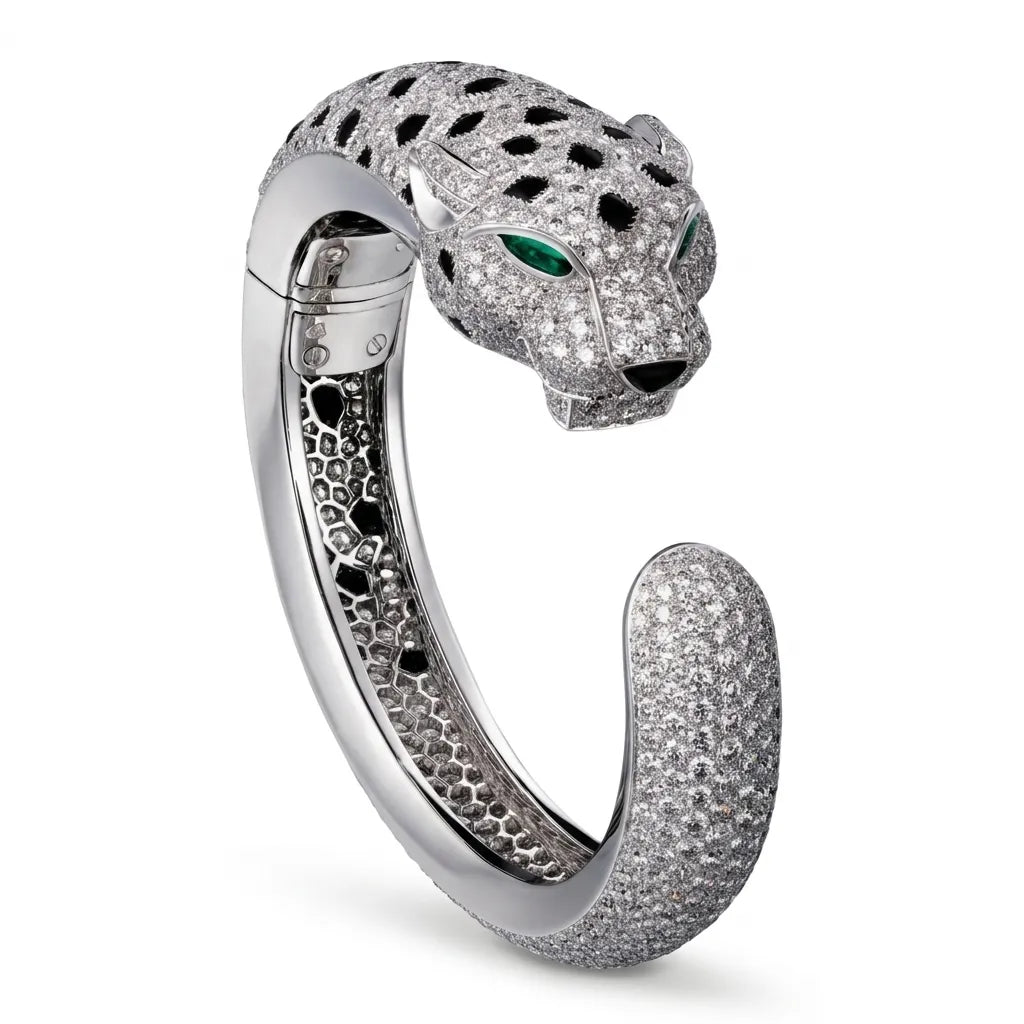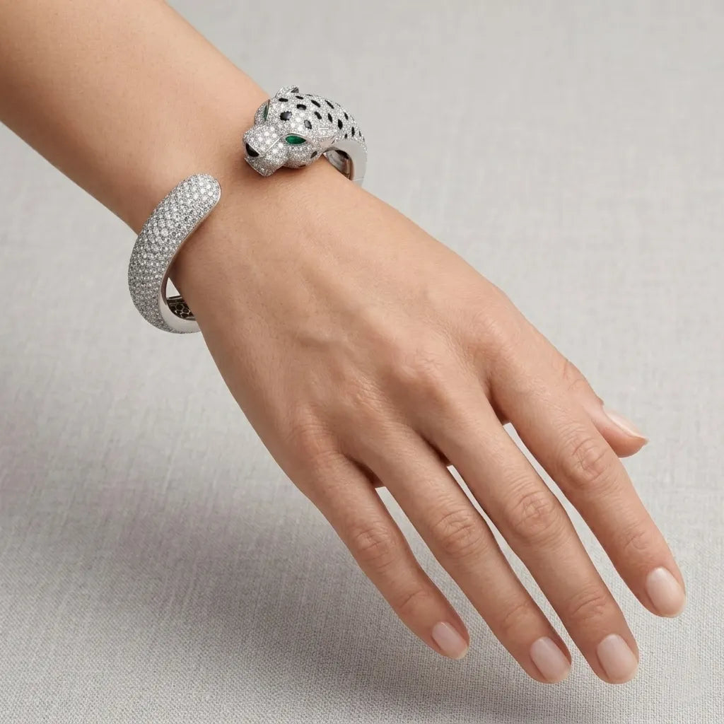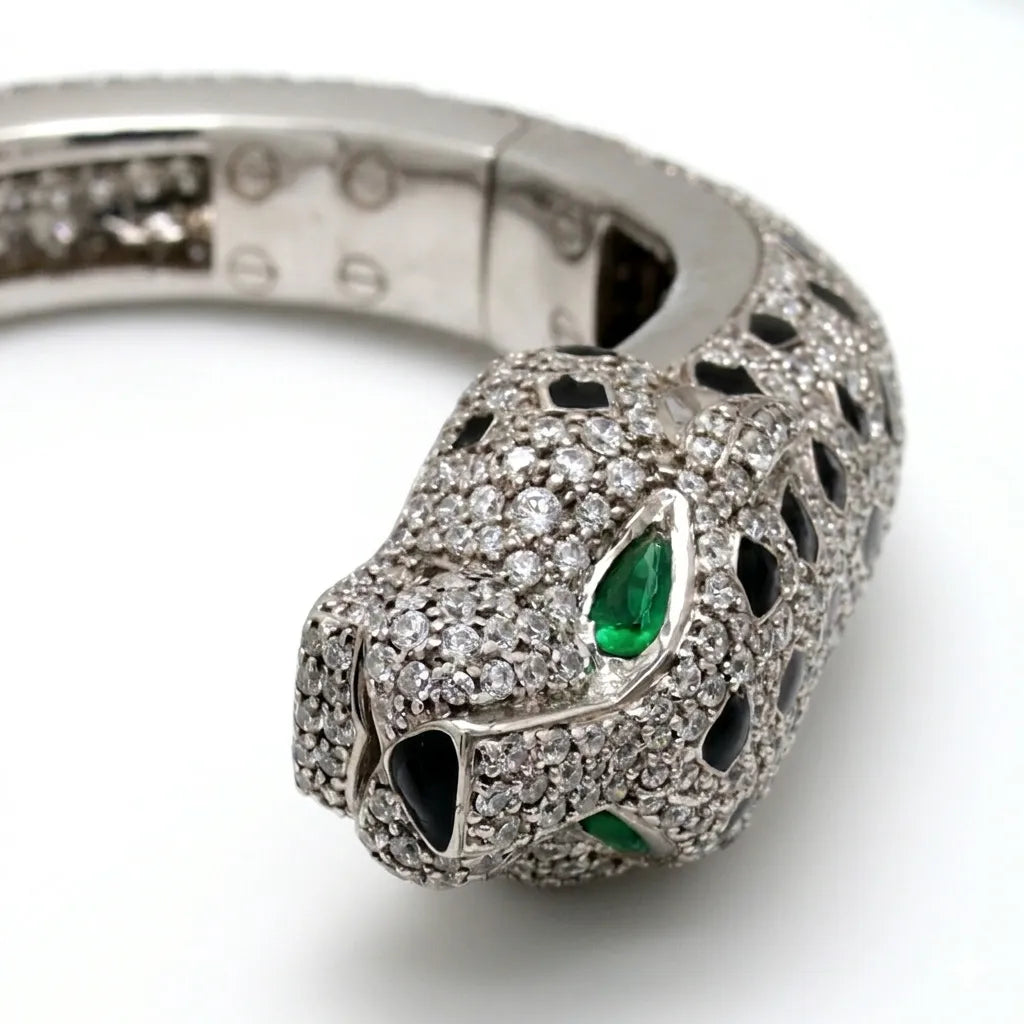 Unleash power with this iced-out panther cuff, fully set with blazing moissanite and piercing green eyes. Built for bold presence, this hip hop statement piece delivers unstoppable shine and dominance—made for those who lead, not follow.