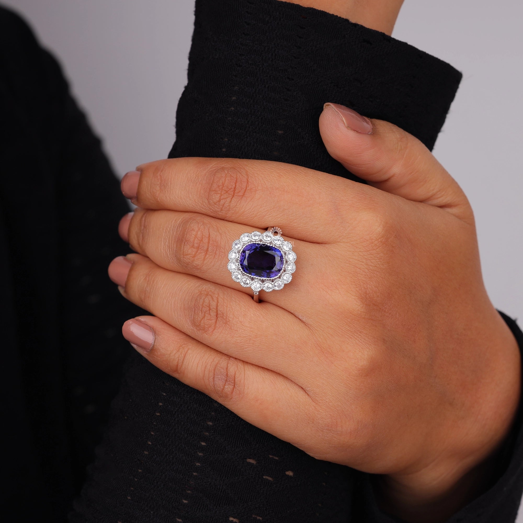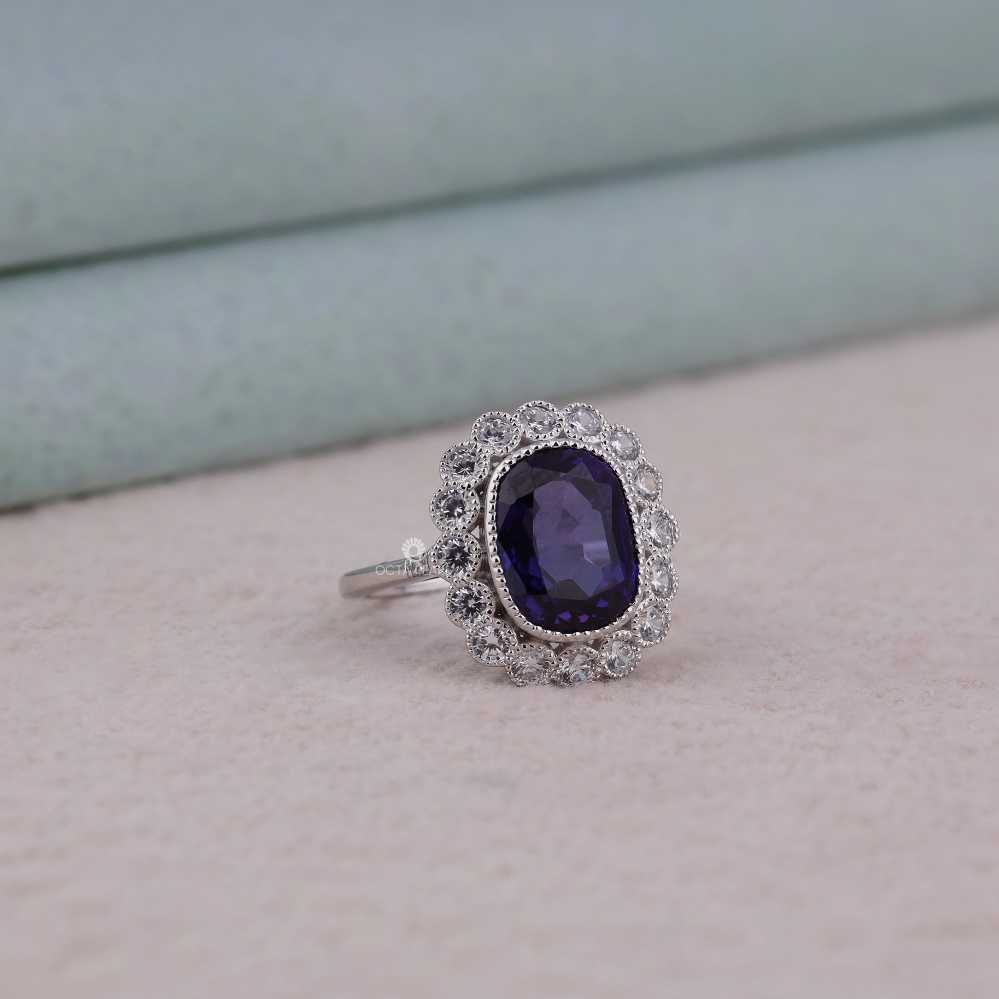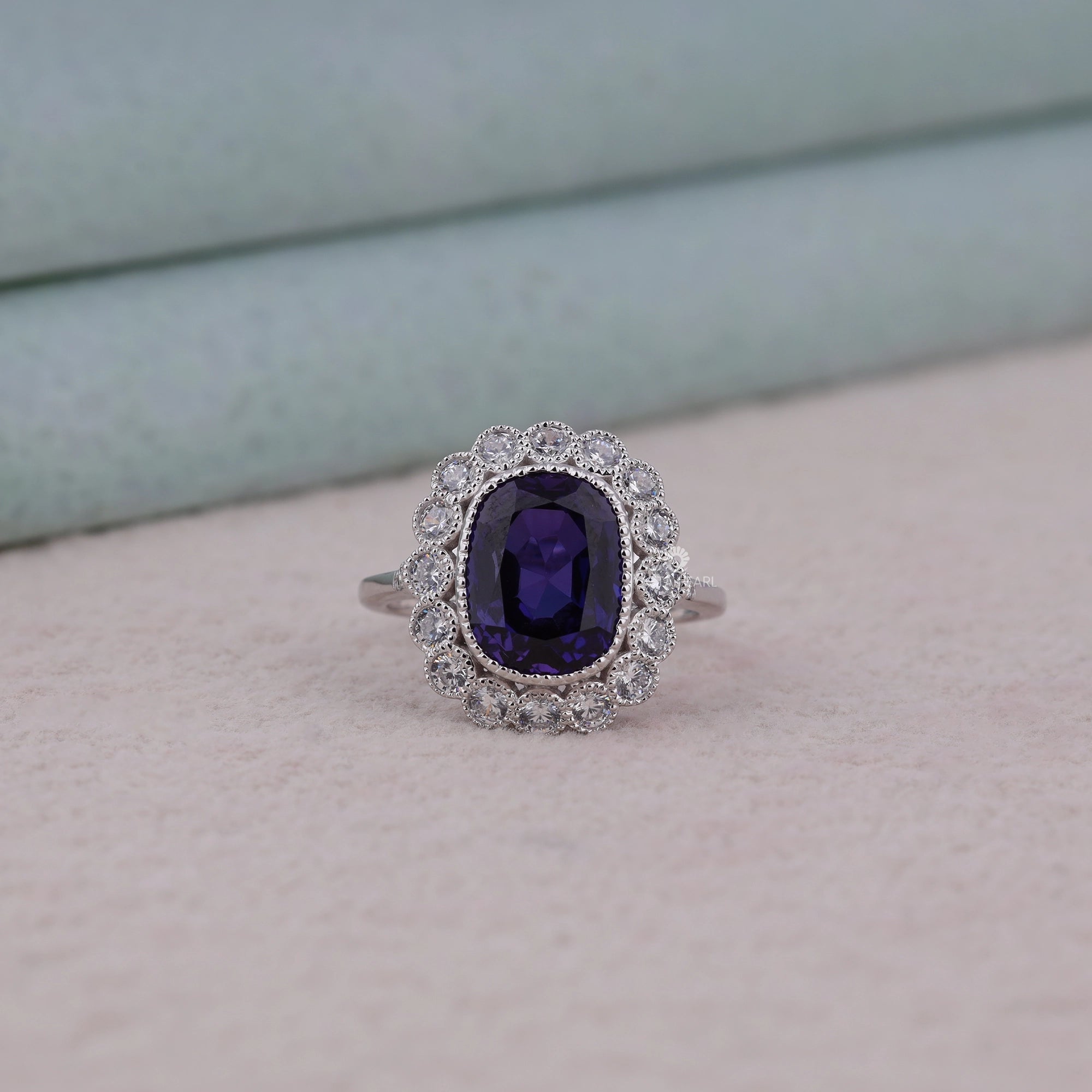 Add a splash of color with this Purple Cushion Halo CZ Ring, featuring a vivid cushion-cut purple CZ center stone encircled by a sparkling halo of round white CZs set in polished silver. The eye-catching statement design and scalloped vintage styling make this ring perfect for parties, special occasions, or adding luxe flair to everyday looks. Hypoallergenic and affordable, this piece is ideal for USA shoppers seeking glamorous cocktail rings with timeless appeal.