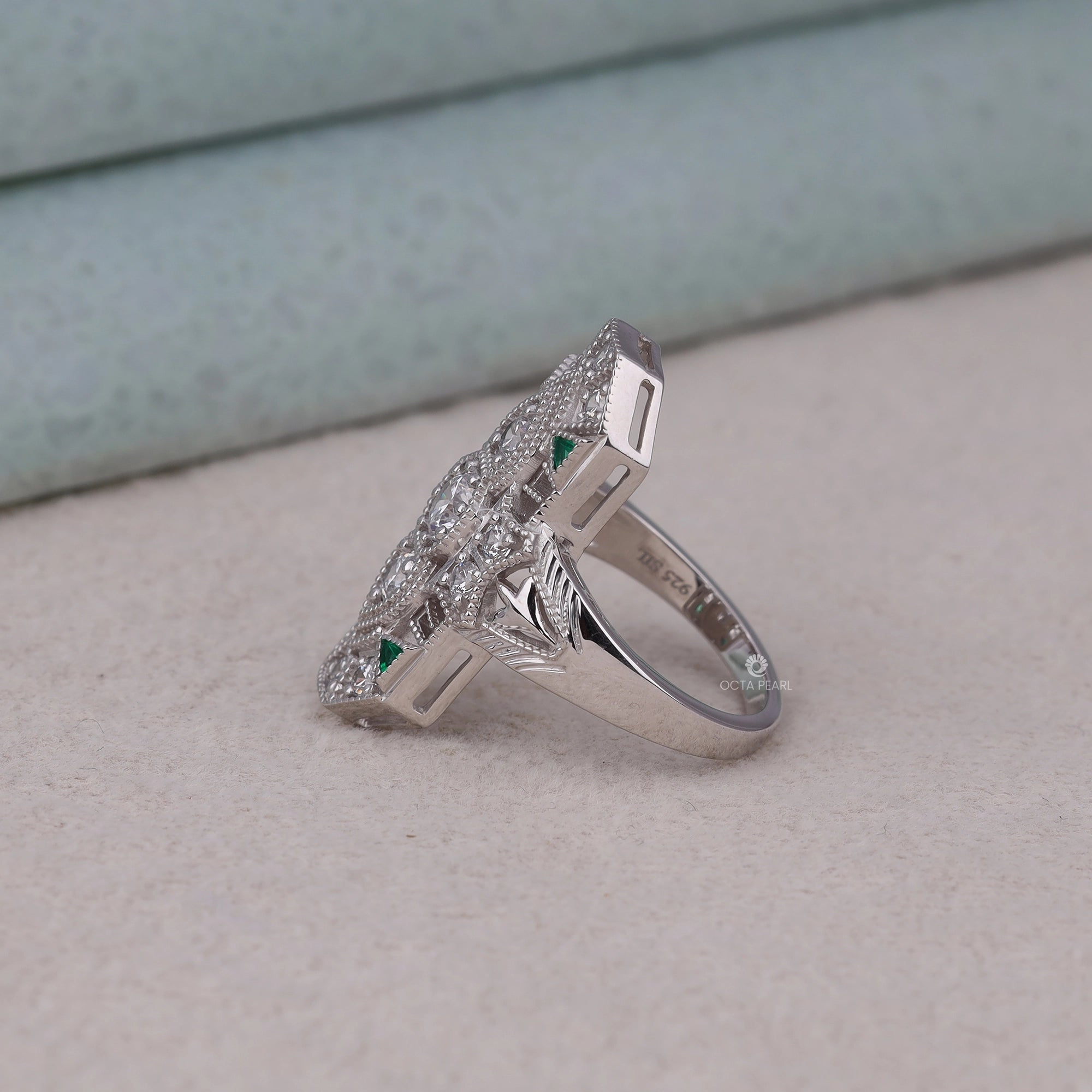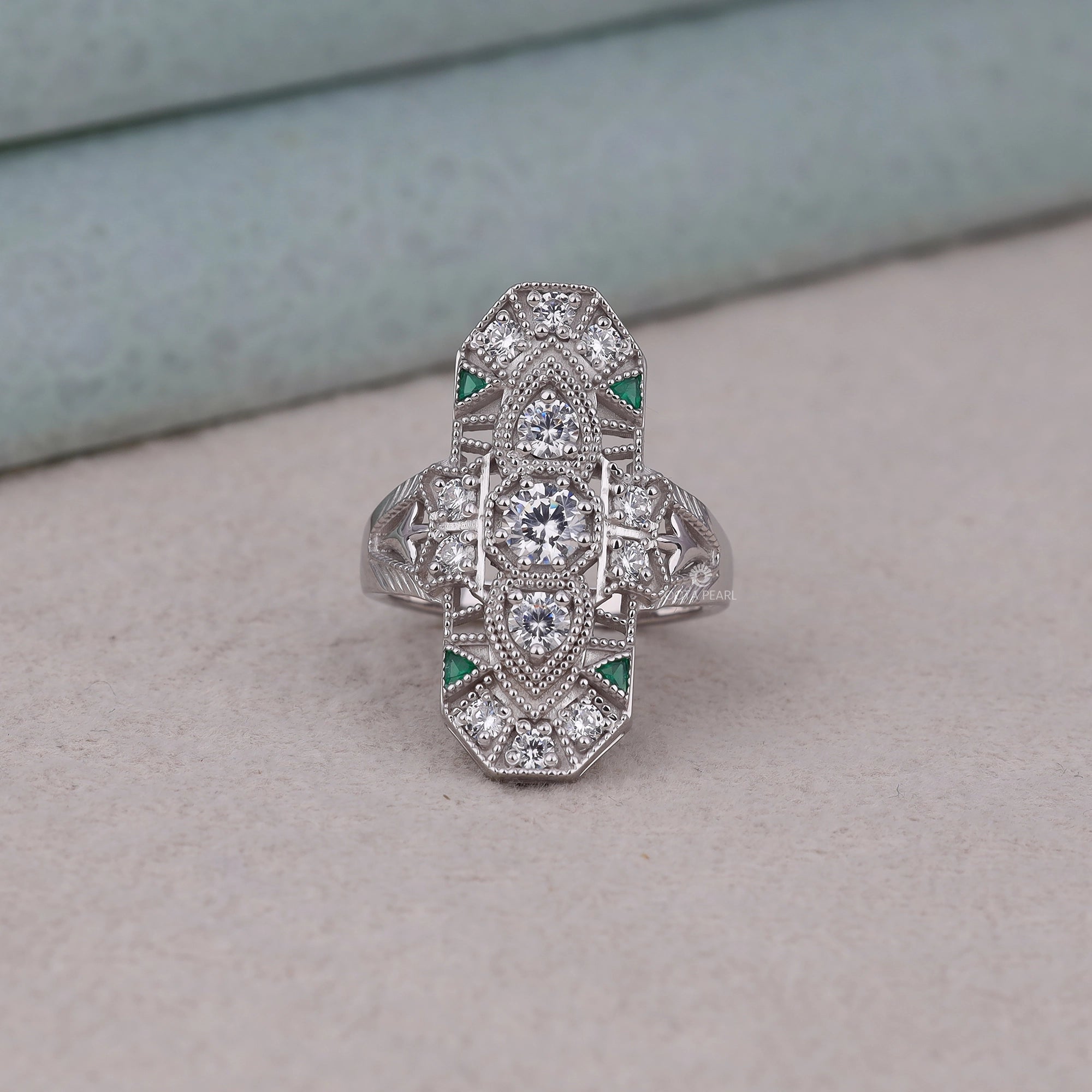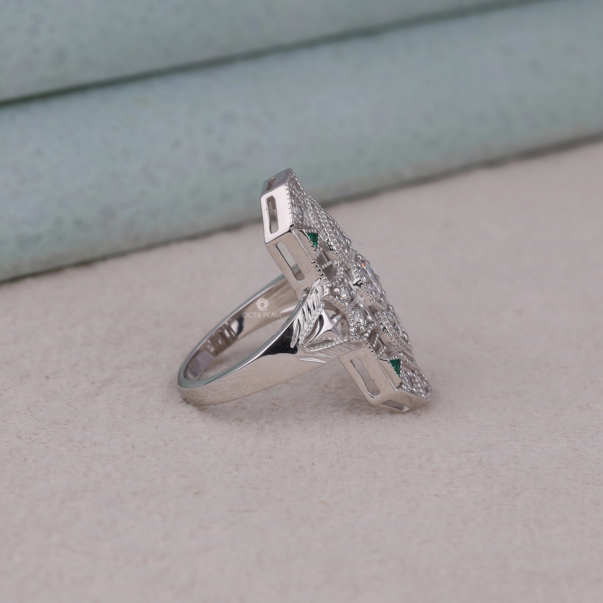 Make a statement with this exquisitely crafted lozenge dinner ring, featuring round and green triangle CZ stones. Inspired by Victorian elegance and Art Deco geometry, this piece brings milgrain detailing and antique flair together in perfect harmony. Ideal for vintage lovers and elegant evening wear.