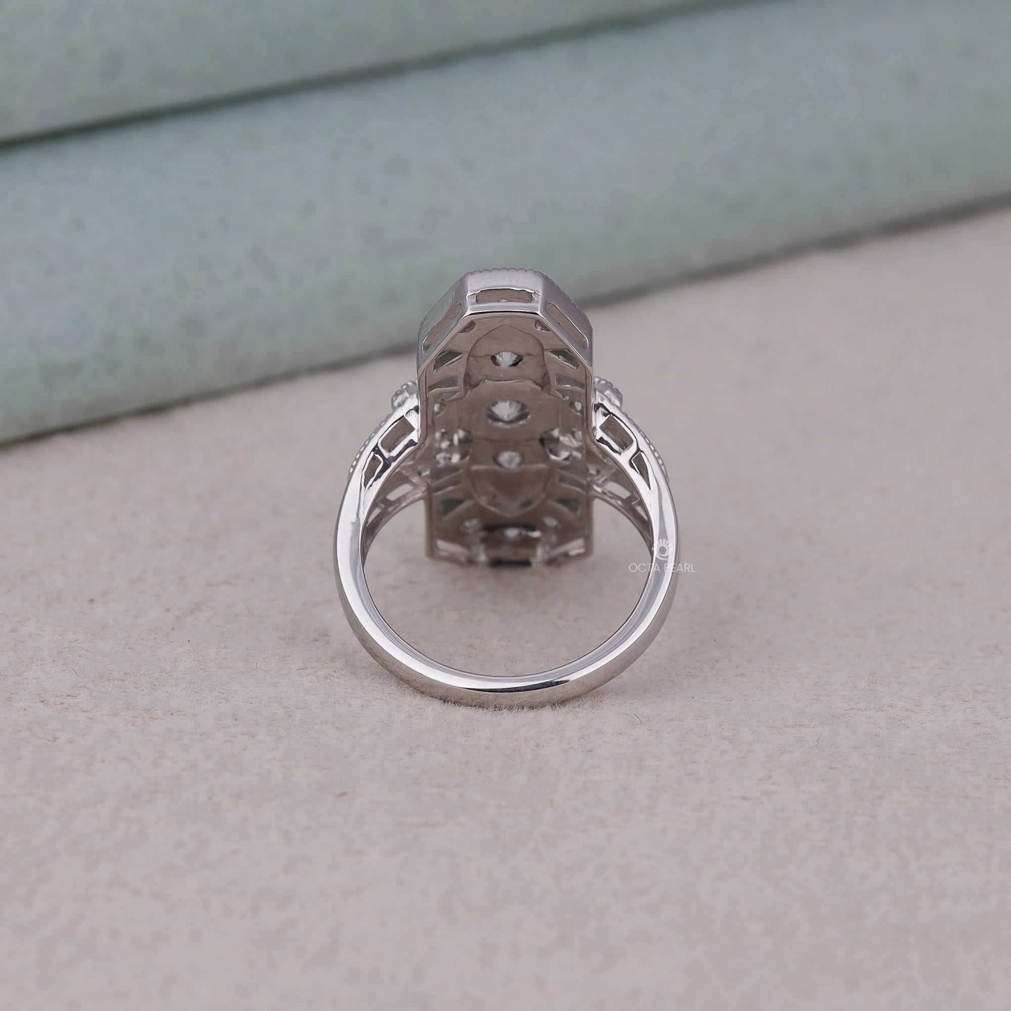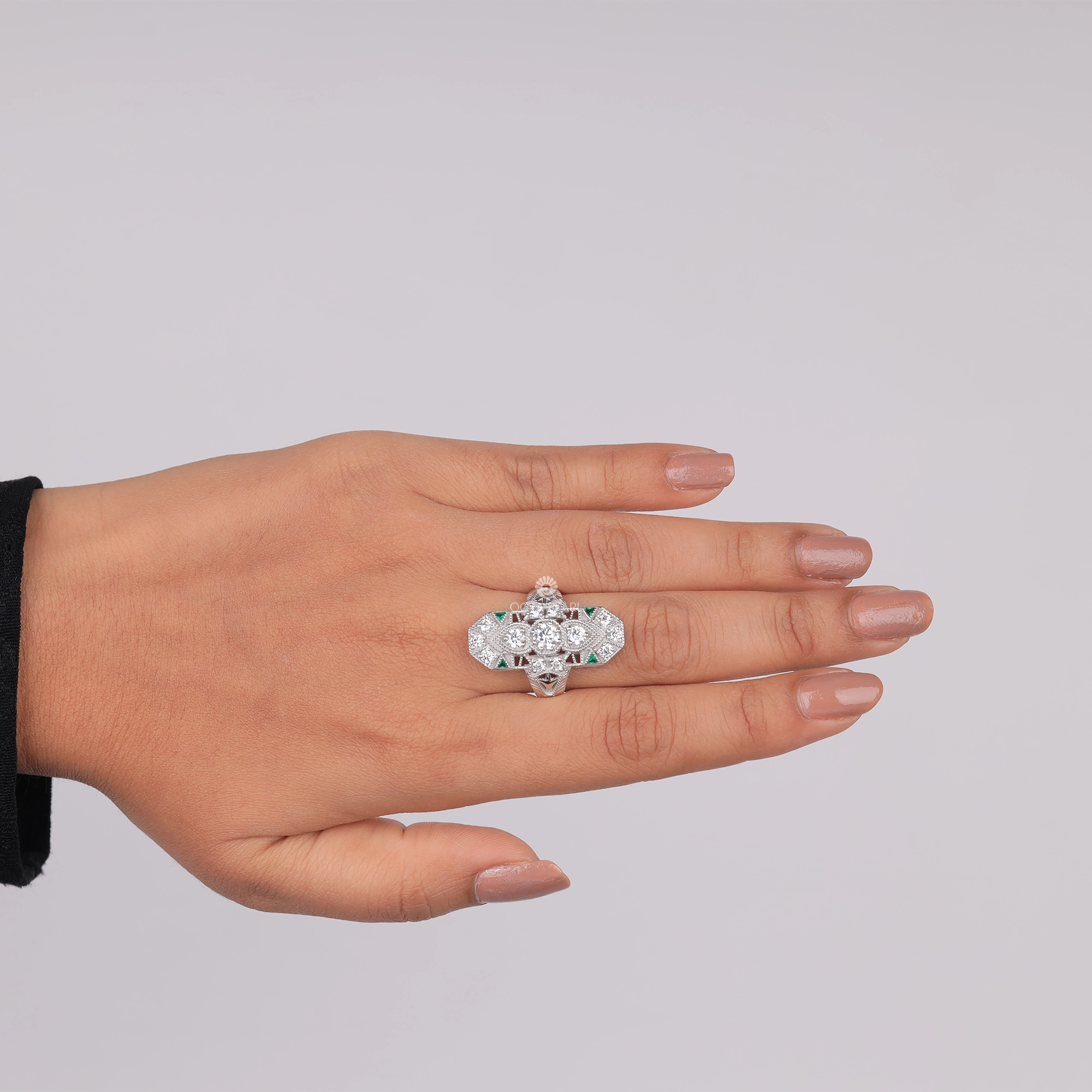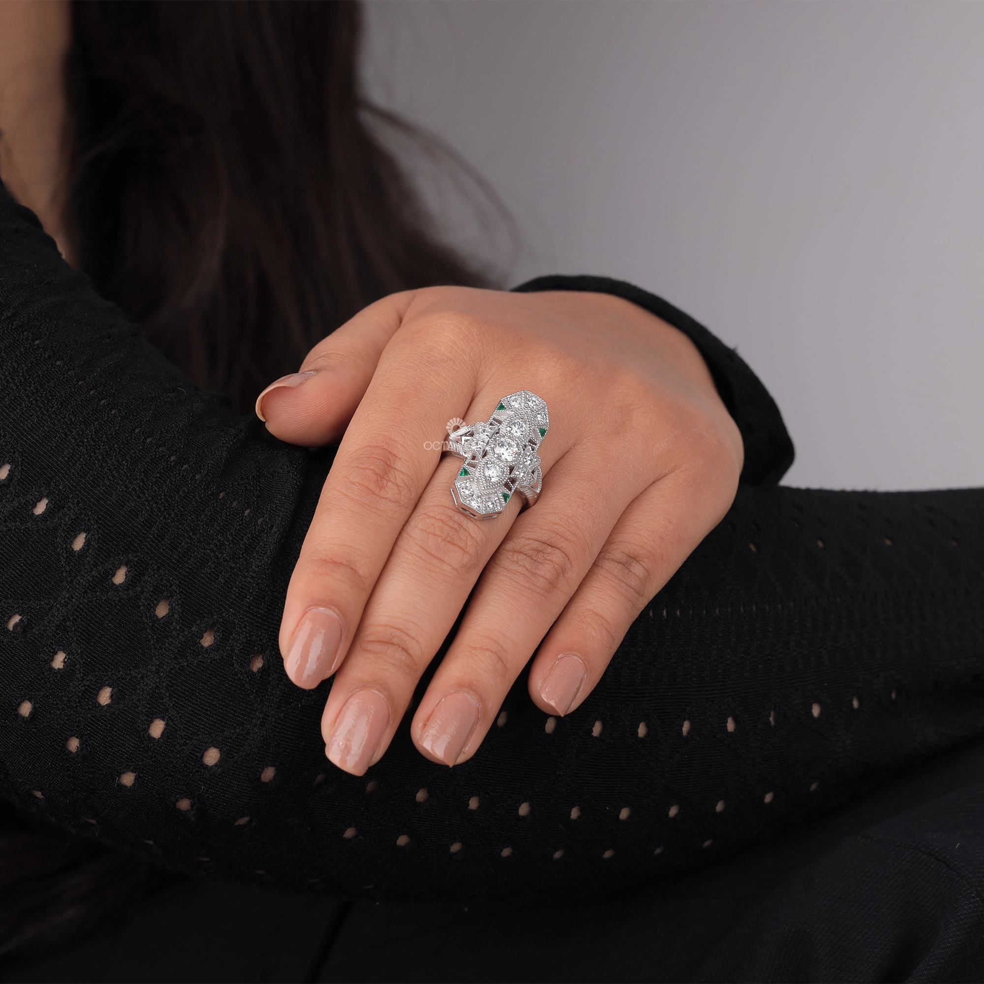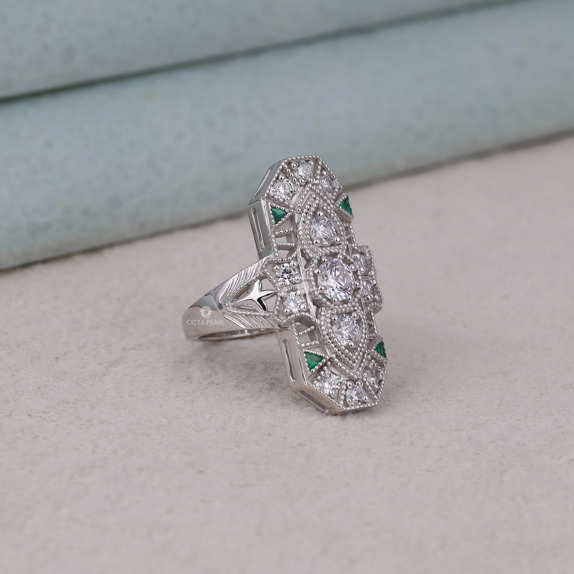 Make a statement with this exquisitely crafted lozenge dinner ring, featuring round and green triangle CZ stones. Inspired by Victorian elegance and Art Deco geometry, this piece brings milgrain detailing and antique flair together in perfect harmony. Ideal for vintage lovers and elegant evening wear.
