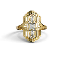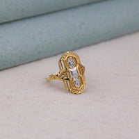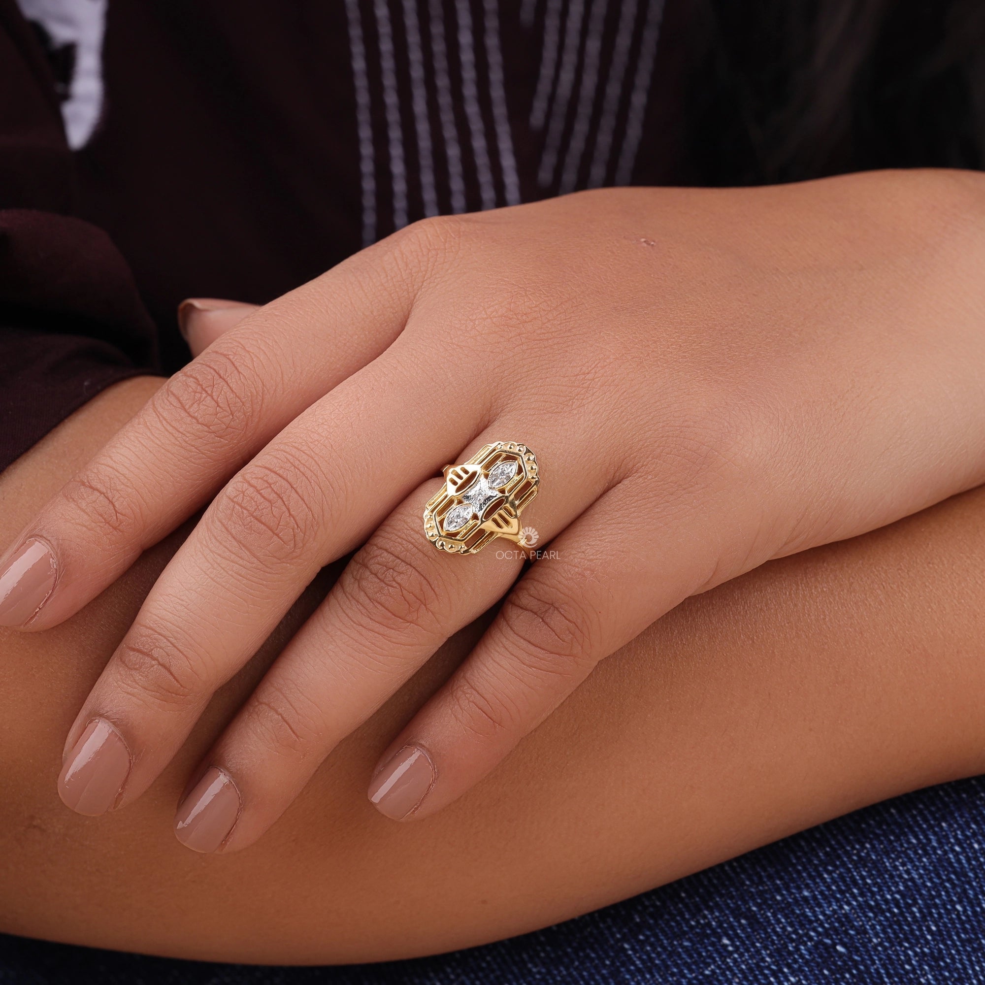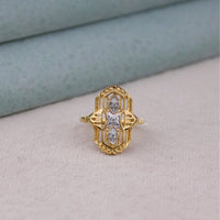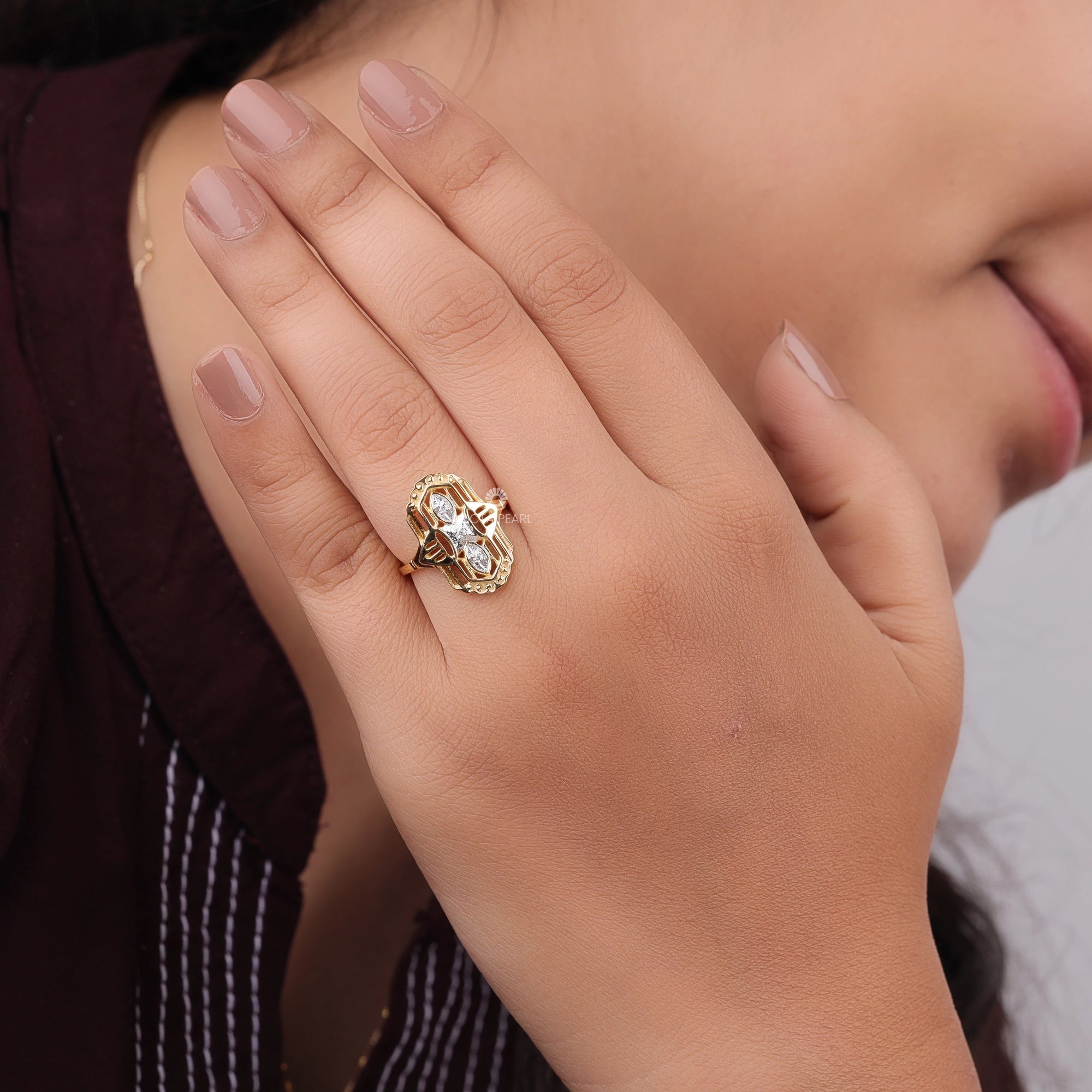This stunning Round Moissanite Three Stone Vintage Style Art Deco Navette Ring is a timeless masterpiece inspired by classic elegance. Featuring three sparkling round cut Moissanite stones set in a graceful navette-shaped Art Deco frame, this ring captures the essence of vintage sophistication. The intricate detailing and geometric flourishes reflect true Art Deco style, while the brilliance of Moissanite adds a luxurious sparkle. Whether chosen as an engagement ring, anniversary gift, or heirloom piece, this three-stone Moissanite ring is perfect for those who adore history, craftsmanship, and refined design.