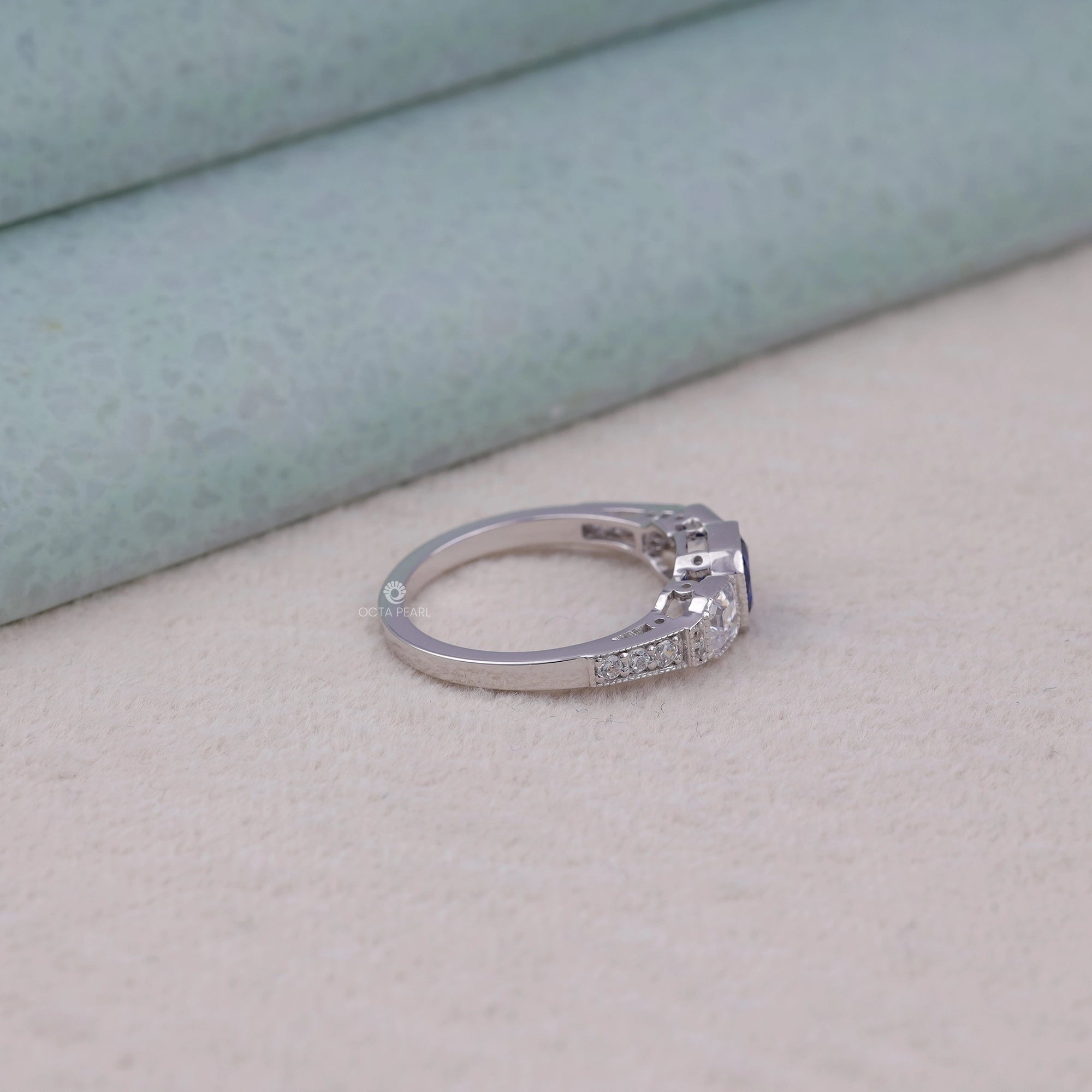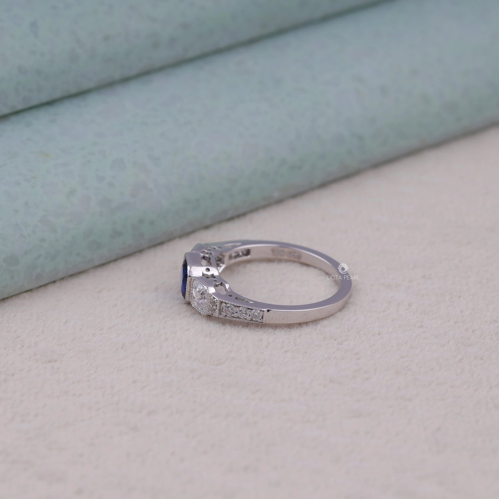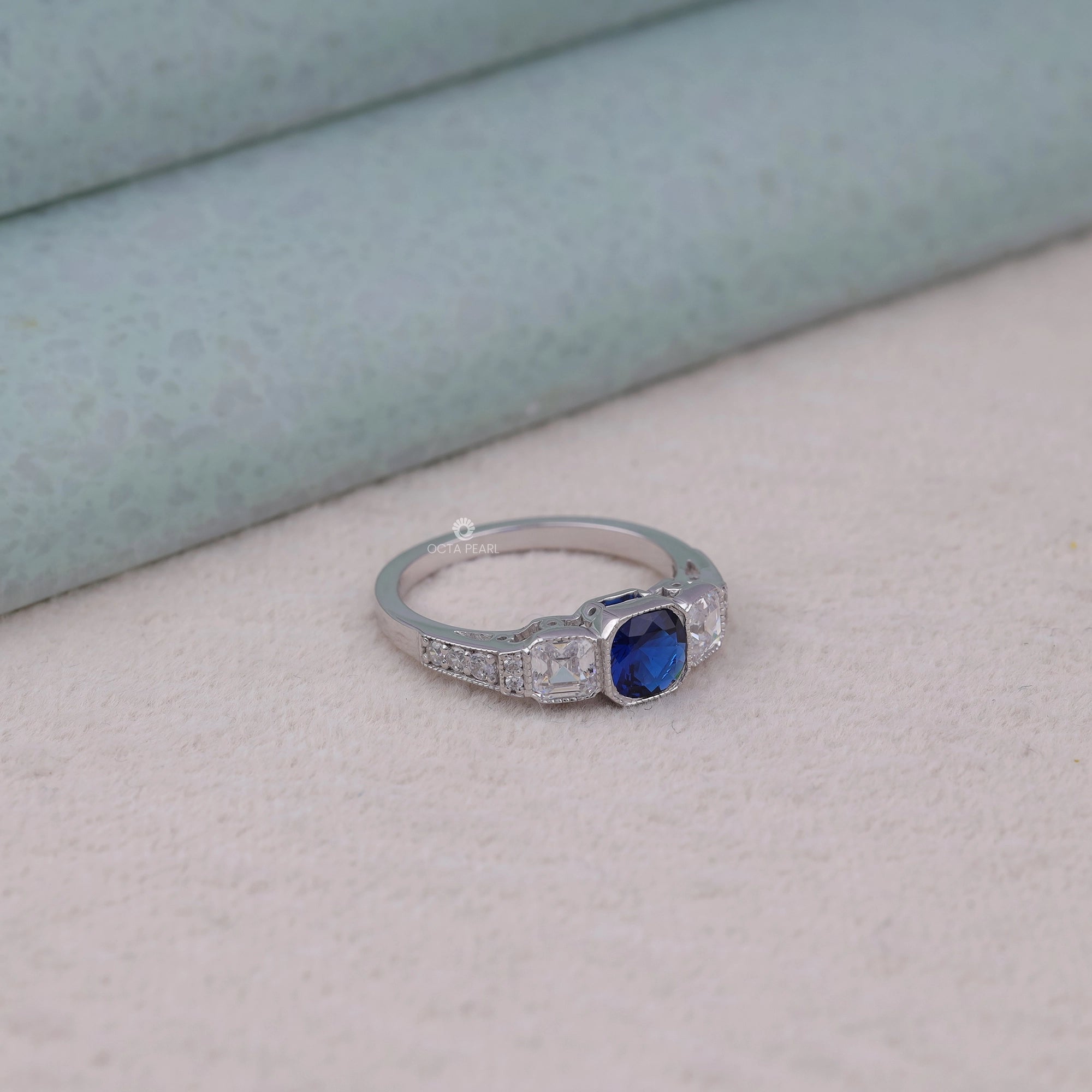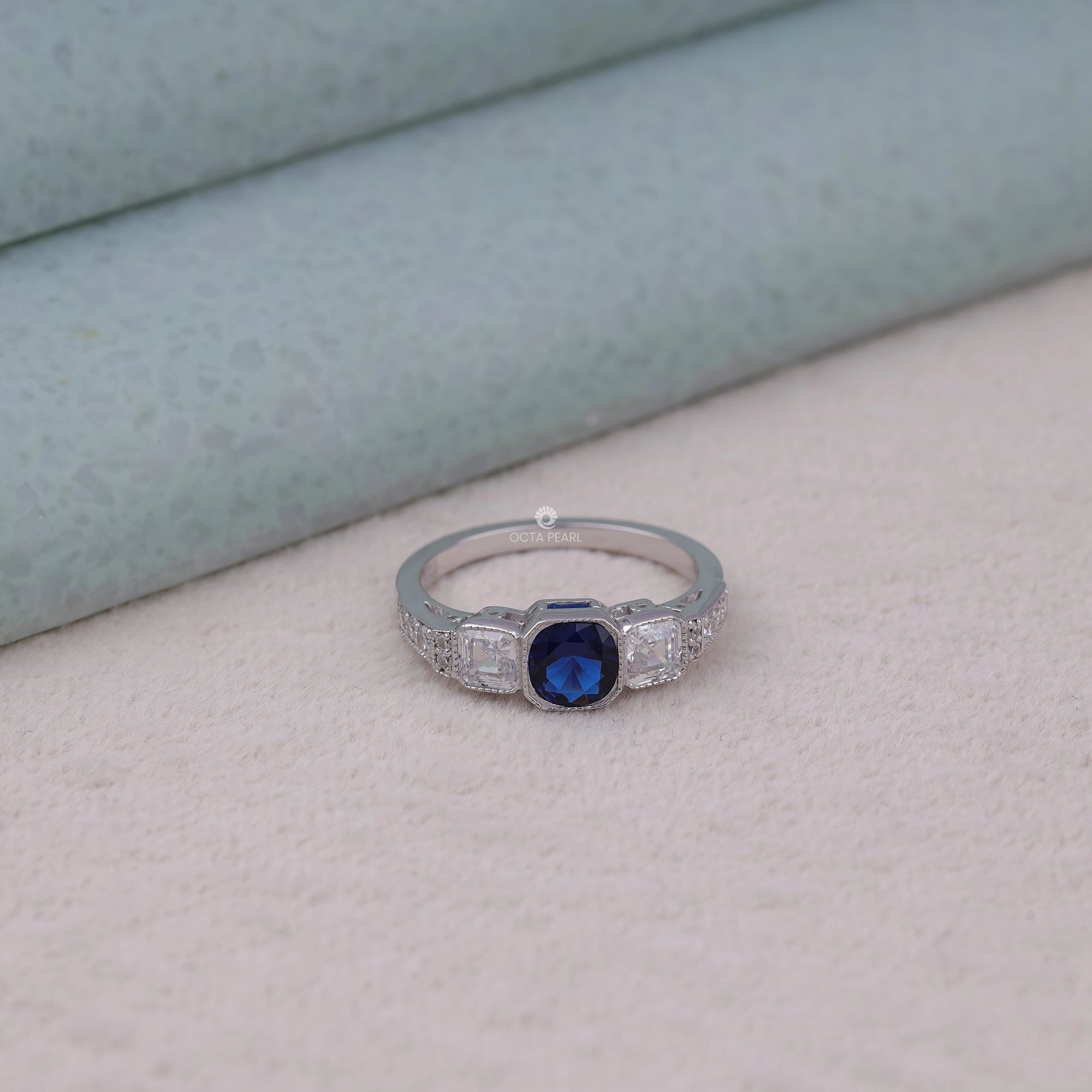 Make a bold statement with this Sapphire Cushion & White Asscher Cut CZ Three Stone Art Deco Vintage Style Ring. Featuring a deep blue cushion-cut sapphire CZ as the centerpiece, flanked by two white asscher-cut CZ stones, this ring embodies the geometric elegance of the Art Deco era. The combination of rich color and precise cuts creates a timeless three-stone design that’s perfect for engagements, anniversaries, or vintage-style fashion. Crafted for those who love diamond-inspired jewelry with a bold, classic aesthetic.
