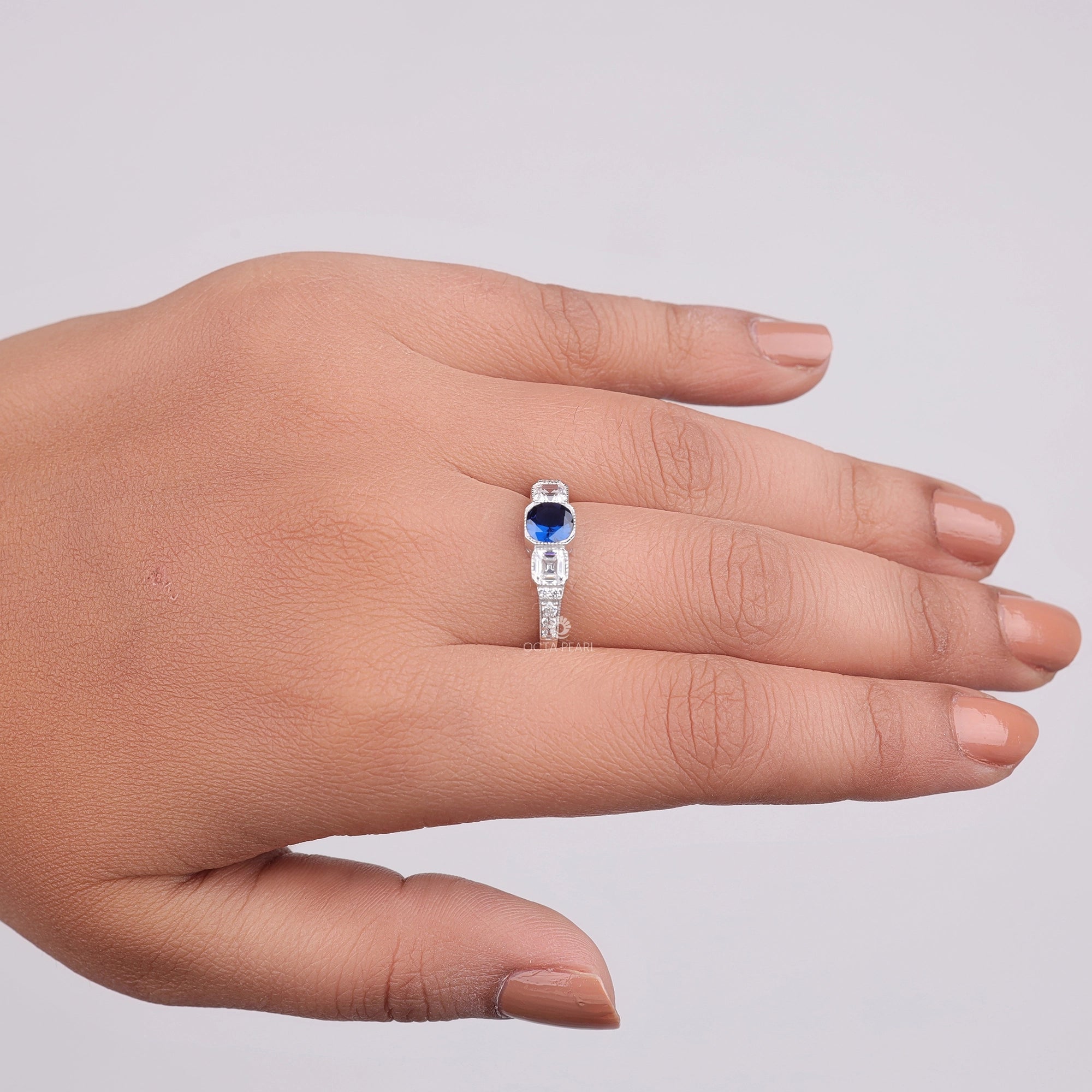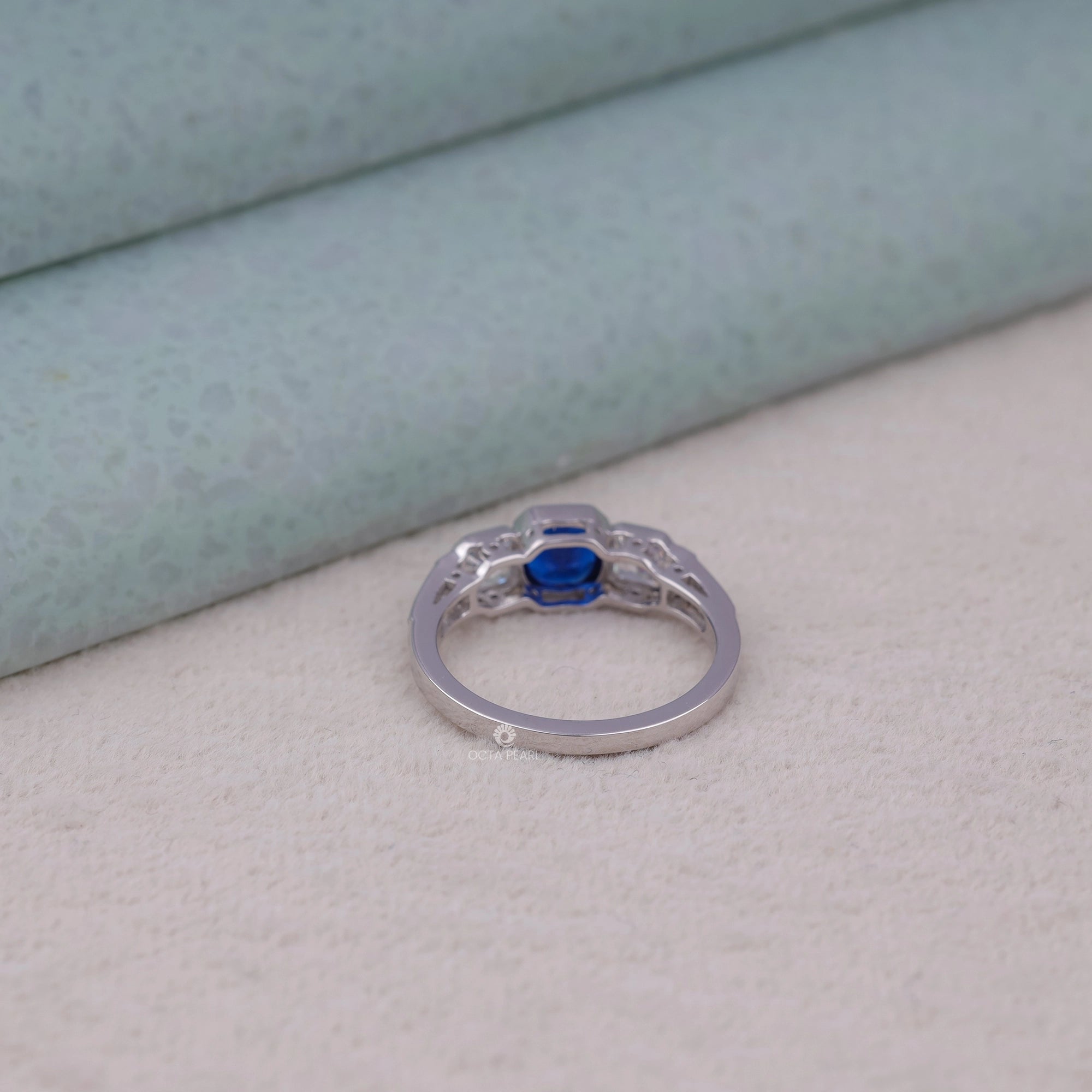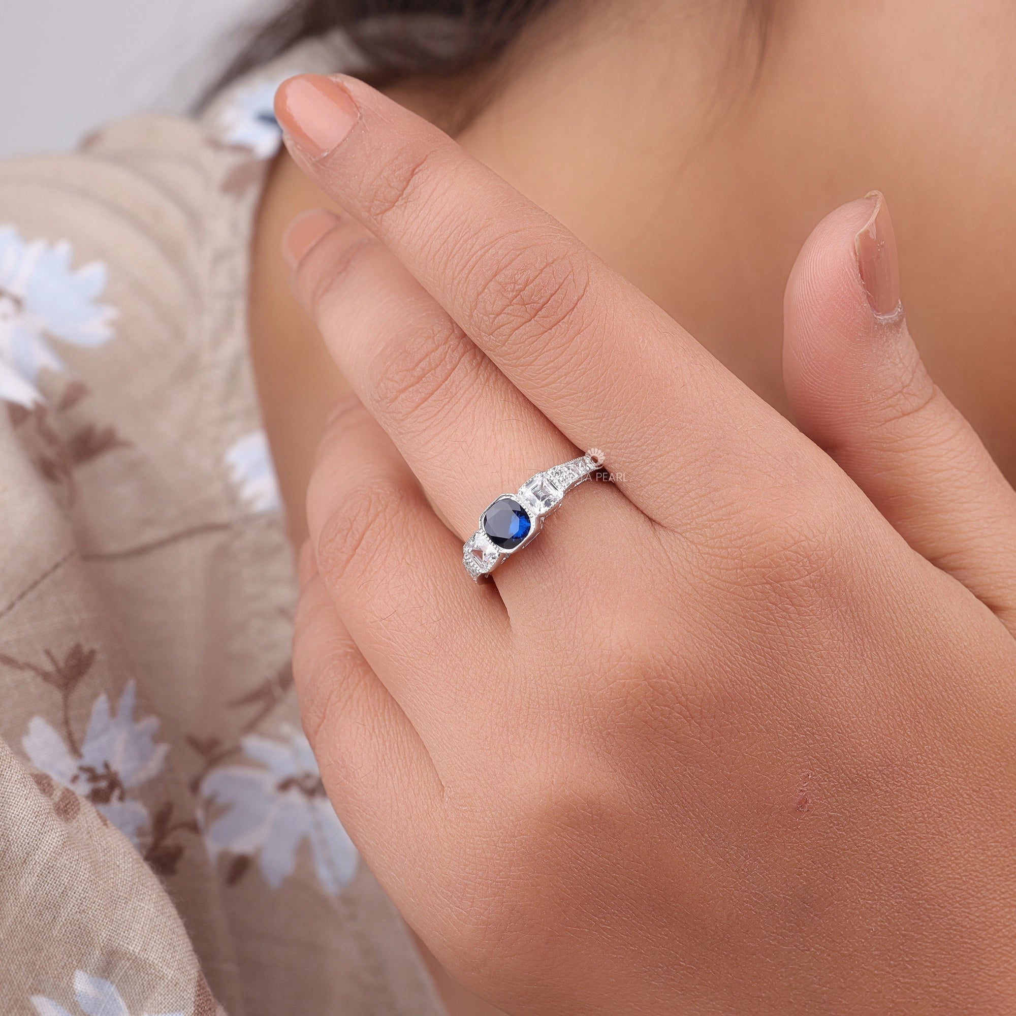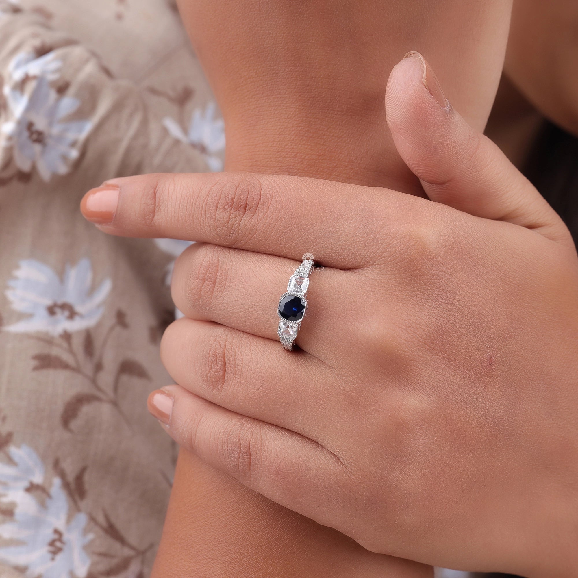 Make a bold statement with this Sapphire Cushion & White Asscher Cut CZ Three Stone Art Deco Vintage Style Ring. Featuring a deep blue cushion-cut sapphire CZ as the centerpiece, flanked by two white asscher-cut CZ stones, this ring embodies the geometric elegance of the Art Deco era. The combination of rich color and precise cuts creates a timeless three-stone design that’s perfect for engagements, anniversaries, or vintage-style fashion. Crafted for those who love diamond-inspired jewelry with a bold, classic aesthetic.
