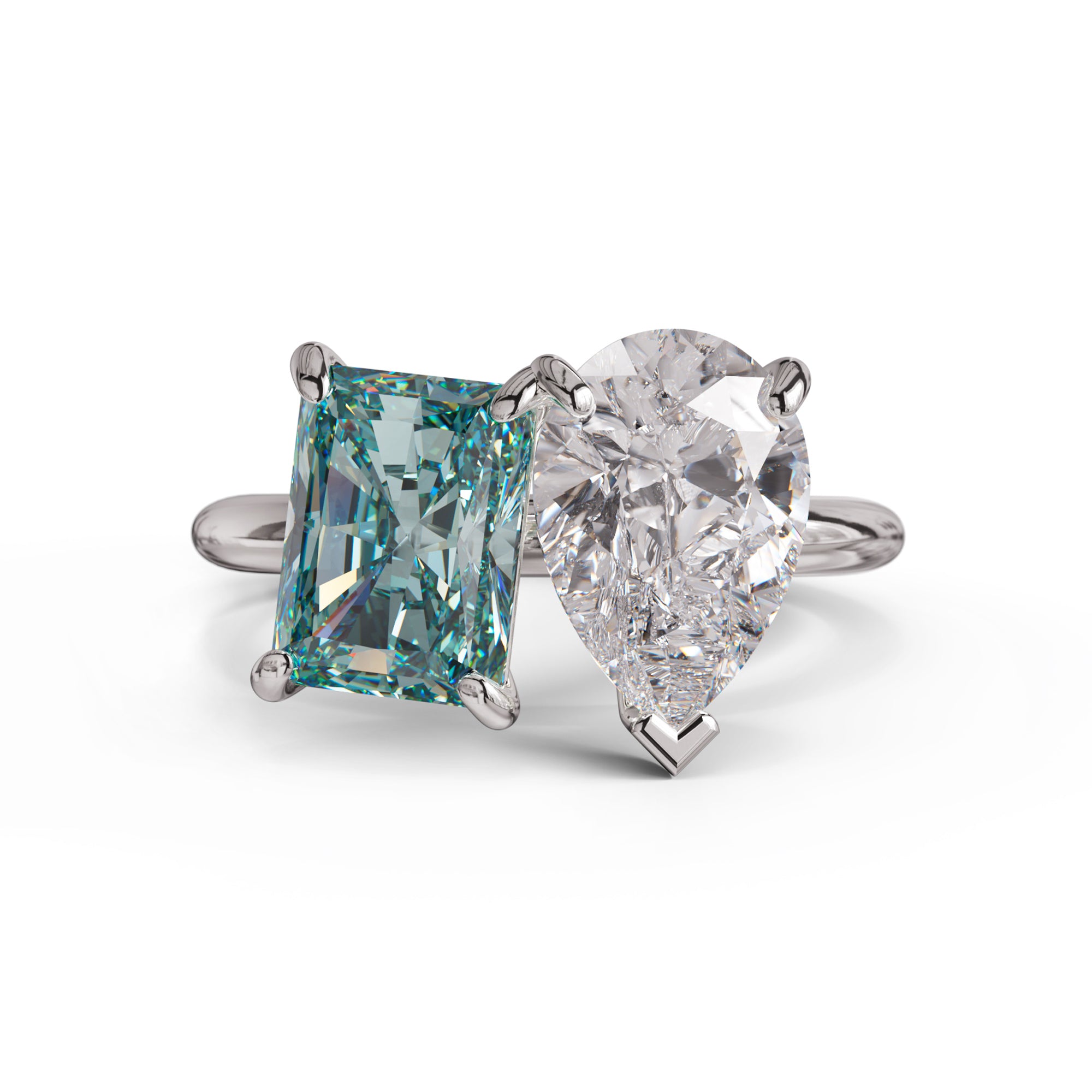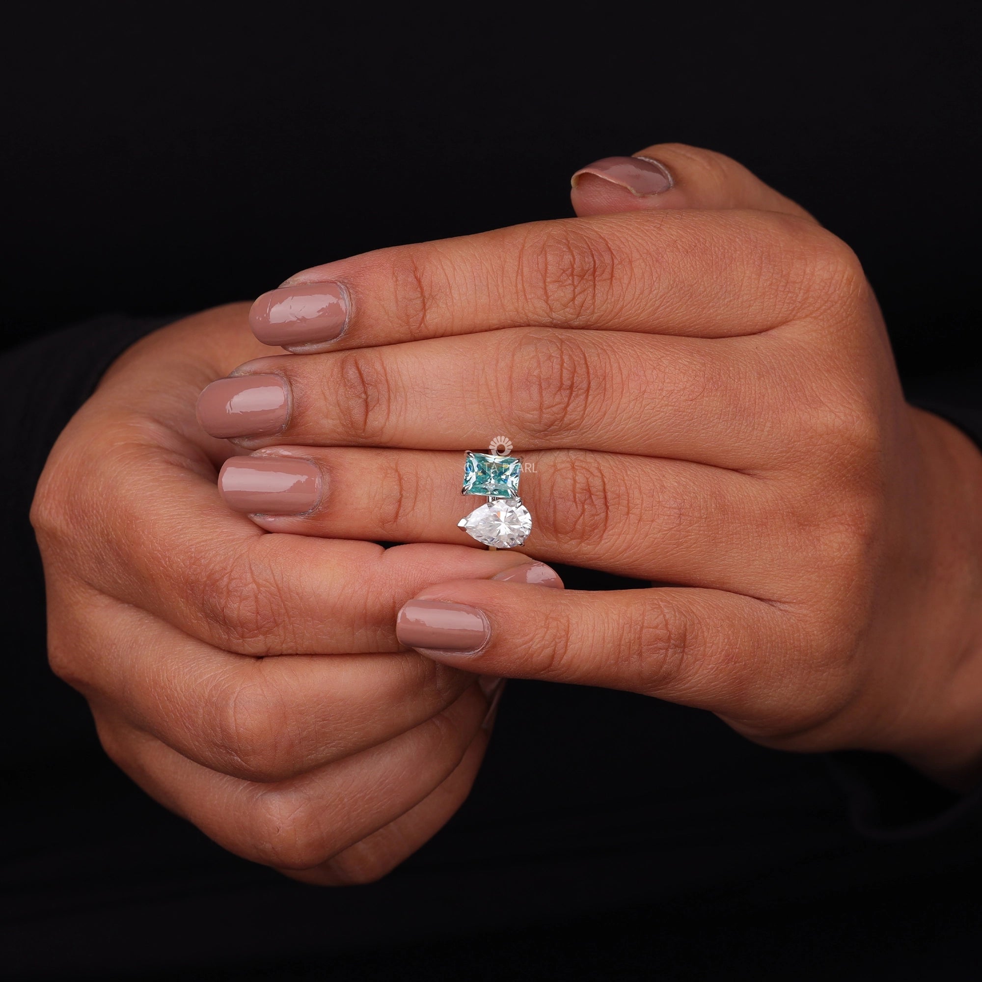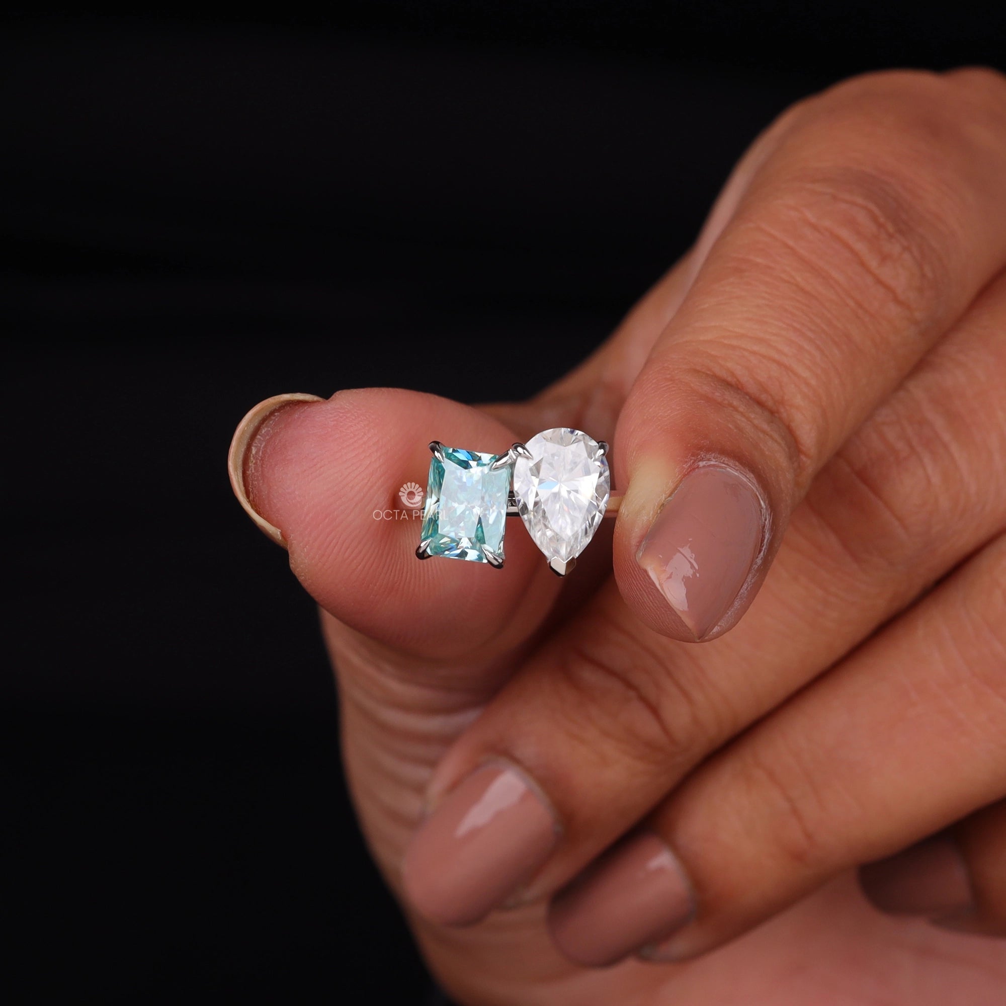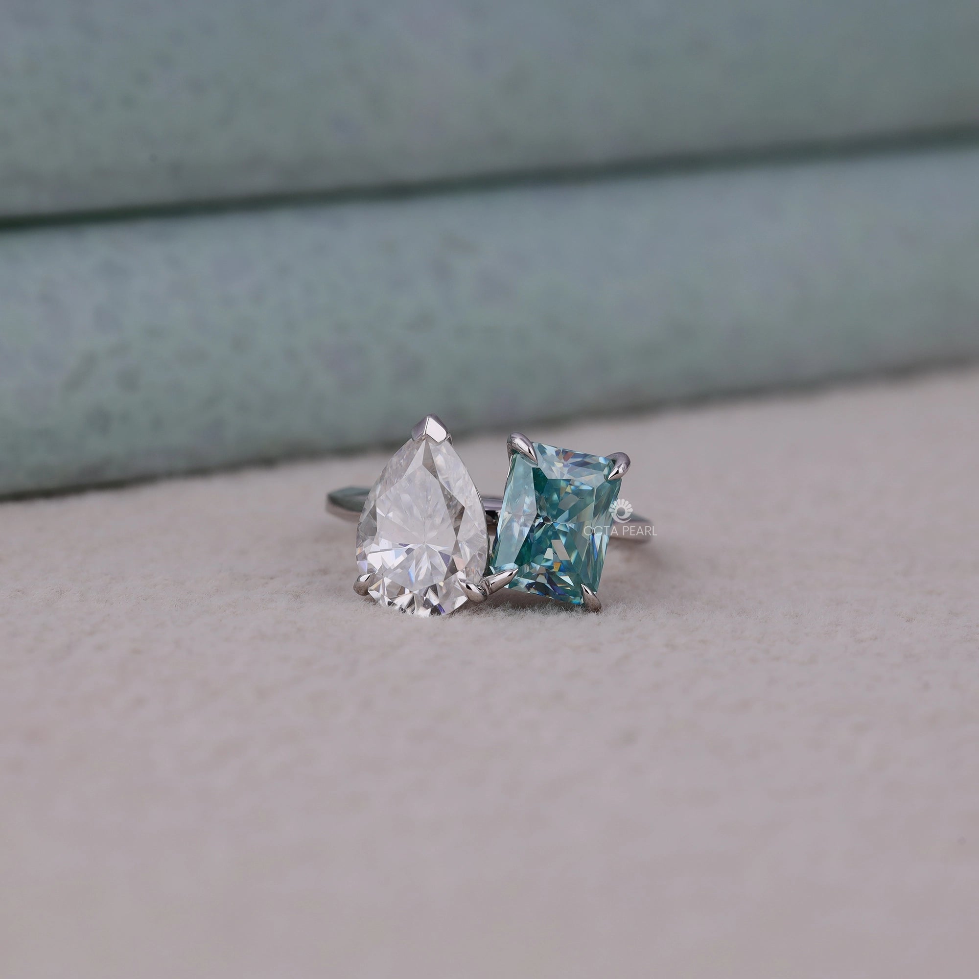 Celebrate your love story with this White Pear & Green Radiant Moissanite Toi Et Moi Engagement Ring, a modern twist on a timeless design. The two-stone style features a brilliant white pear-shaped moissanite paired with a vibrant green radiant cut moissanite, symbolizing the union of two souls. Crafted with precision and eco-friendly stones, this romantic ring makes a meaningful choice for engagements, anniversaries, or unique bridal jewelry. Elegant, colorful, and unforgettable.